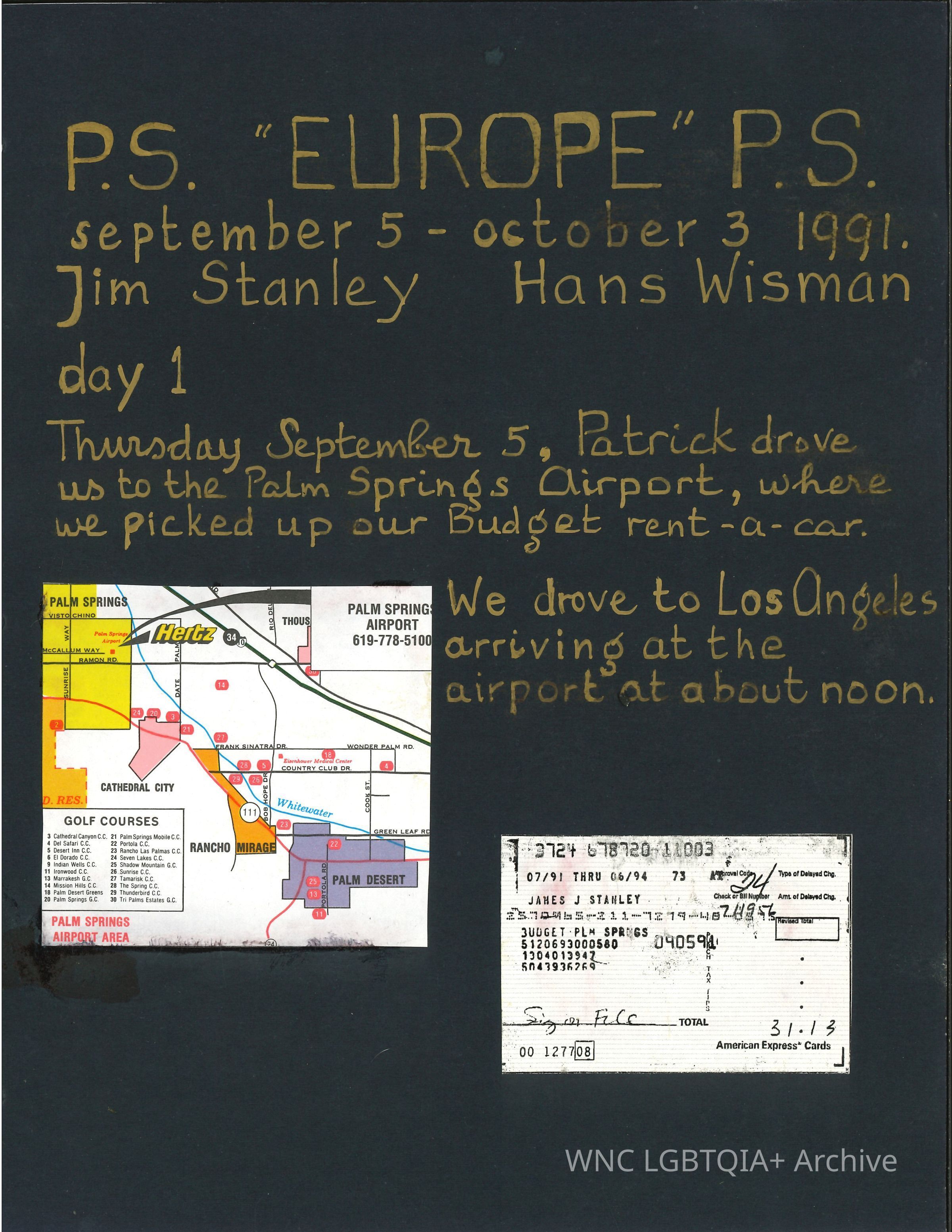 Hans and Jim were long-time life partners who moved from Los Angeles, CA to Bardnardsville, NC. Upon their death the archive inherited this scrapbook collection, which includes roughly 30 scrapbooks. Photographs, ticket stubs, receipts, maps, and a running commentary on the travels fill these pages, all black matte.Collection