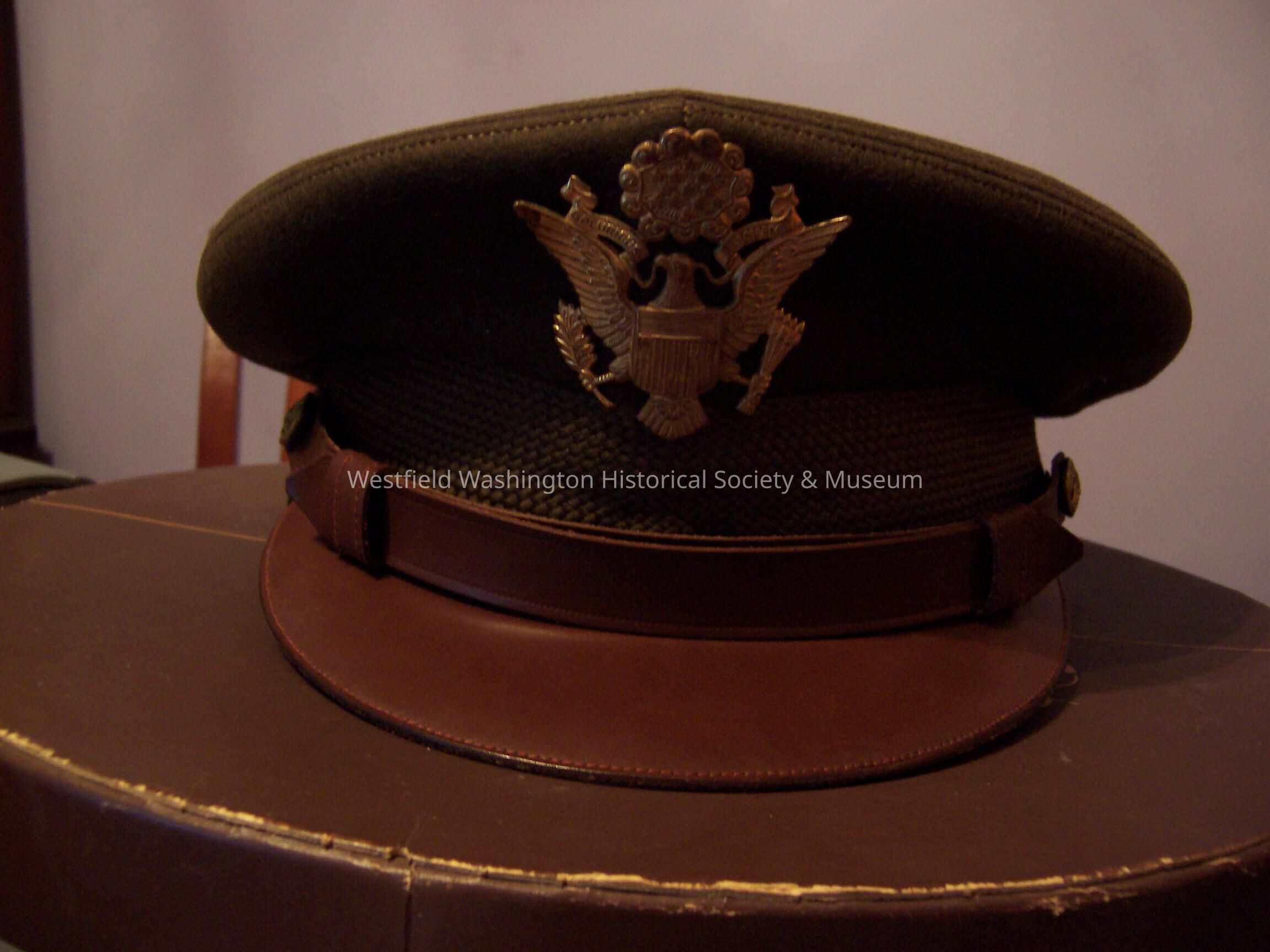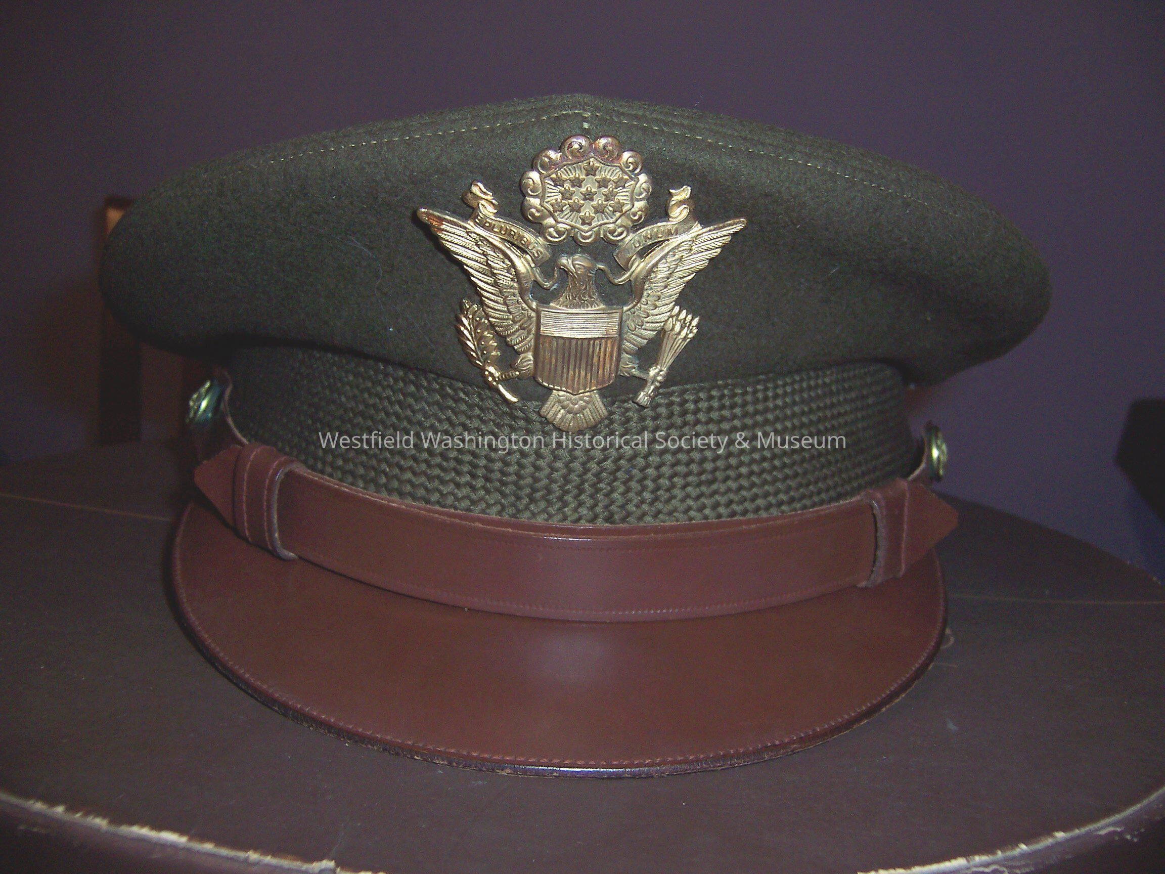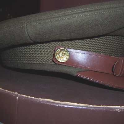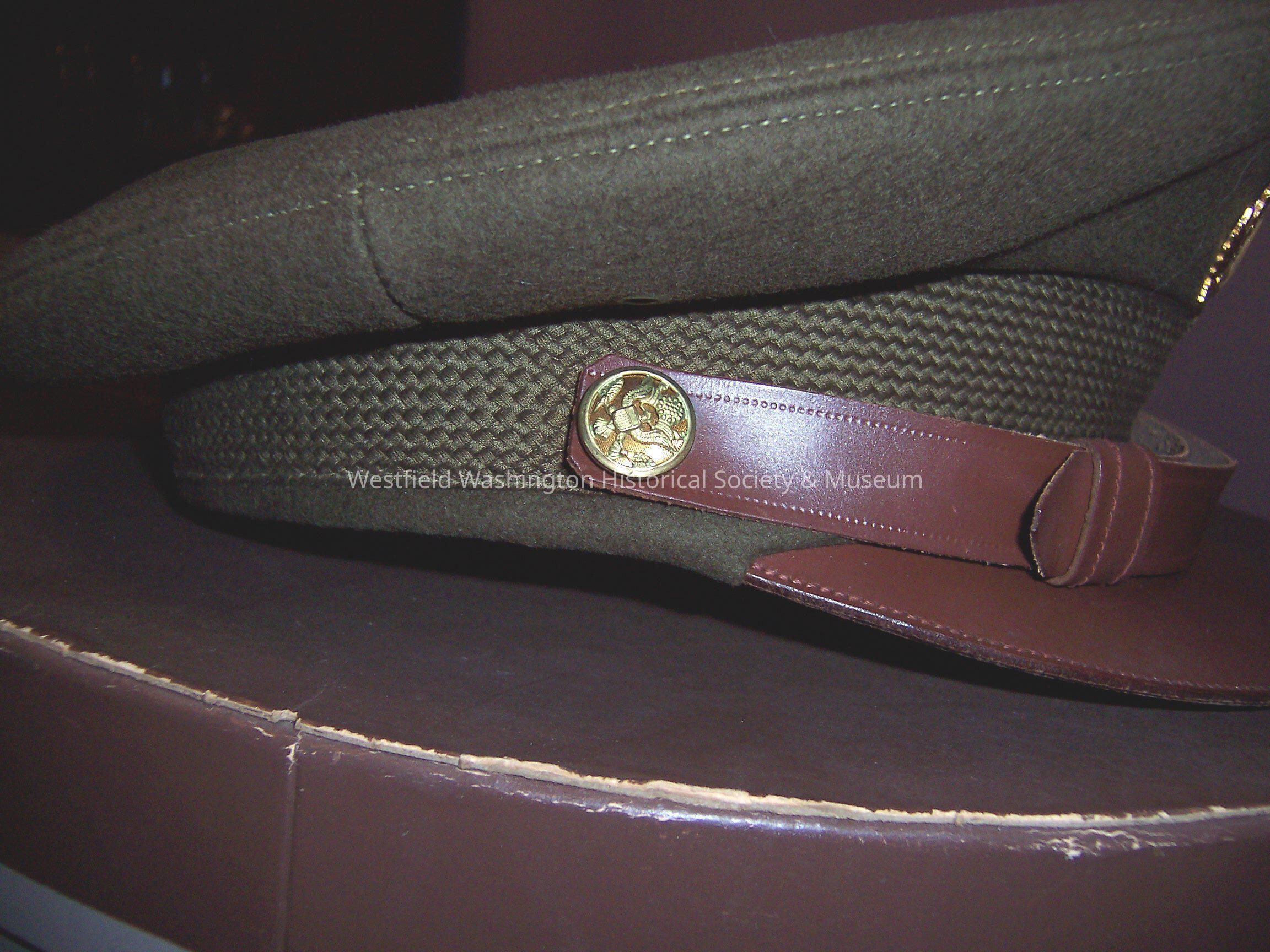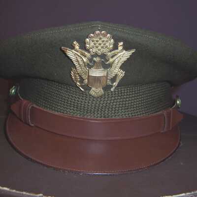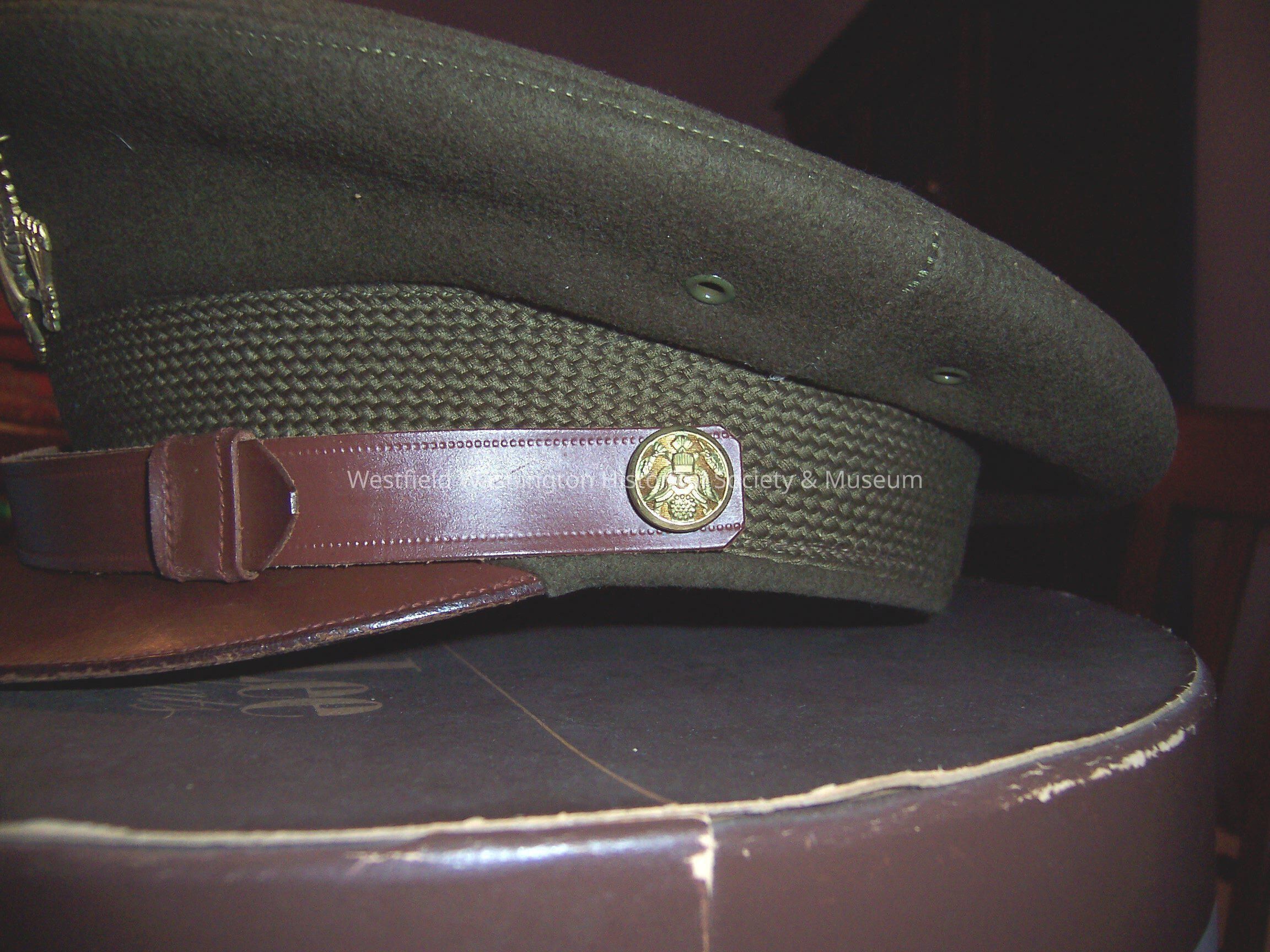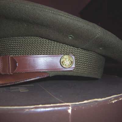 2 Small gilt emblems on sides holding leather strap to adjust cap. Leather Visor.
