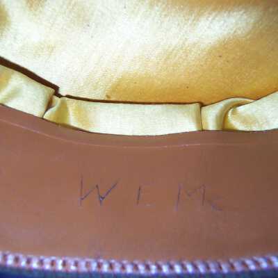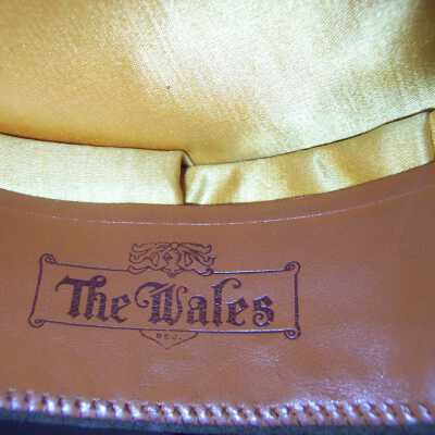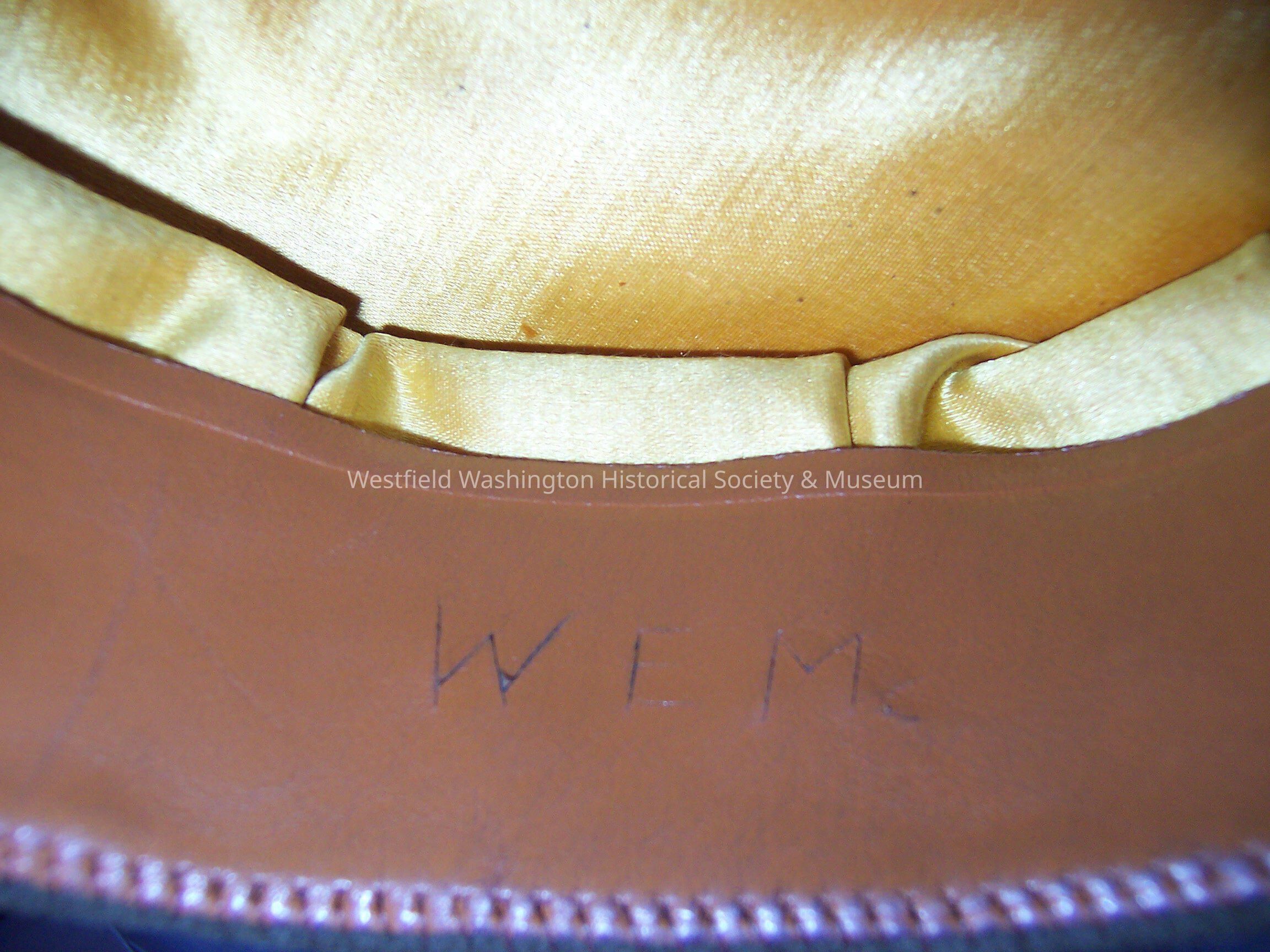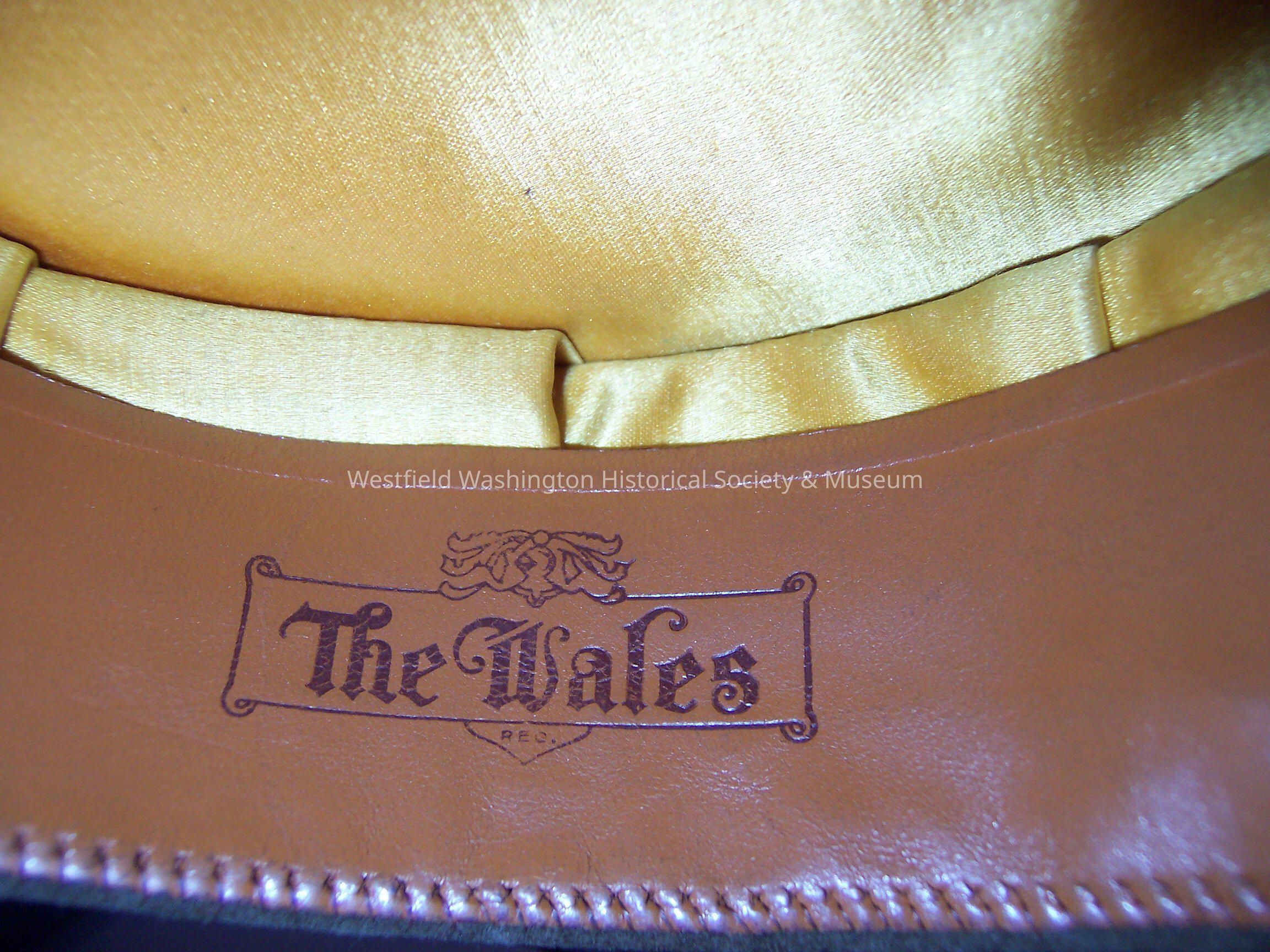 Fabric around rim of cap and top of cap. fabric label. Leather head band with inscription: THE WALES. Also non original inscription: W E Mc (owner)