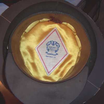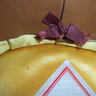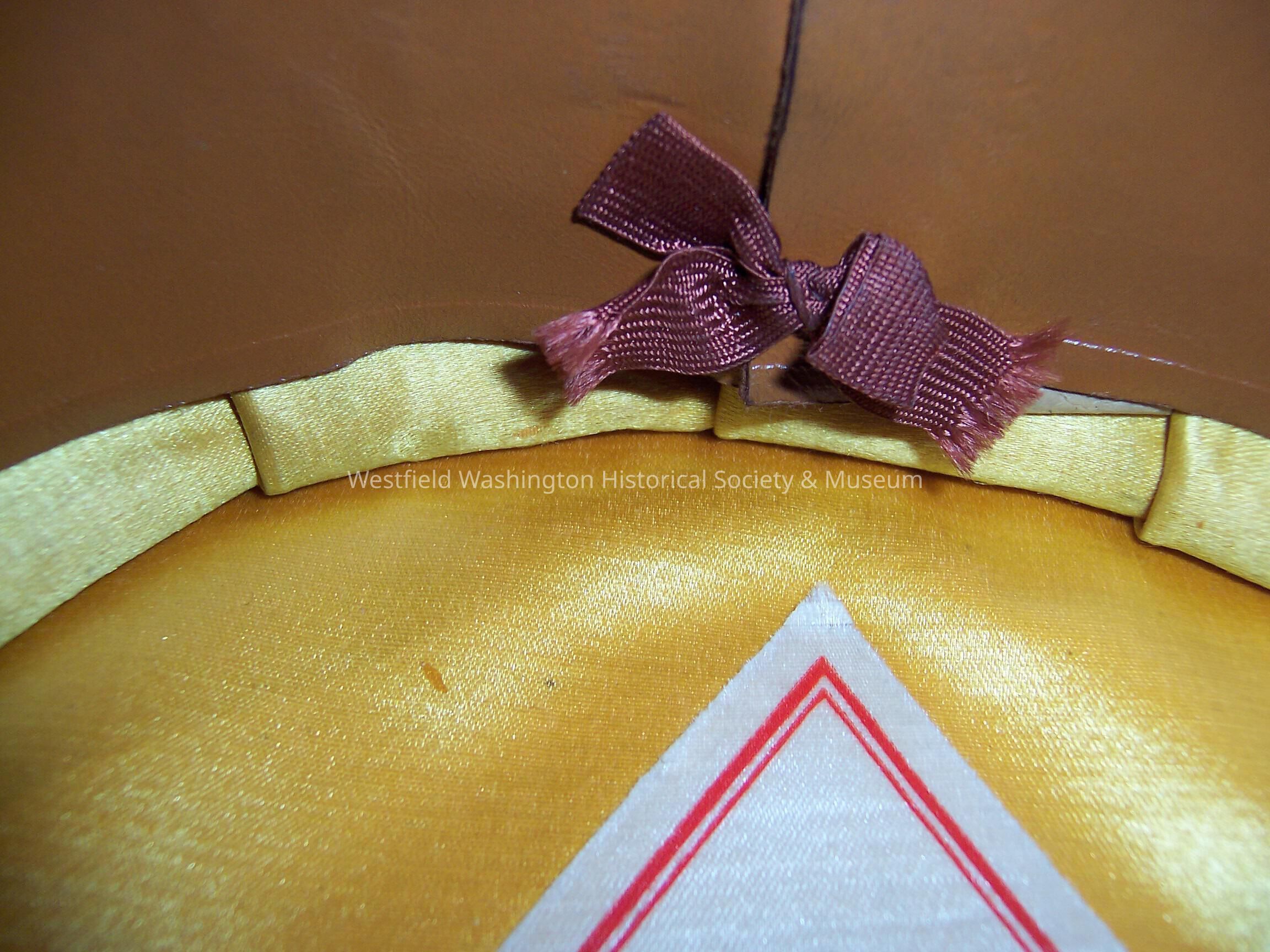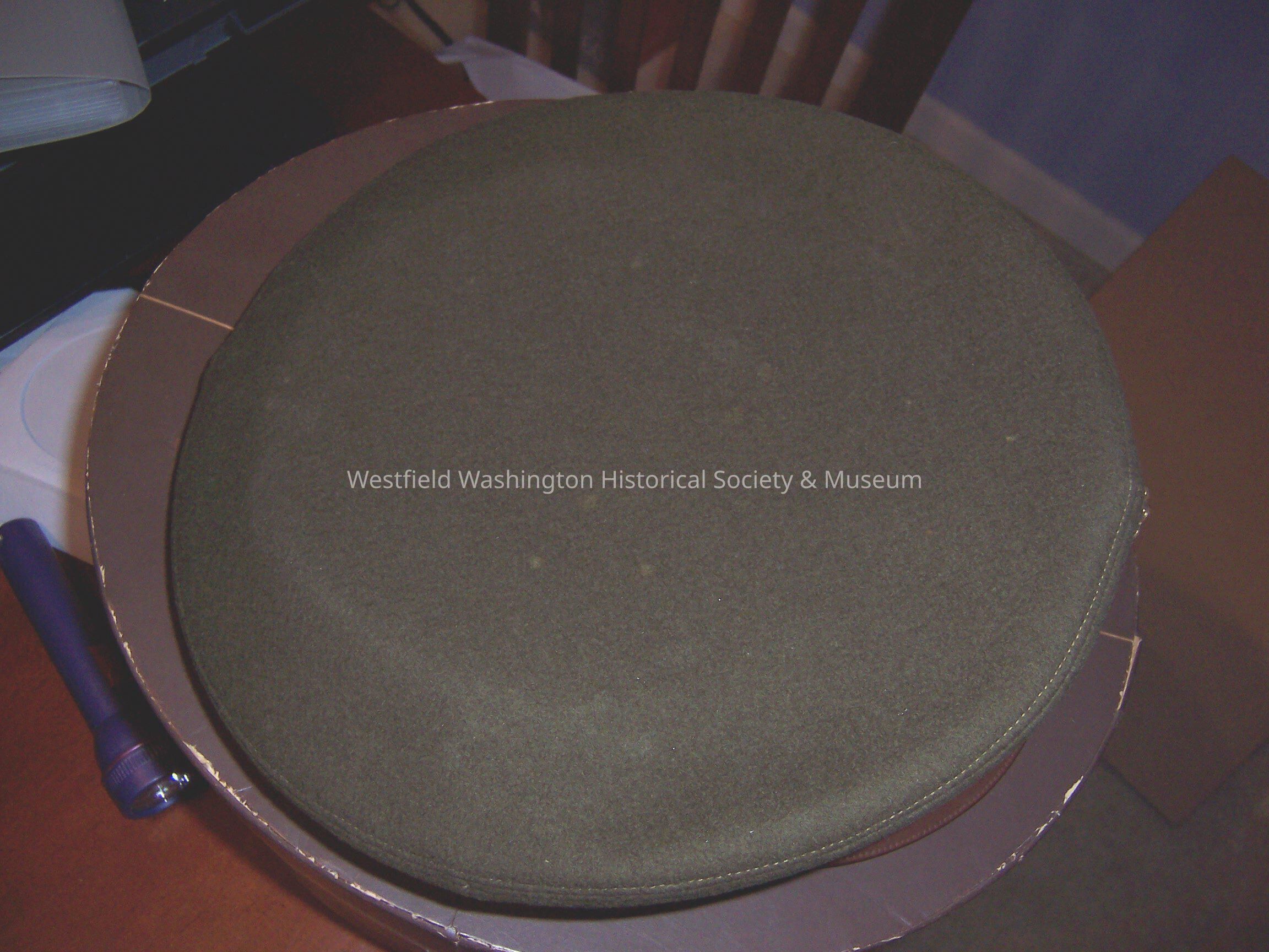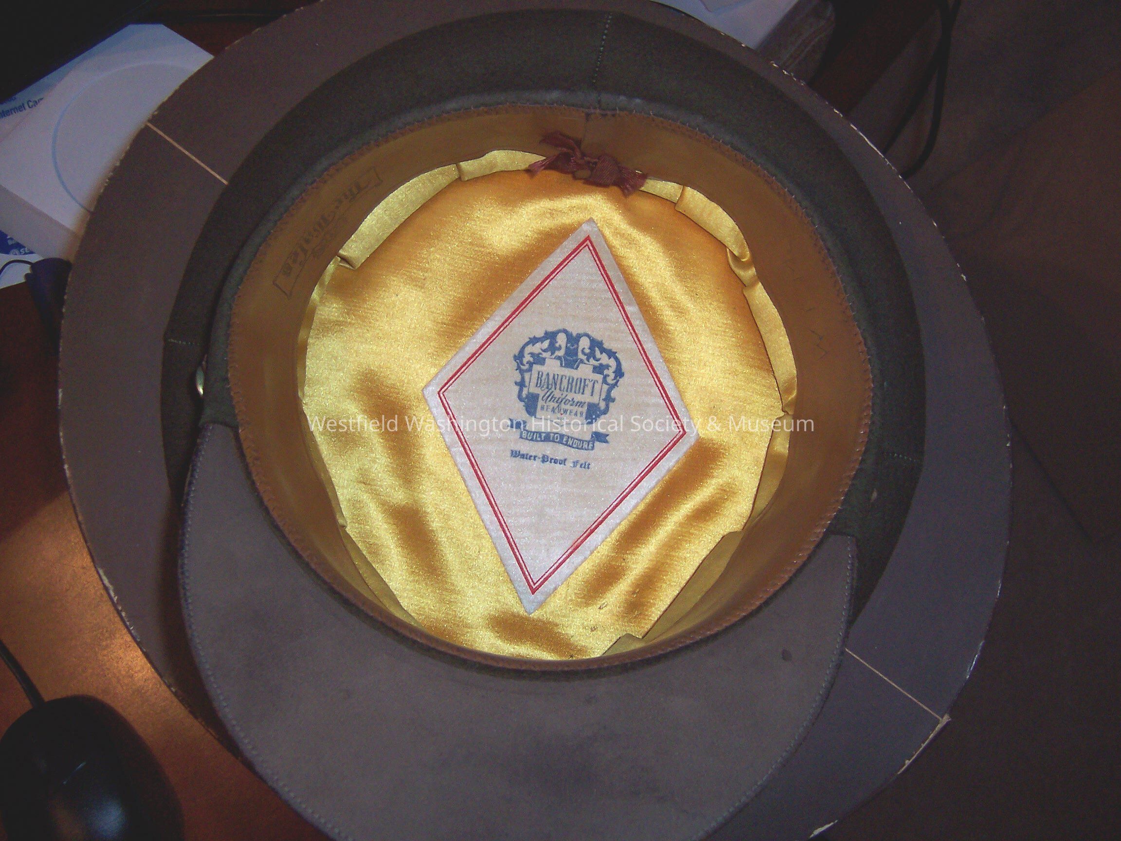 Fabric around rim of cap and top of cap. fabric label. Leather head band with inscription: THE WALES. Also non original inscription: W E Mc (owner)