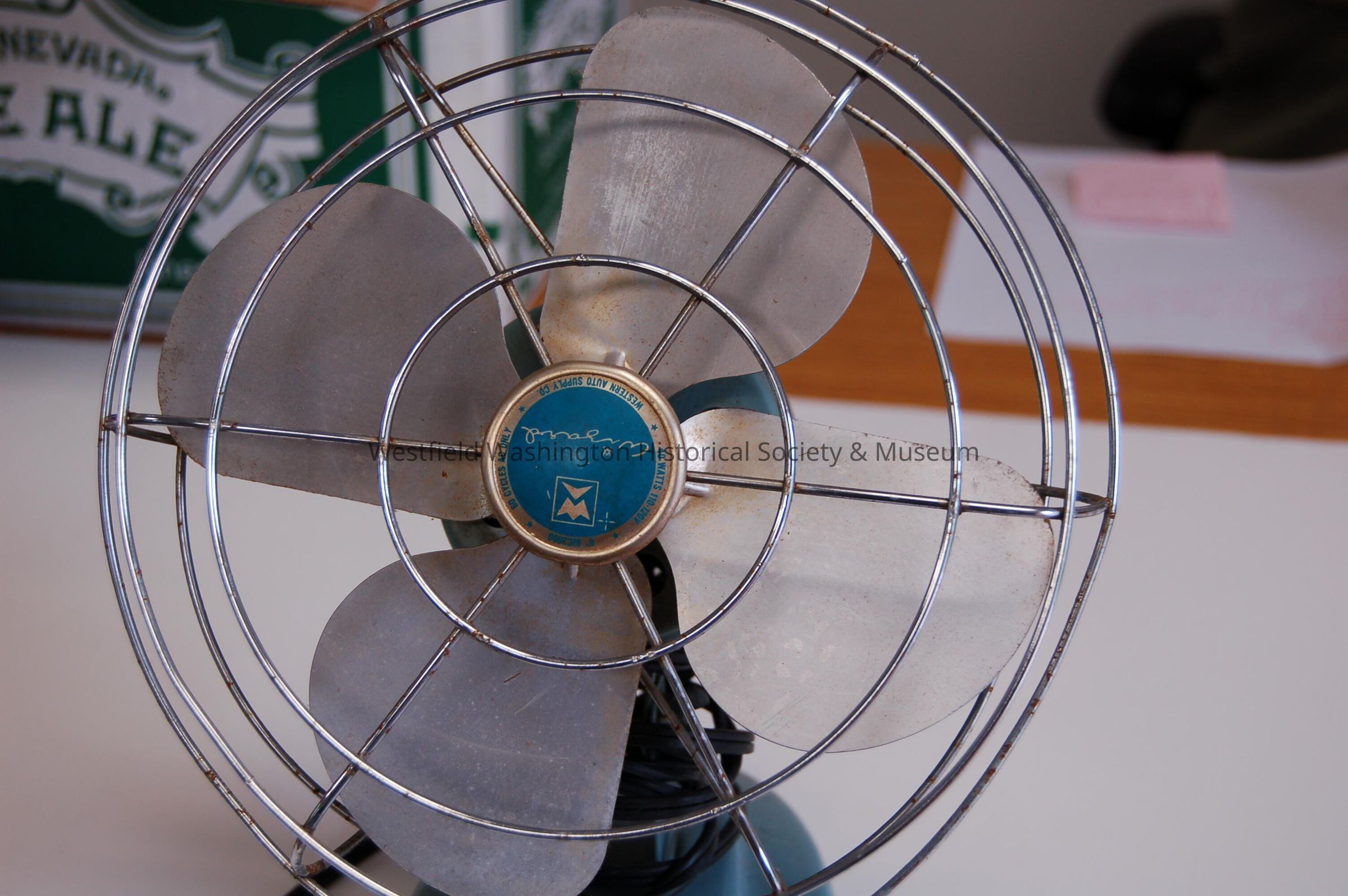 Small, blue Wizard fan with electric cord made by Western Auto Supply Co. 40 Watts 110-120V 8IN SJC2000 60 Cycles AC only Manufactured in 1940s-1950s According to Diana Peyton came from Dell Burtners Airstream.