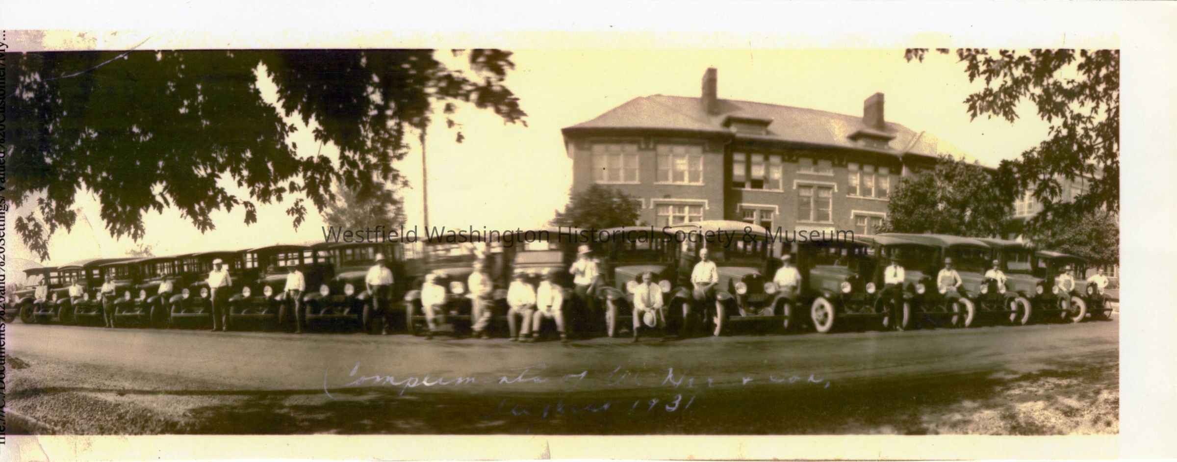 A black and white photograph of 20 men sitting and standing in front of 16 school buses in front of the old Westfield School building on W. Main Street in Westfield in 1931.