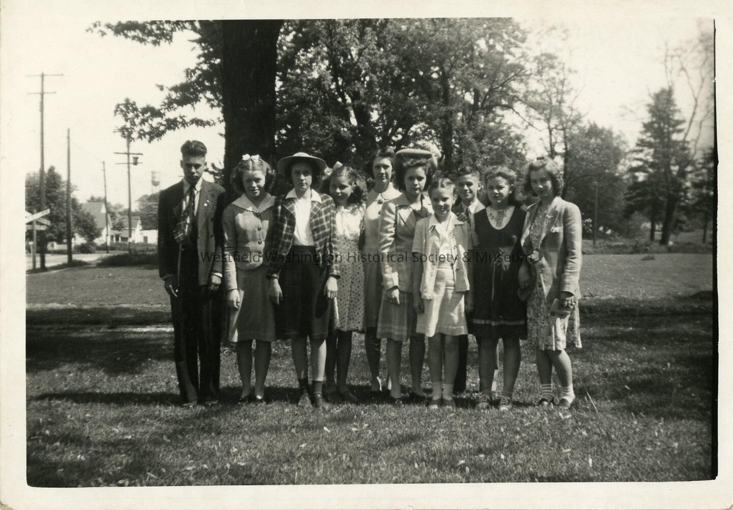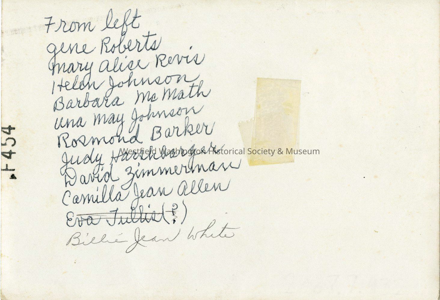 A black and white photograph of a group of Bible School Students standing outdoors in front of some trees, with a railroad crossing (possibly by the Midland Railway Railroad) appearing at the left and a water tower visible in the background. The information on the note indicates that this picture may have been taken just outside of the Union Bible Seminary in Westfield, Indiana. Their teacher is notes as Charlotte Scott. The following students are identified from left to right: Gene Roberts, Mary Alice Revis, Helen Johnson, Barbara McMath, Una Mae Johnson, Rosamond Barker, Judy Harshbarger, David Zimmerman, Camilla Jean Allen, and Billie Jean White.
