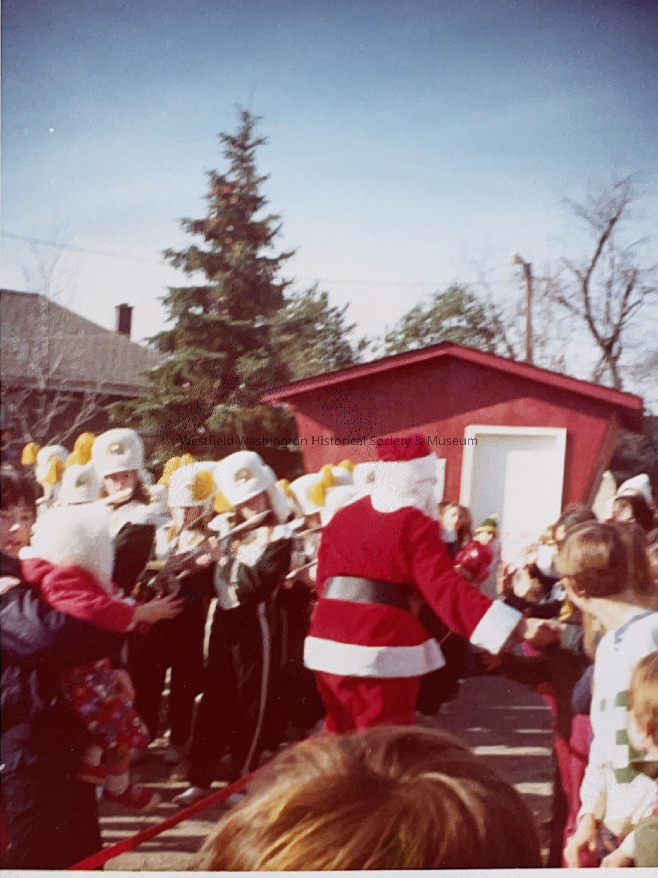 A color photograph of Santa Claus walking on a path toward the small red house, flanked by Westfield Band members at the left and other people at the right and in the foreground. This photo was probably taken after a Christmas parade, which went from Westfield Middle School on Main Street to the intersection of Main and Union Streets, sometime in December 1972.