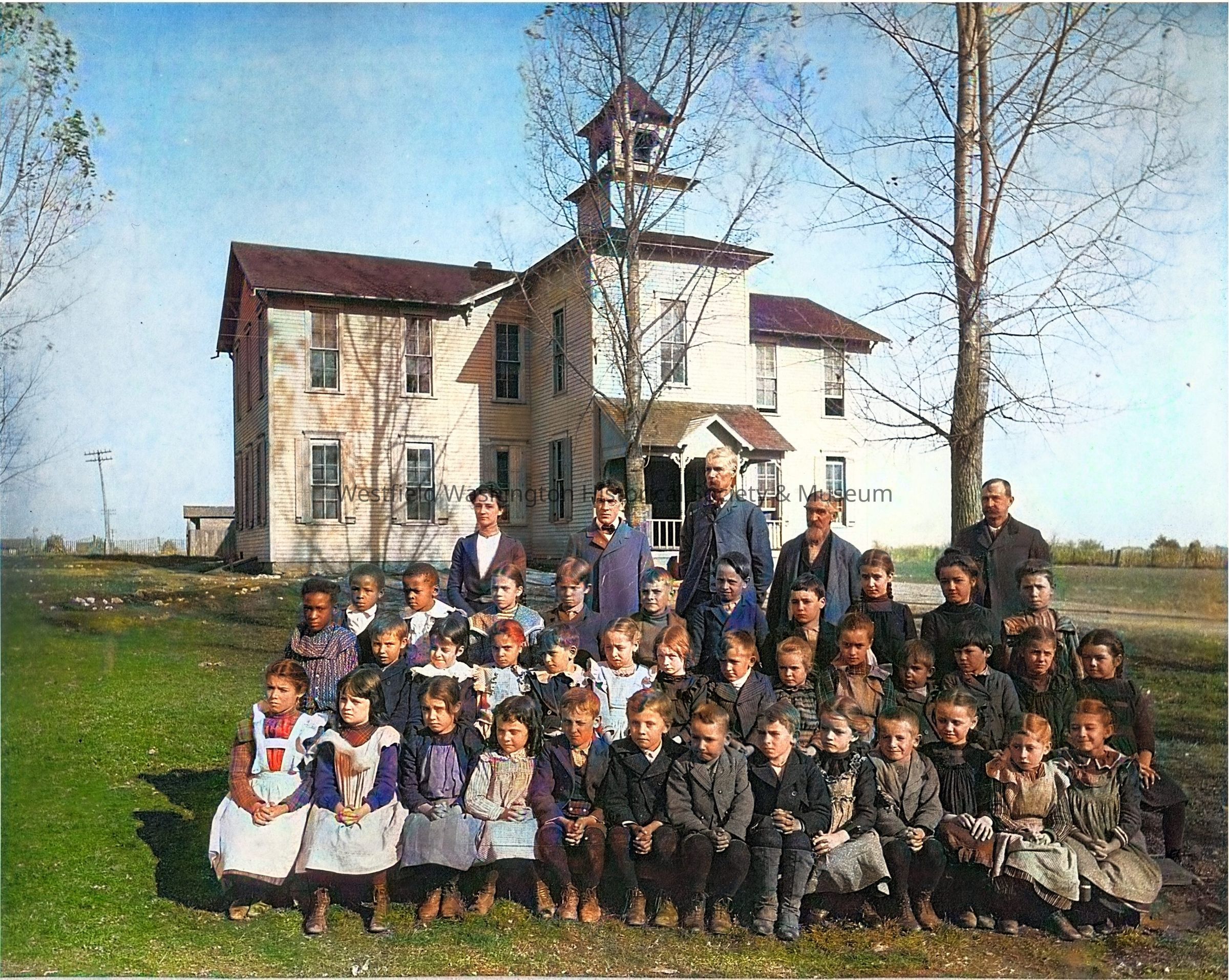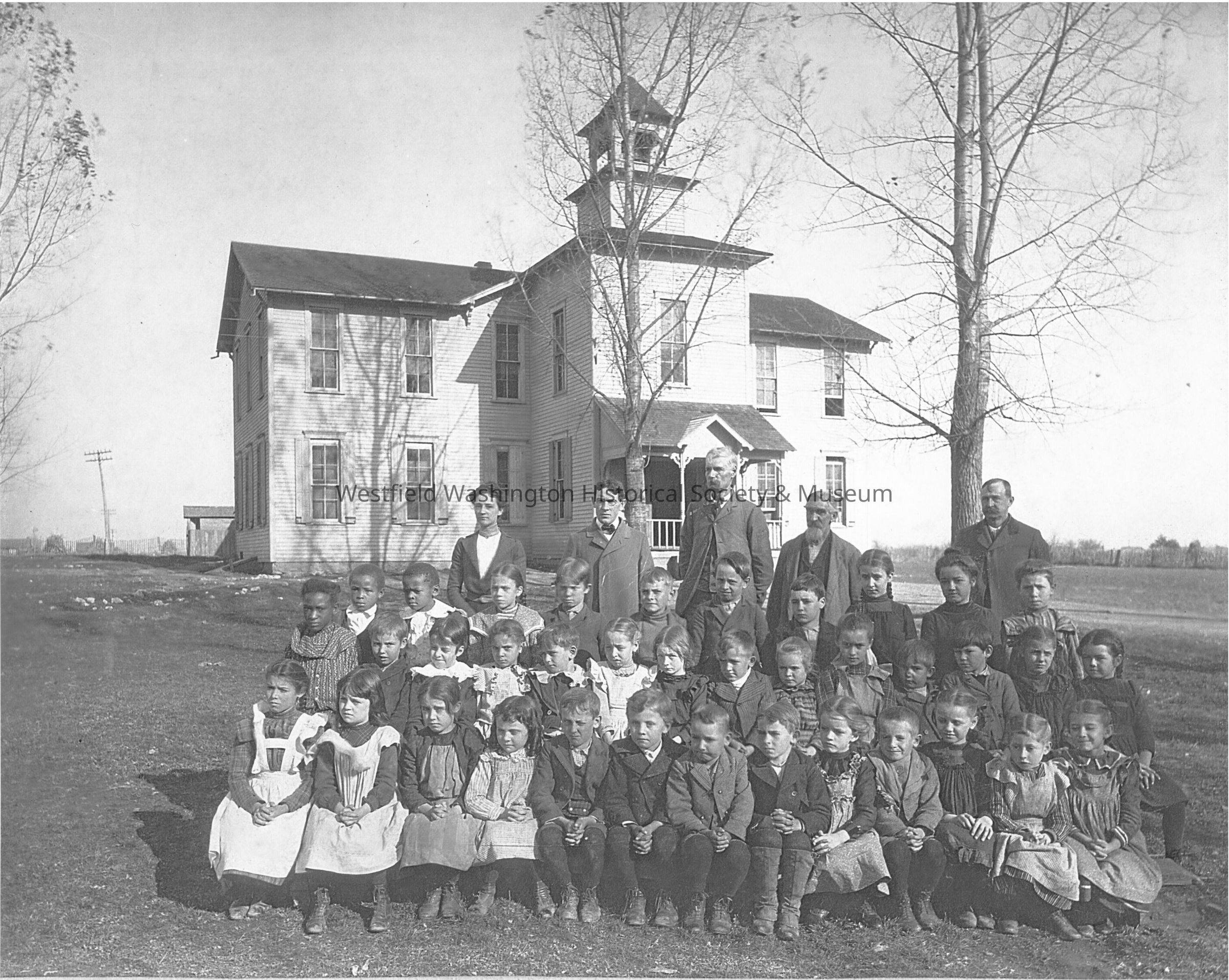 Tall man in middle is Eli Stalker Township Trustee, to the right Andrew J Fryberger (at that time Truant Officer) and E.A. Hutchens (County Superintendent)