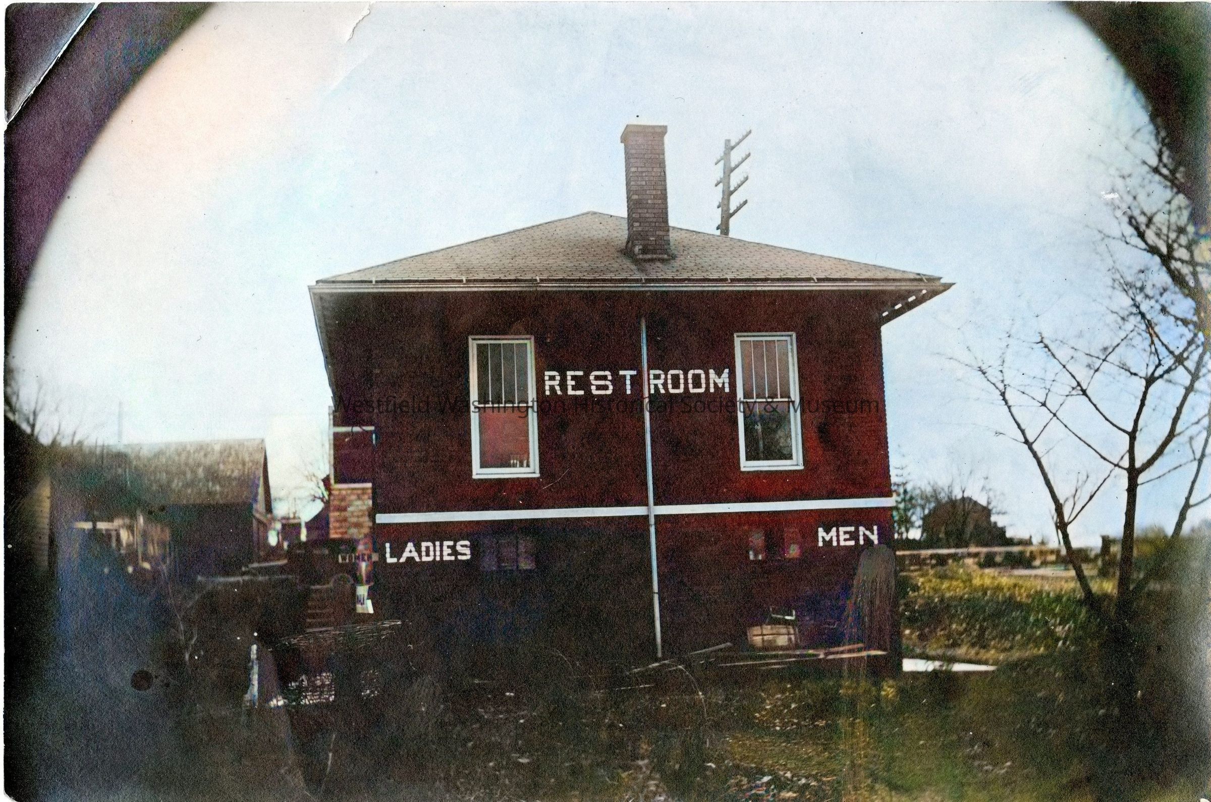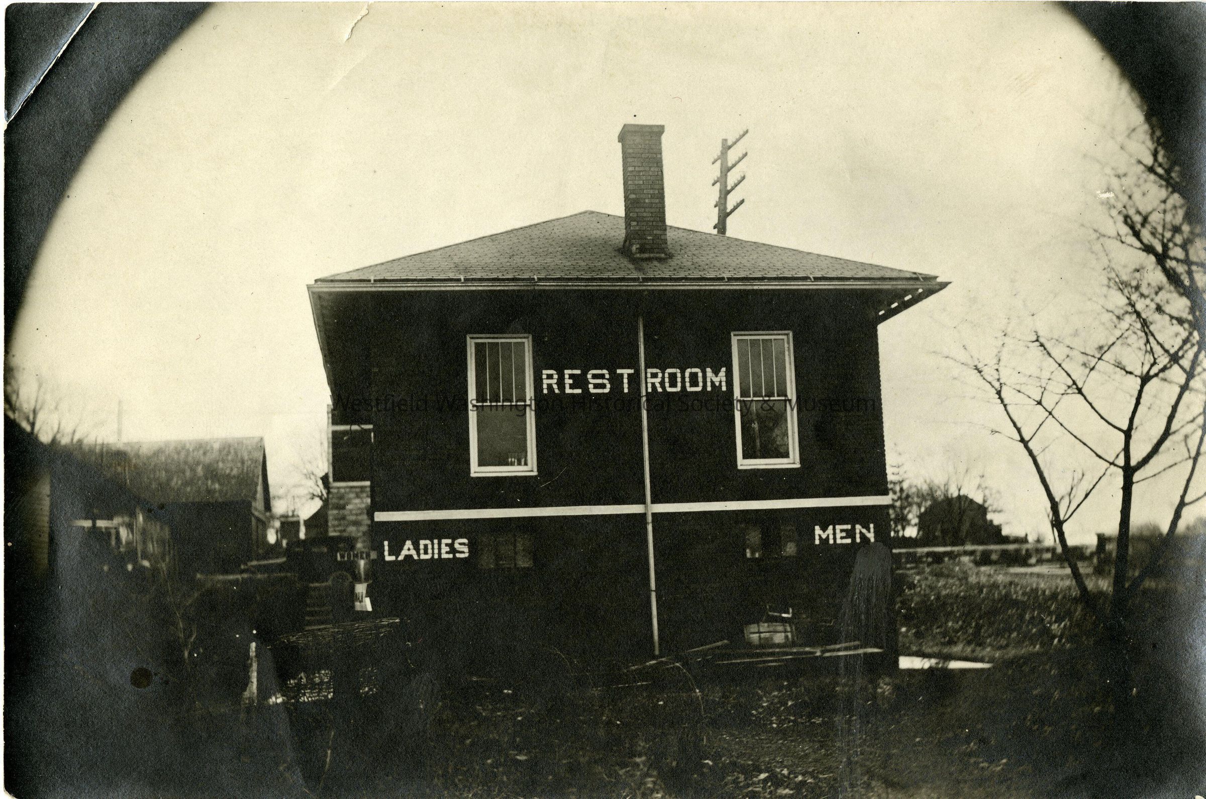 A black and white photograph of the rear part of the Westfield City Building and Fire Station at South Union Street. The rear of the building has a chimney on top, two windows of the first floor, and two restrooms at the lower floor. The room at the left is labelled for women, while the room at the right is labelled for men.Collection