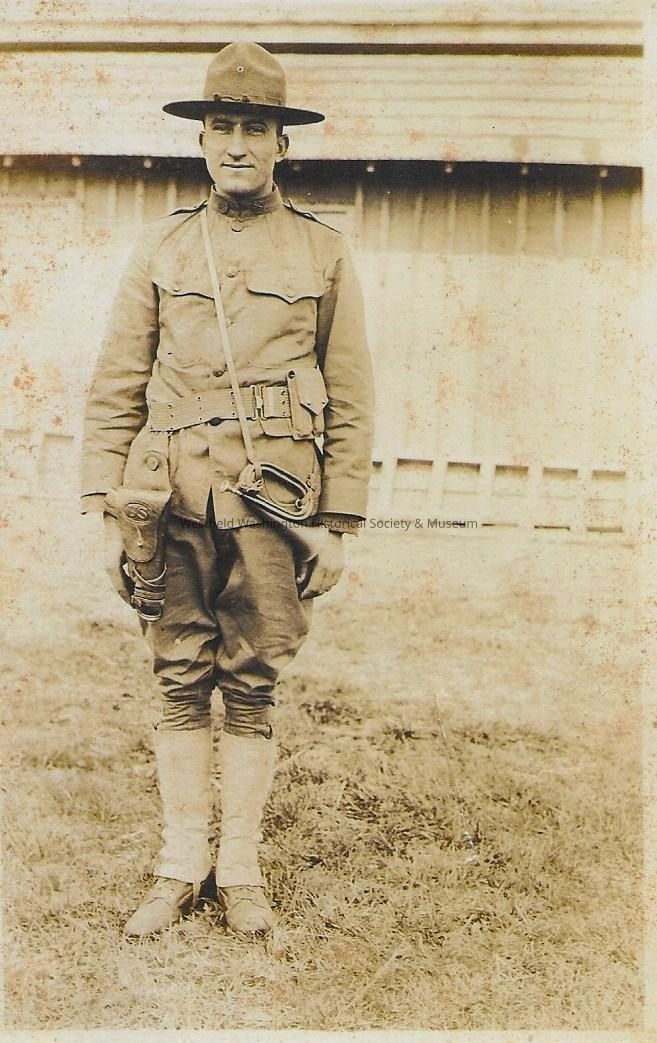The sepia-toned image depicts a soldier standing outdoors on grass, dressed in early 20th-century military attire typical of World War I, including a wide-brimmed hat, belted uniform jacket, and tall lace-up boots. He carries a sidearm in a holster on his left thigh, with a leather strap crossing his chest. His expression is stern yet relaxed, and he stands in front of a wooden structure, likely a barracks or similar building.