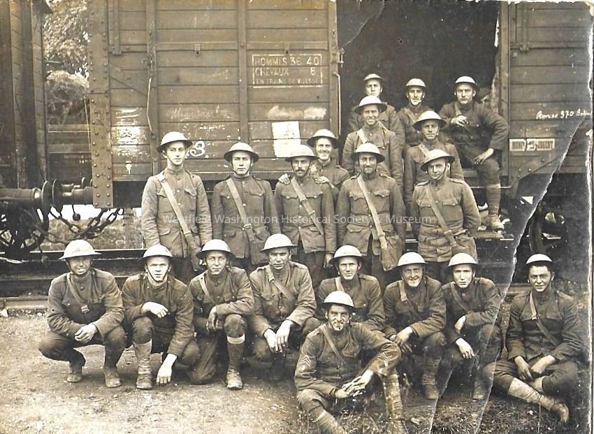 Clarence Davis and a group of other World War 1 soldiers in France. According to the railway car at least, it looks like a French sign on the door.Acquisition