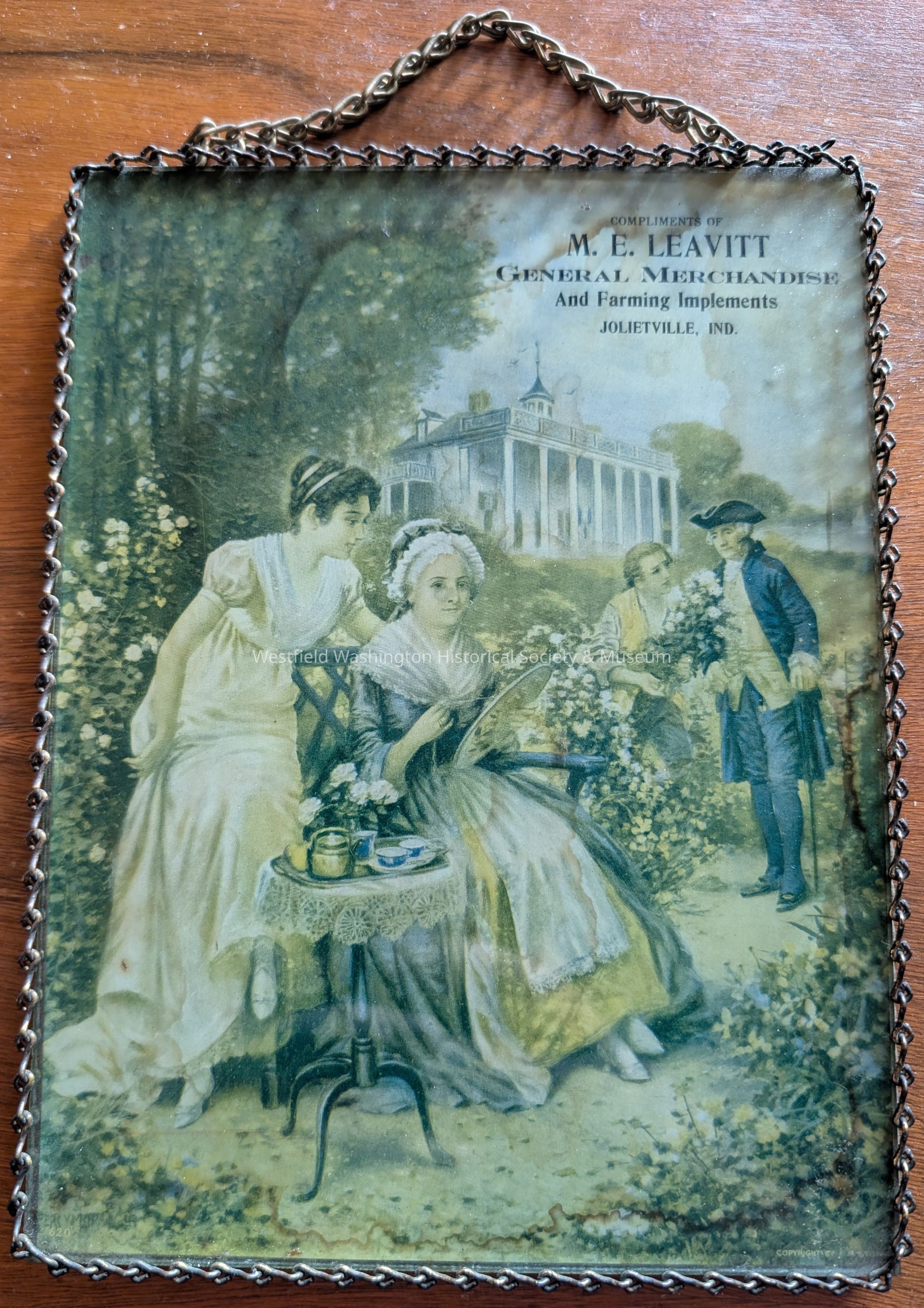 The text is printed on a drawing of Mt. Vernon with two white women and two white men dressed in late 1700s clothing.