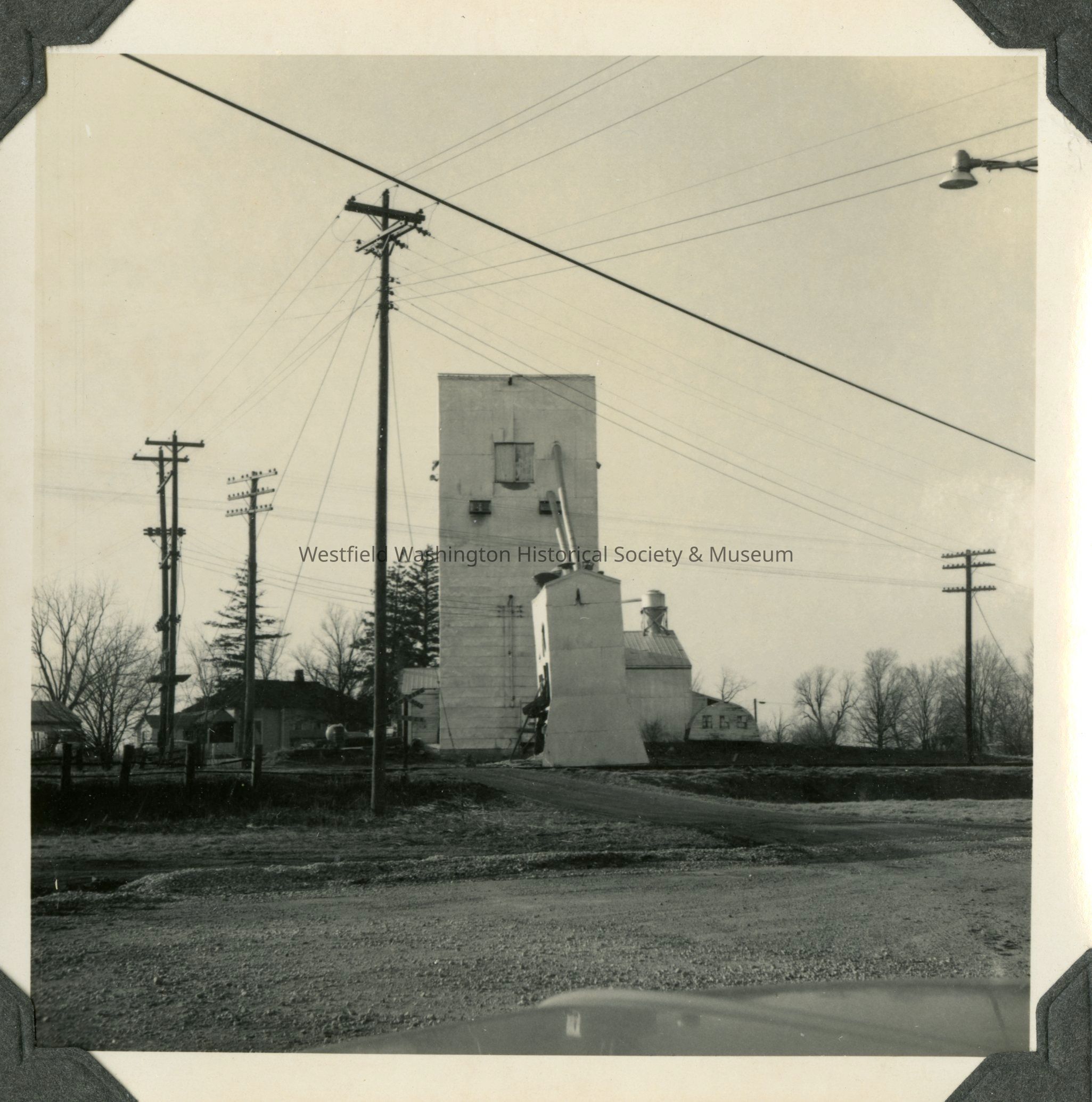 A black and white photograph of the Goodrich Grain Elevator, located by the west side of the Monon Railroad tracks north of the Central Indiana (Midland) Railway tracks and south of W. Main Street (State Road 32), in Westfield in 1967. This picture is looking west from Elm Street across the Monon Railroad tracks. This location is numbered 23 on the 1967 time capsule list and maps (see record 2025.19.1).