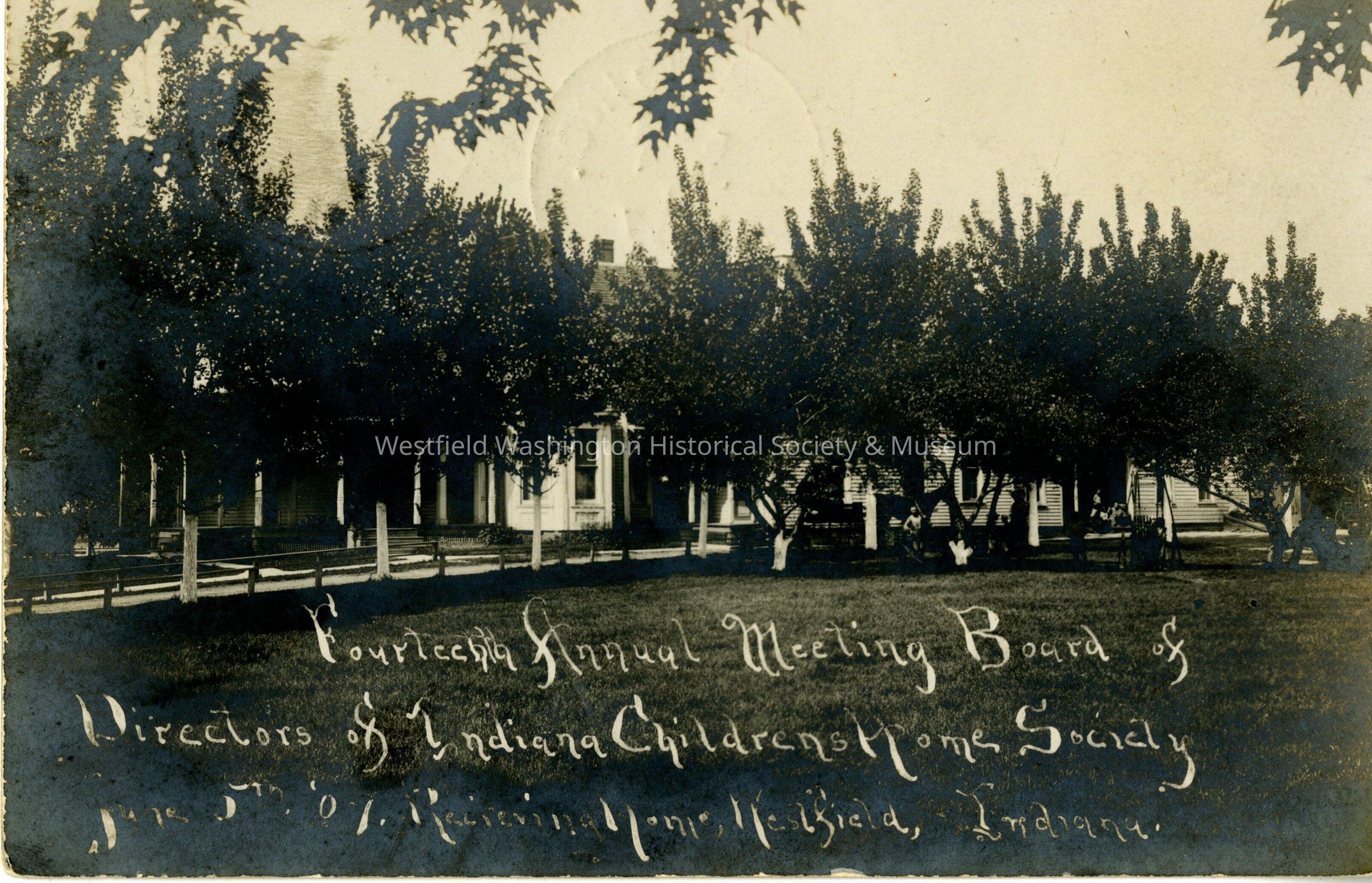 Postcard with a black and white picture of the Indiana Receiving Home in Westfield, Indiana. The front of the postcard says "Fourteenth Annual Meeting Board of Directors of Indiana Children's Home Society... Receiving Home, Westfield, Indiana."