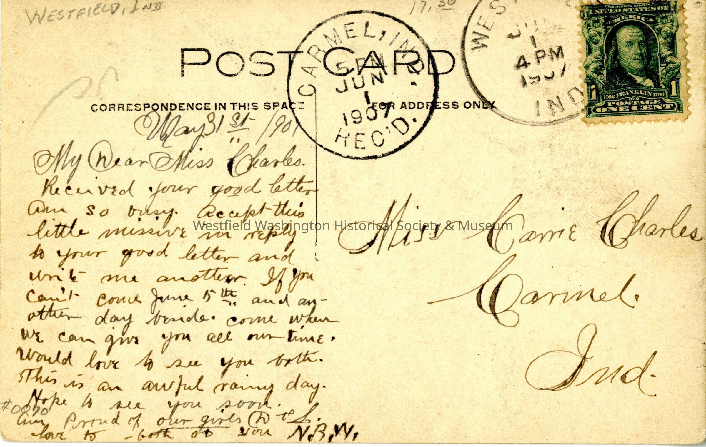 The back of the postcard says "May 31st 1907 My near Miss Charles. Received your good letter am so busy accept this little... in reply to your good letter and write me another. If you can't come June 15th and any other day... come when we can give you all our time Would love to see you both. This is an awful rainy day. Hope to see you soon. Am proud of both our girls. Love to see both of you N.B.W"