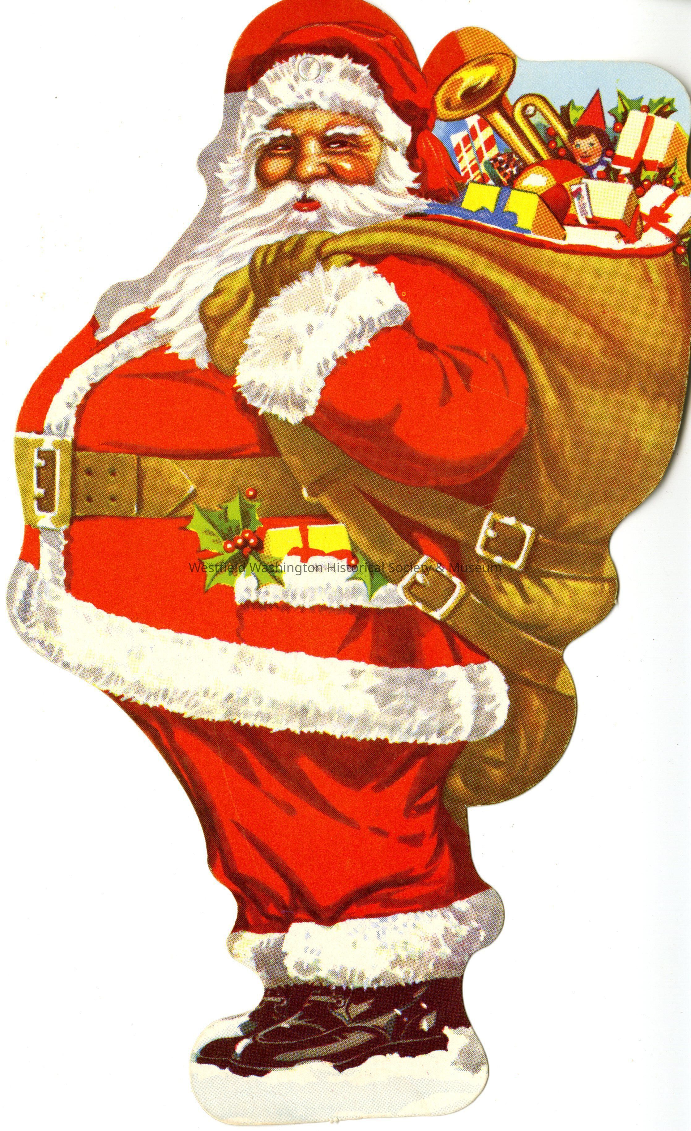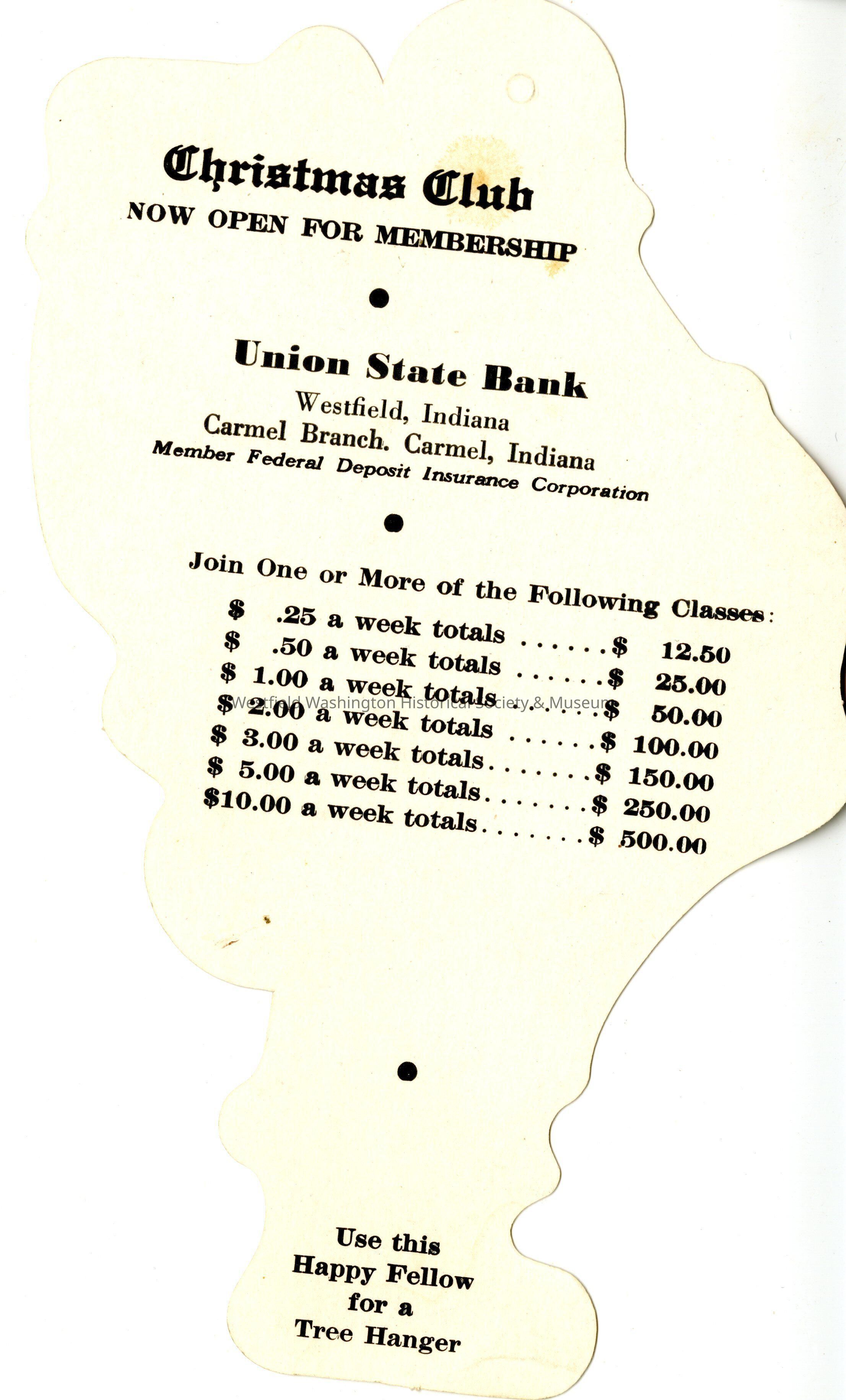 Ad for Union State Bank's Christmas Club that doubles as Christmas tree ornament, "Tree Hanger". One side is Santa and his sack of toys and the other side is information about membership for the Christmas Club.