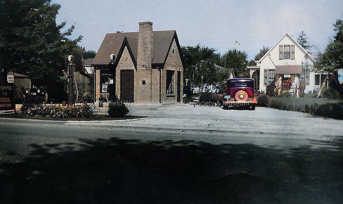 Well structure to the right of the gas station. Two gas pumps. Home in the background. Two cars visible in picture.