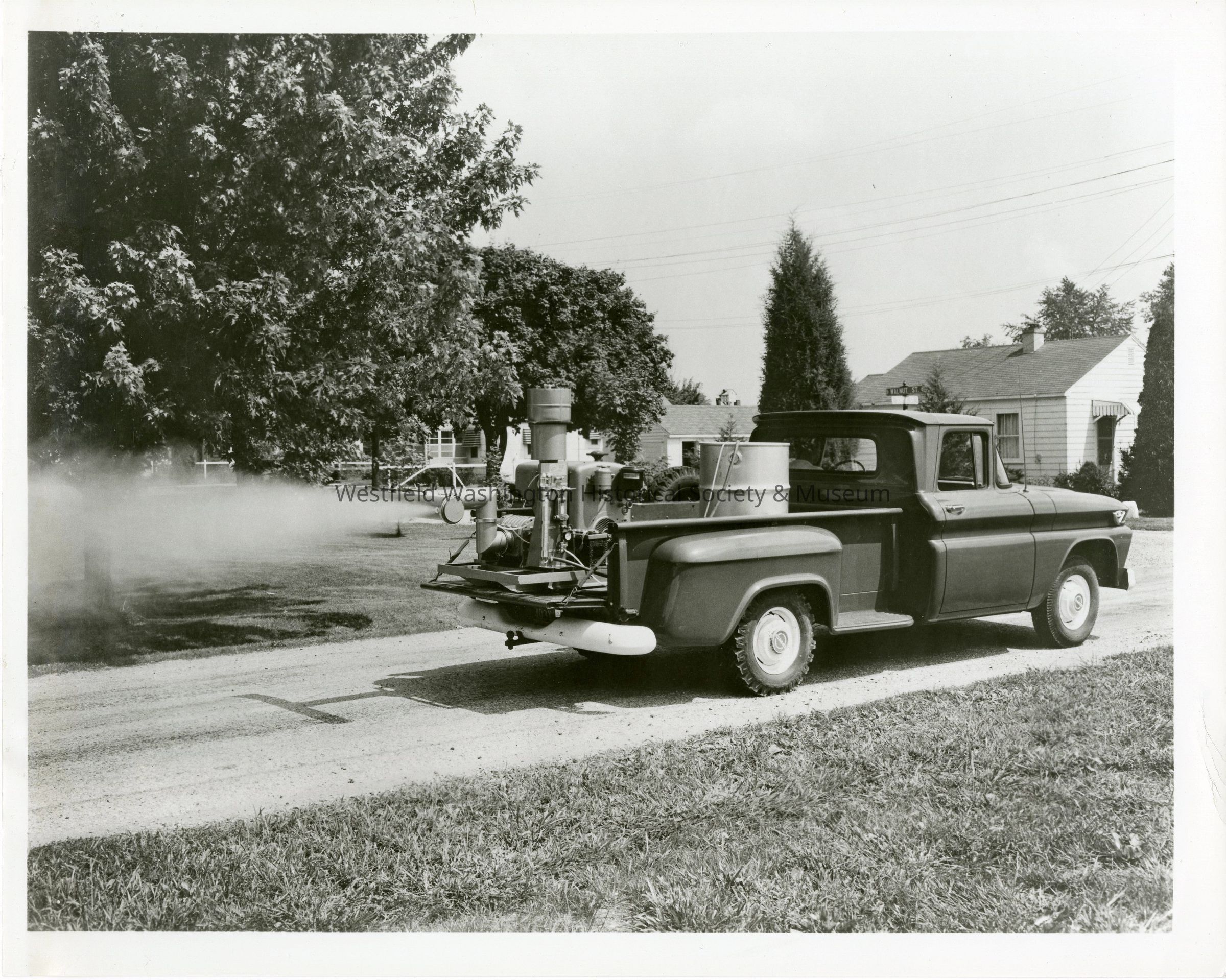 A black and white photograph of a pick-up truck driving by the intersection of Walnut Street and South Street in Westfield, with a fogging device activated on the back. It appears that a person, who is driving the truck, is probably testing the fogger manufactured by Curtis Dyna-Products Corporation of Westfield.