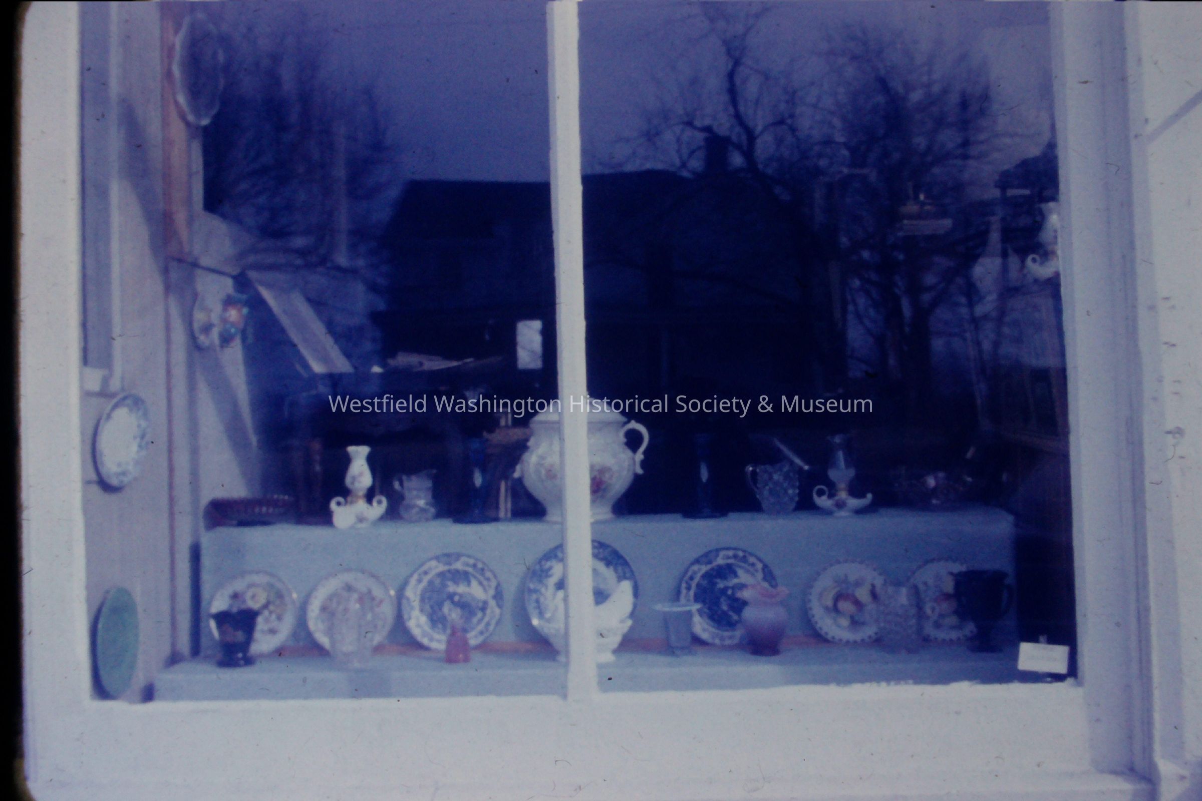 Window display with fine china plates and tea pot. Desk visible in the backgroundEntry/Object ID