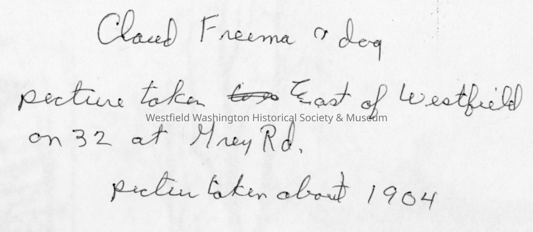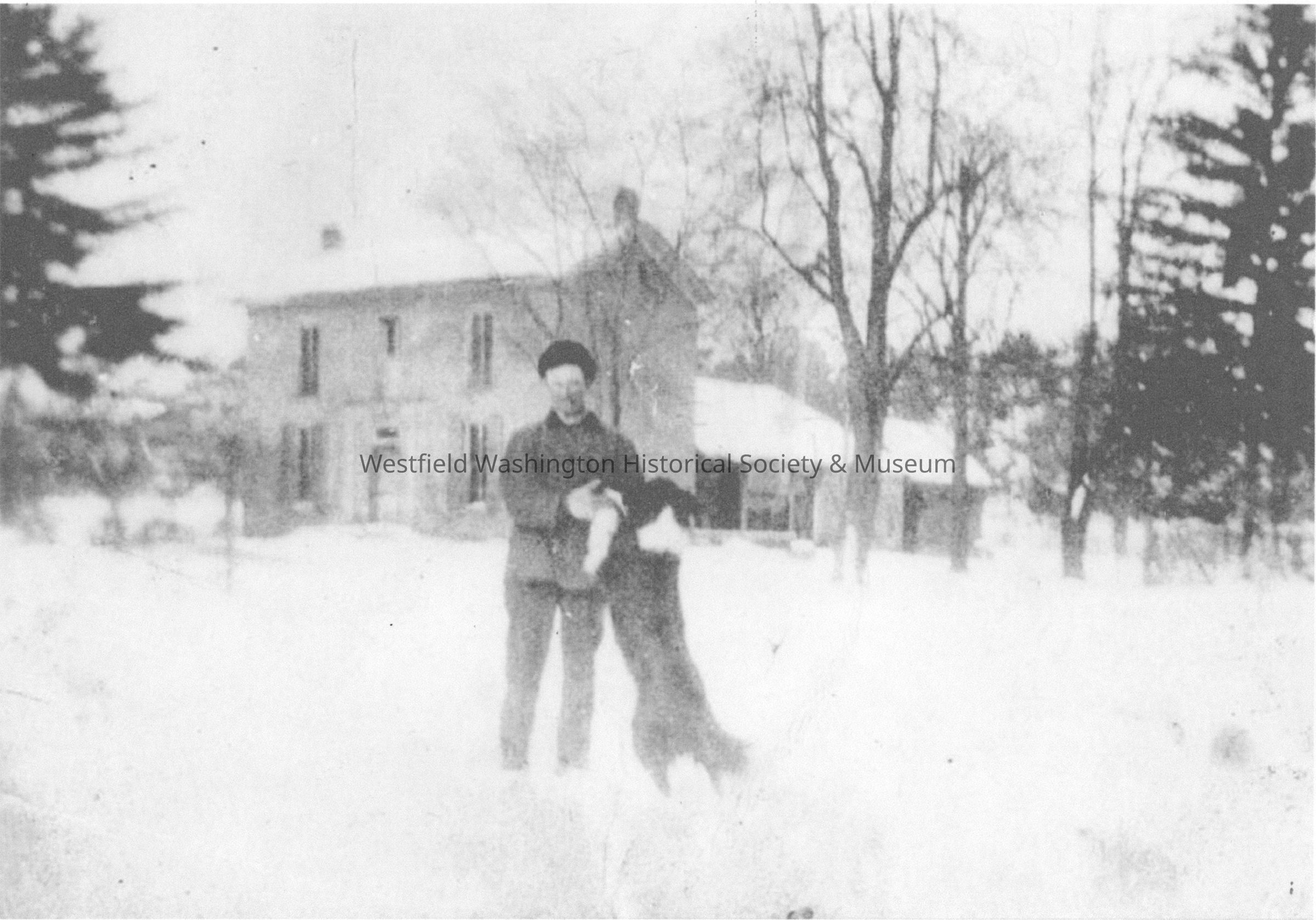 Photograph of Claude Freeman outside in, what seems to be, the snow with a dog.