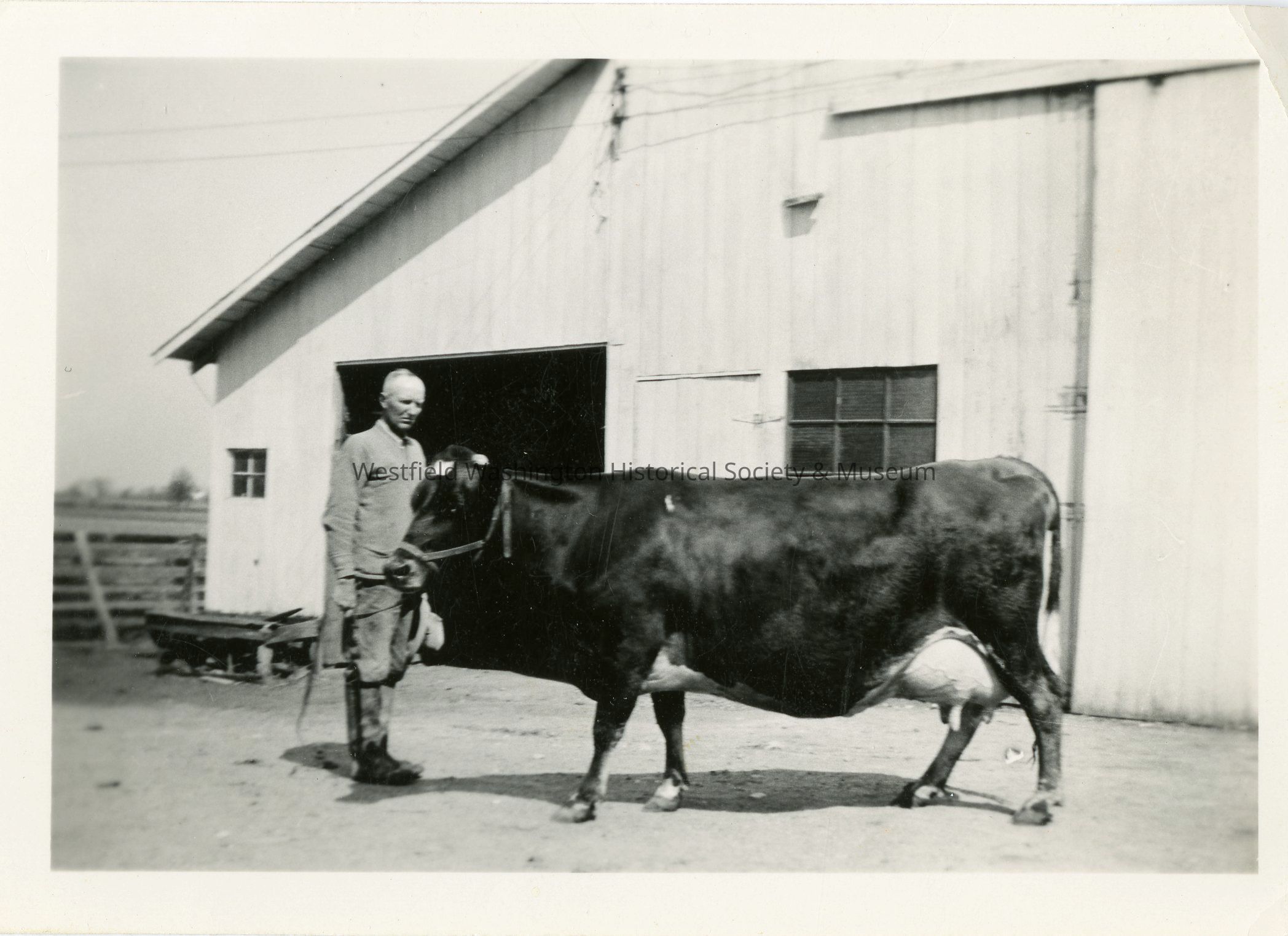 A Man with a Cow in front of a Barn part of the Wheeler farm