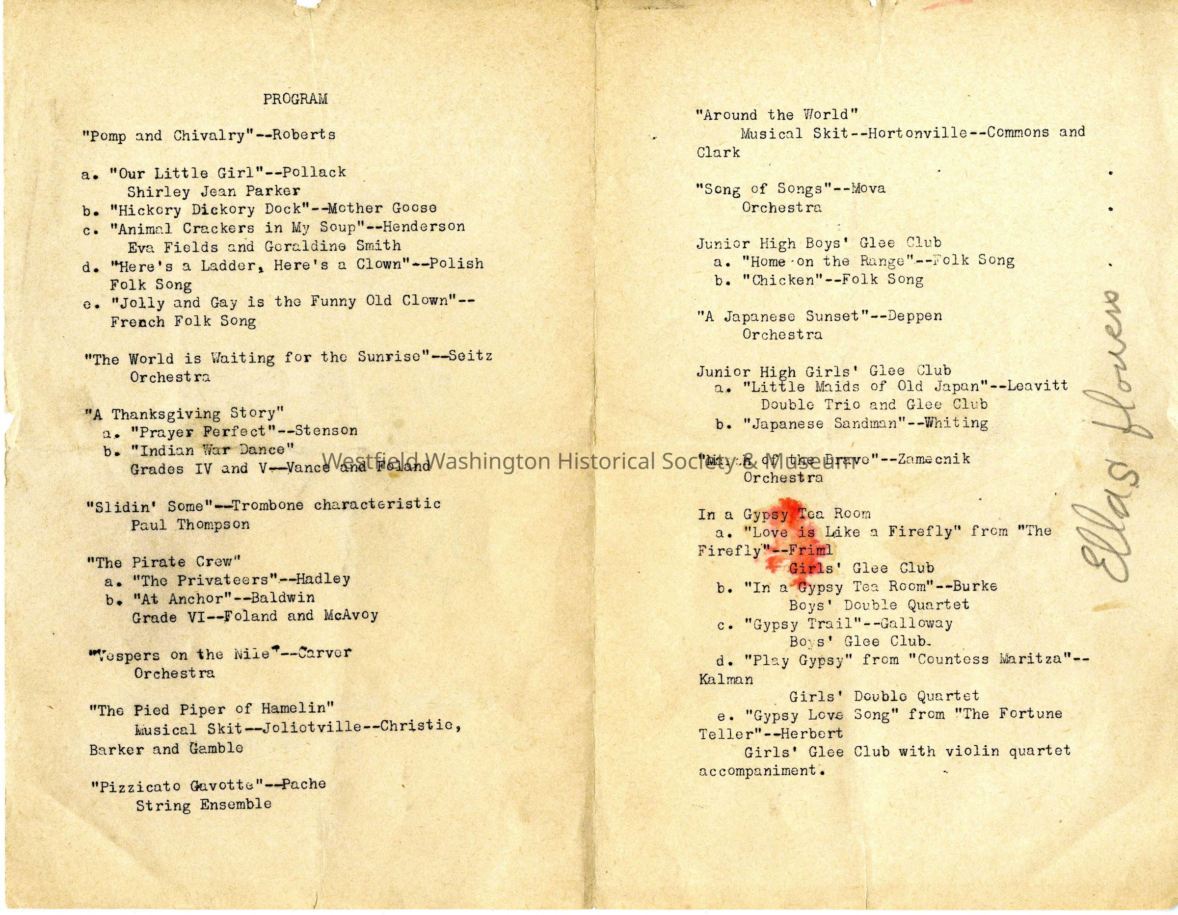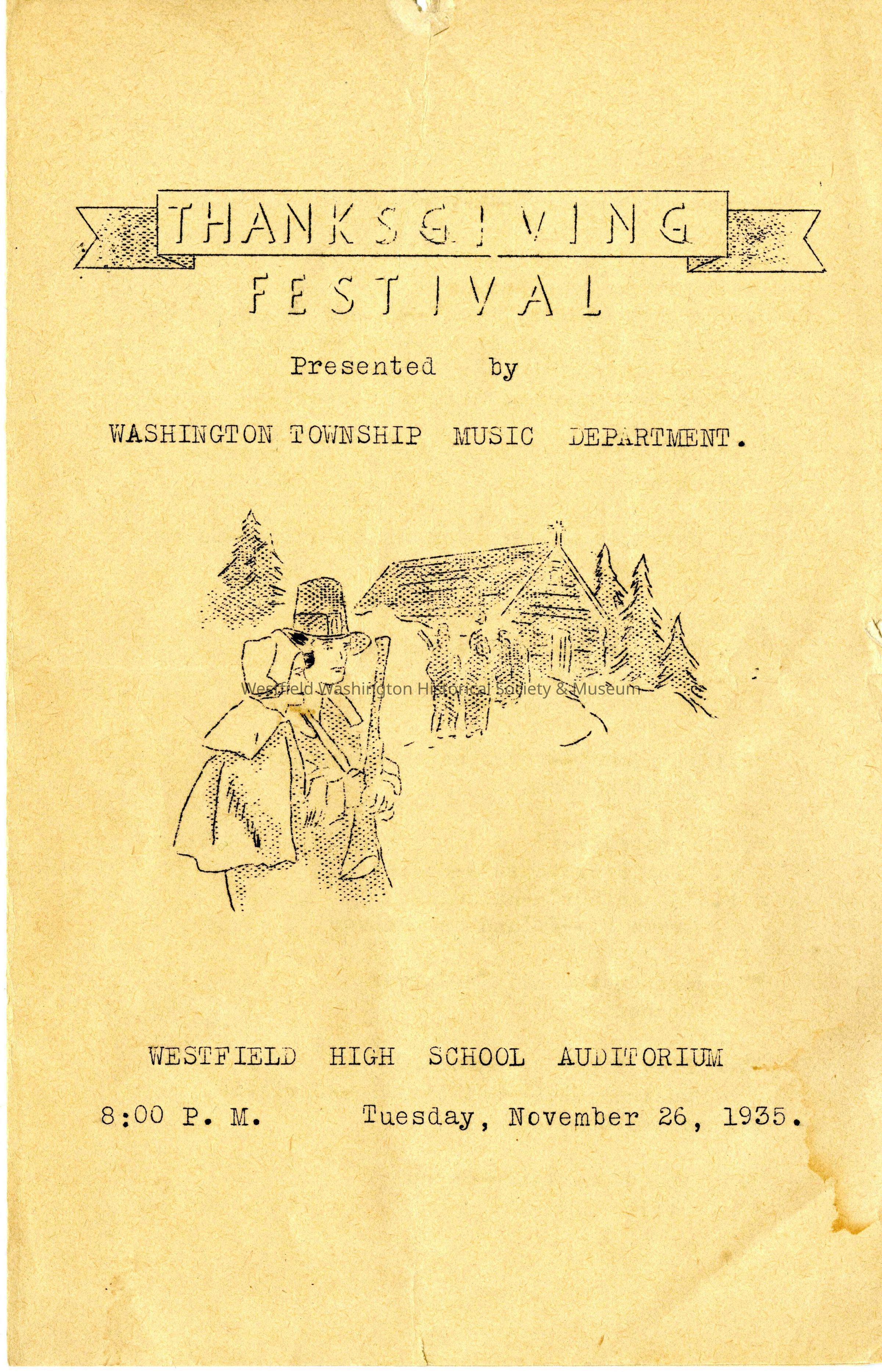 "THANKSGIVING FESTIVAL". Washington Township Music Department program. 2 pages.