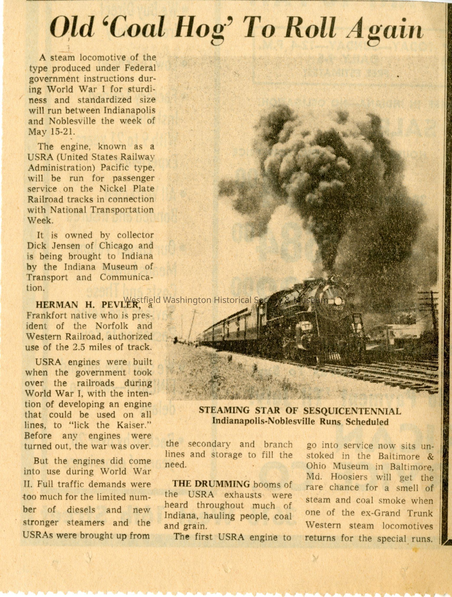 A short article discussing a special event where an old steam locomotive will operate between Indianapolis and Noblesville during National Transportation Week from May 15-21. The locomotive is a USRA (United States Railway Administration) Pacific type, crafted under government directions during World War I for sturdiness and standard size, and now owned by collector Dick Jensen of Chicago. The article highlights Herman H. Pevler, a Frankfort native and president of Norfolk and Western Railroad, who authorized track usage. The piece mentions the engines' historical significance during both World Wars and their role in hauling various goods, with emphasis on the nostalgic experience offered by the event as the locomotive will produce authentic steam and coal smoke, attracting attention to this cultural and transportation heritage celebration.Acquisition