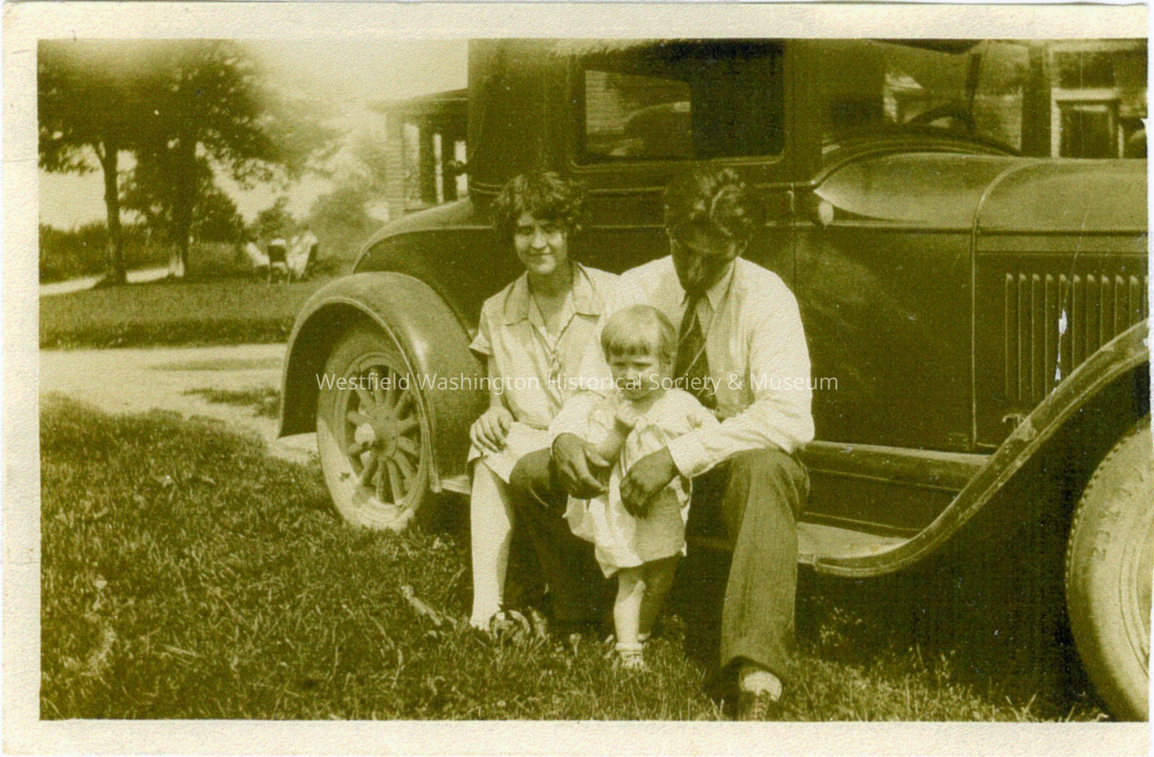A black and white photograph of Denzle, June, and Guy Millikan sitting on the side of a car in front of a house for a picture.
