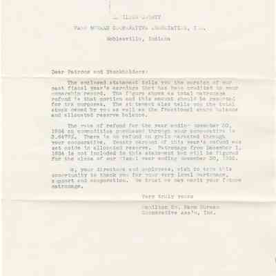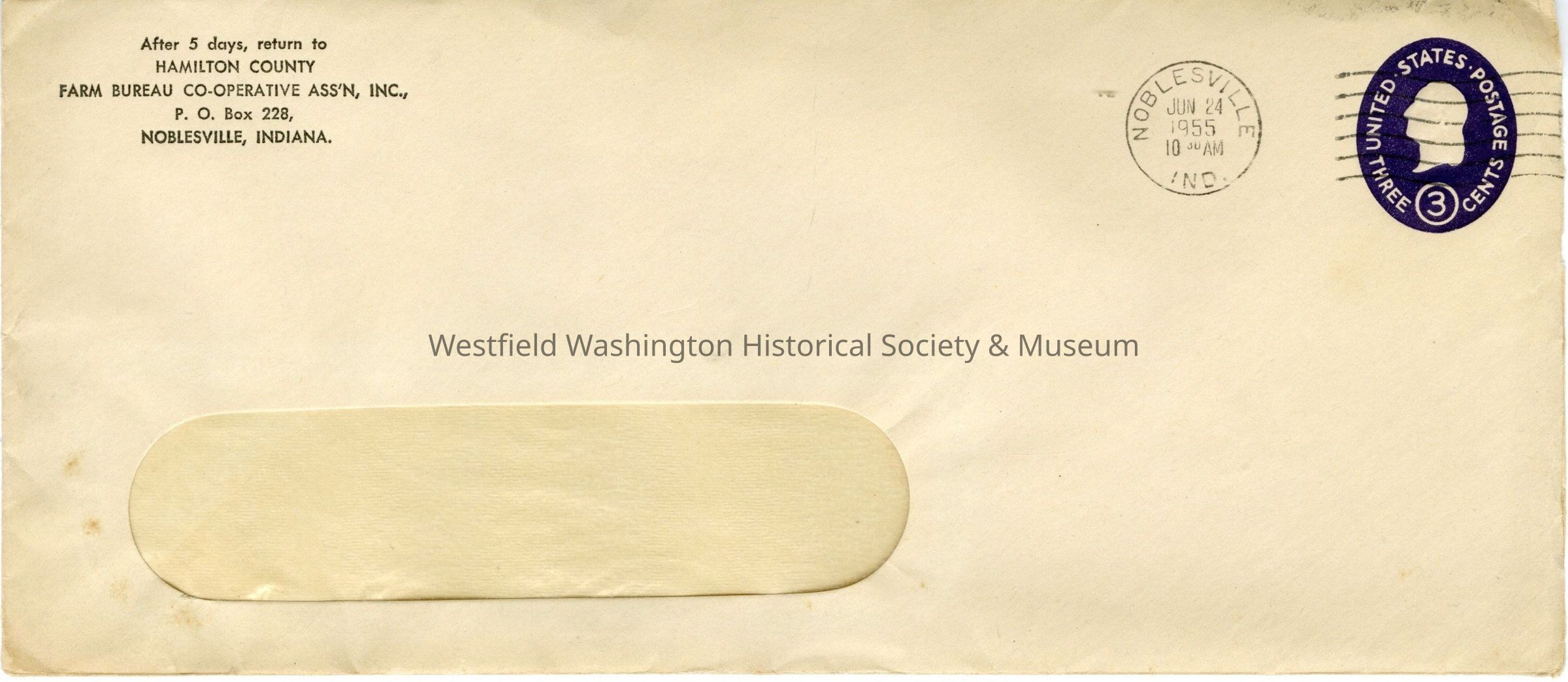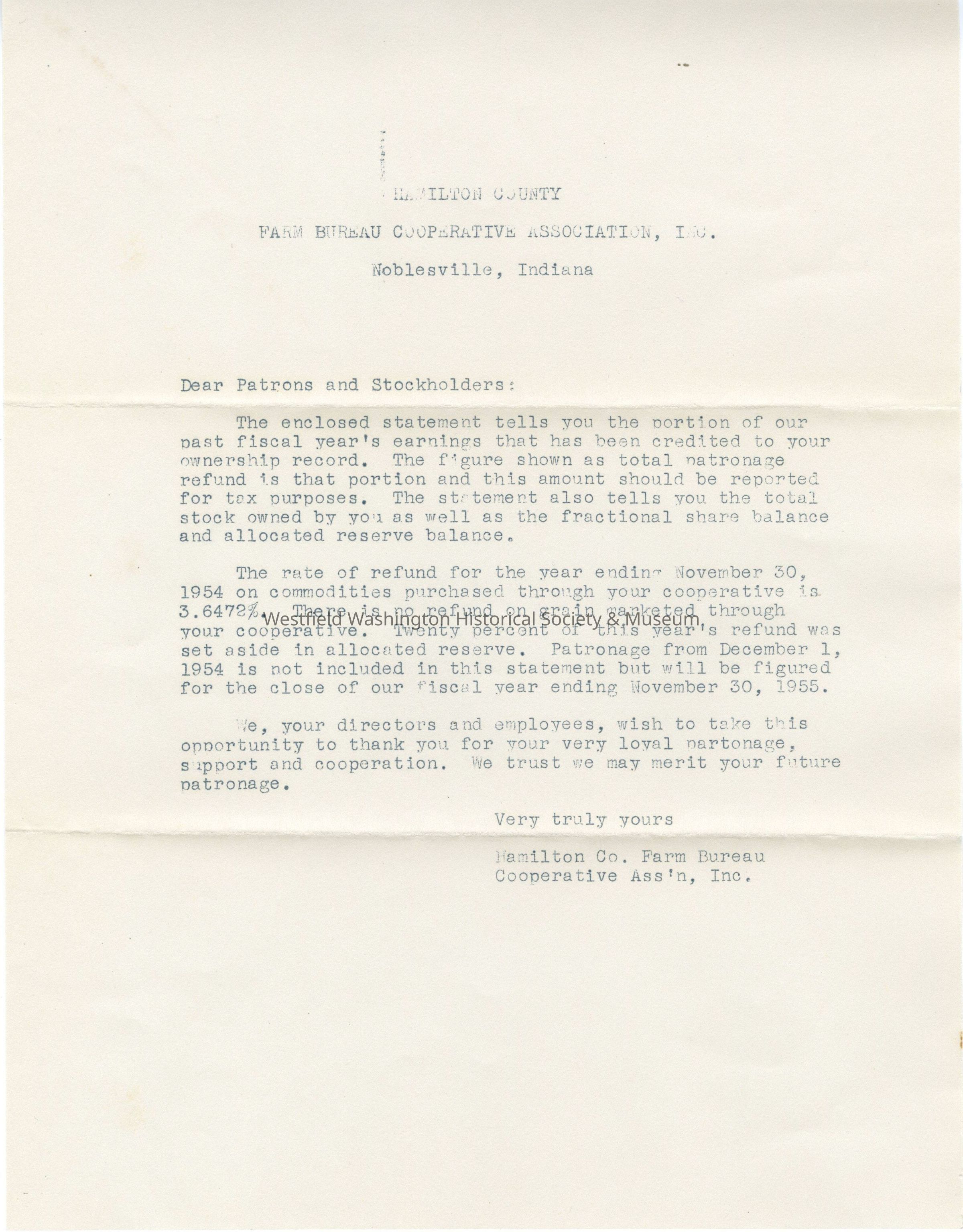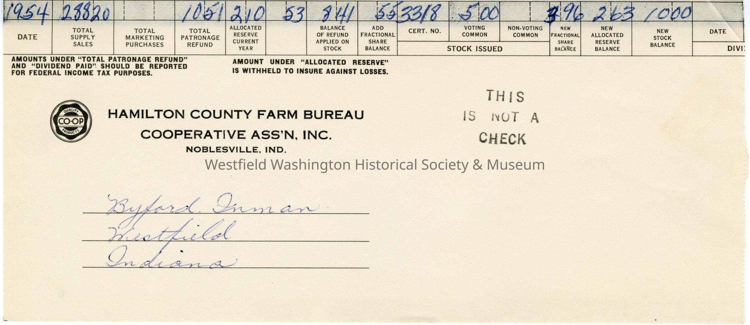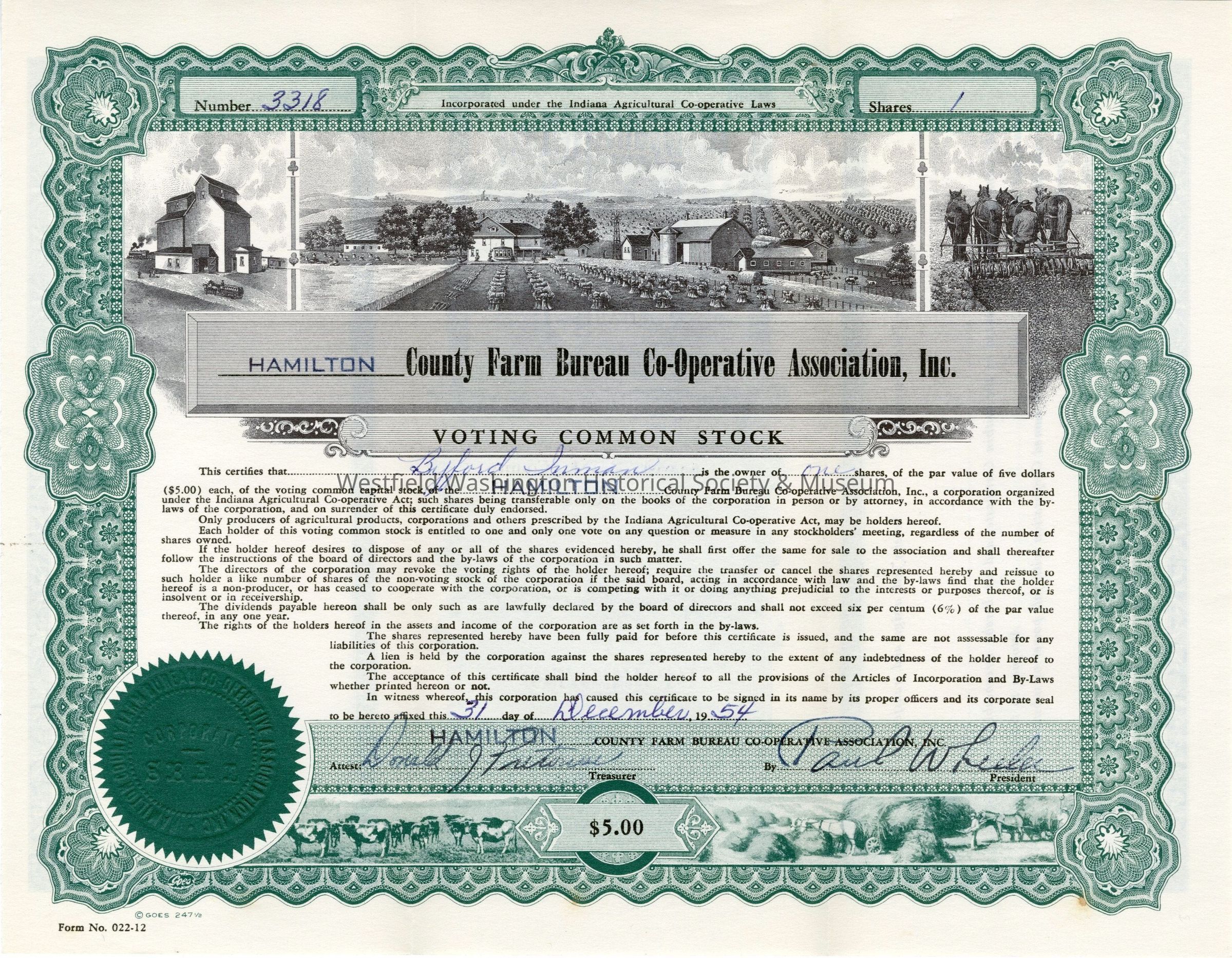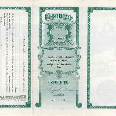 A Stock Certificate for 1 share of stock issued by the Hamilton County Farm Bureau Co-Operative Association Inc. to Byford Inman on December 31, 1954. This item includes a statement regarding the certificate, a letter from Hamilton County Farm Bureau Cooperative Association, Inc., and an envelope from the organization.Acquisition