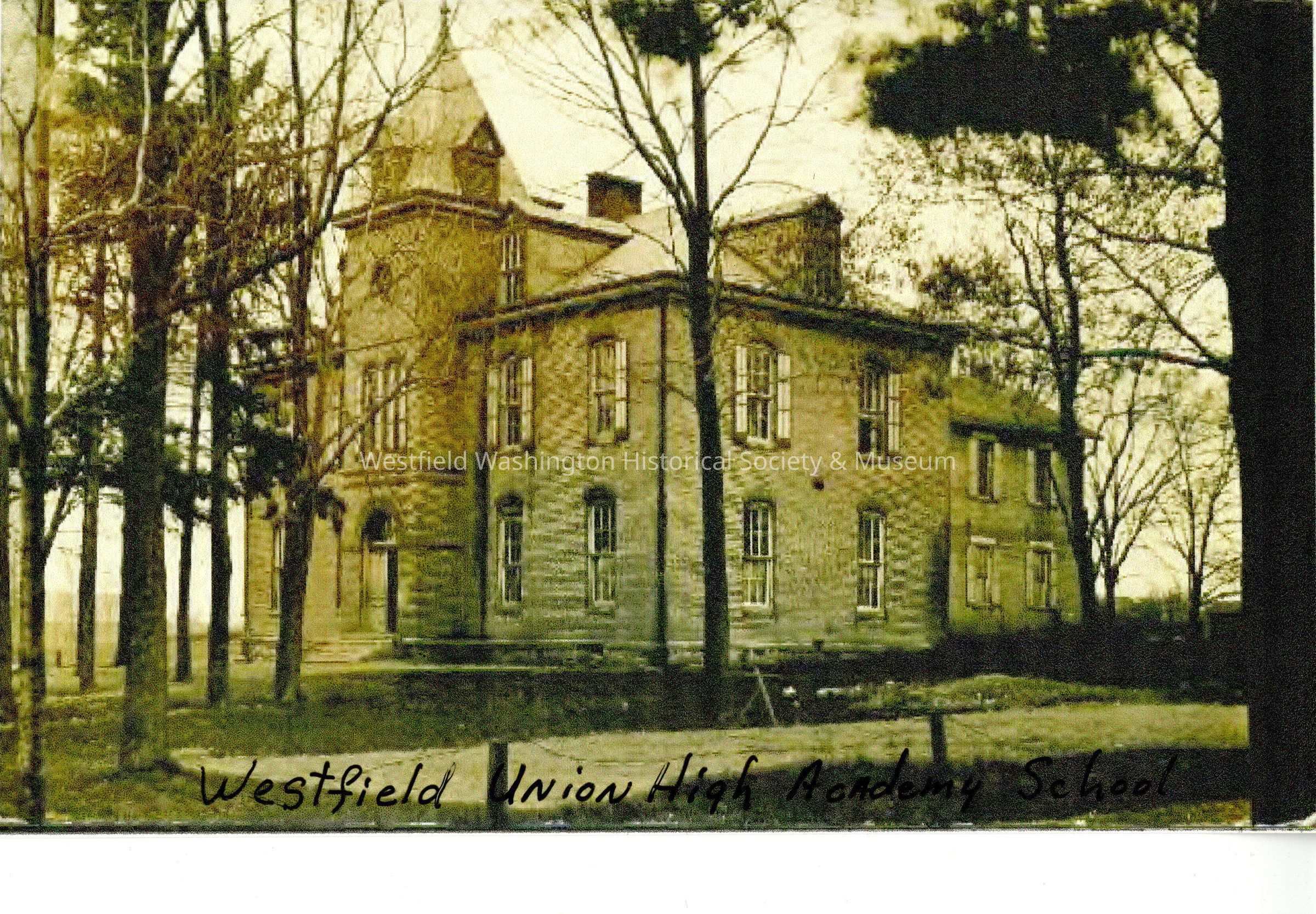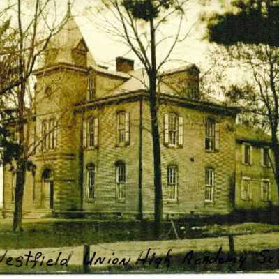 Photo of Union Bible College and Academy. "Westfield Inion High Academy School" is written on the front in black. This is most likely a copy of an orginal. Former Union High School