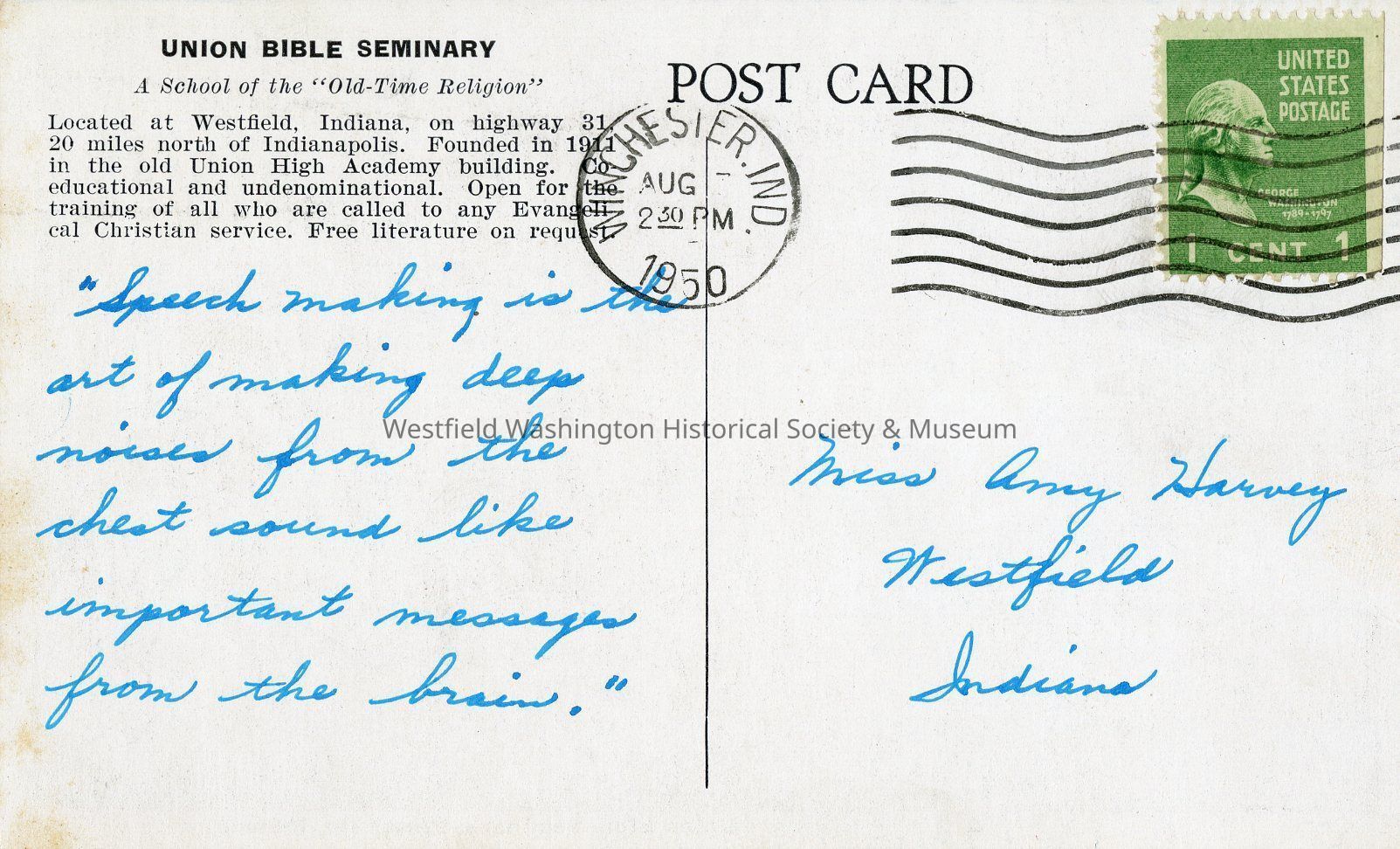 Located at Westfield, Indiana, on highway 31, 20 miles north of Indianapolis. Founded in 1911 in the old Union High Academy building. Co-educational and undenominational .Open for the training of all who are called to any Evangelical Christian service. Free literature on request.