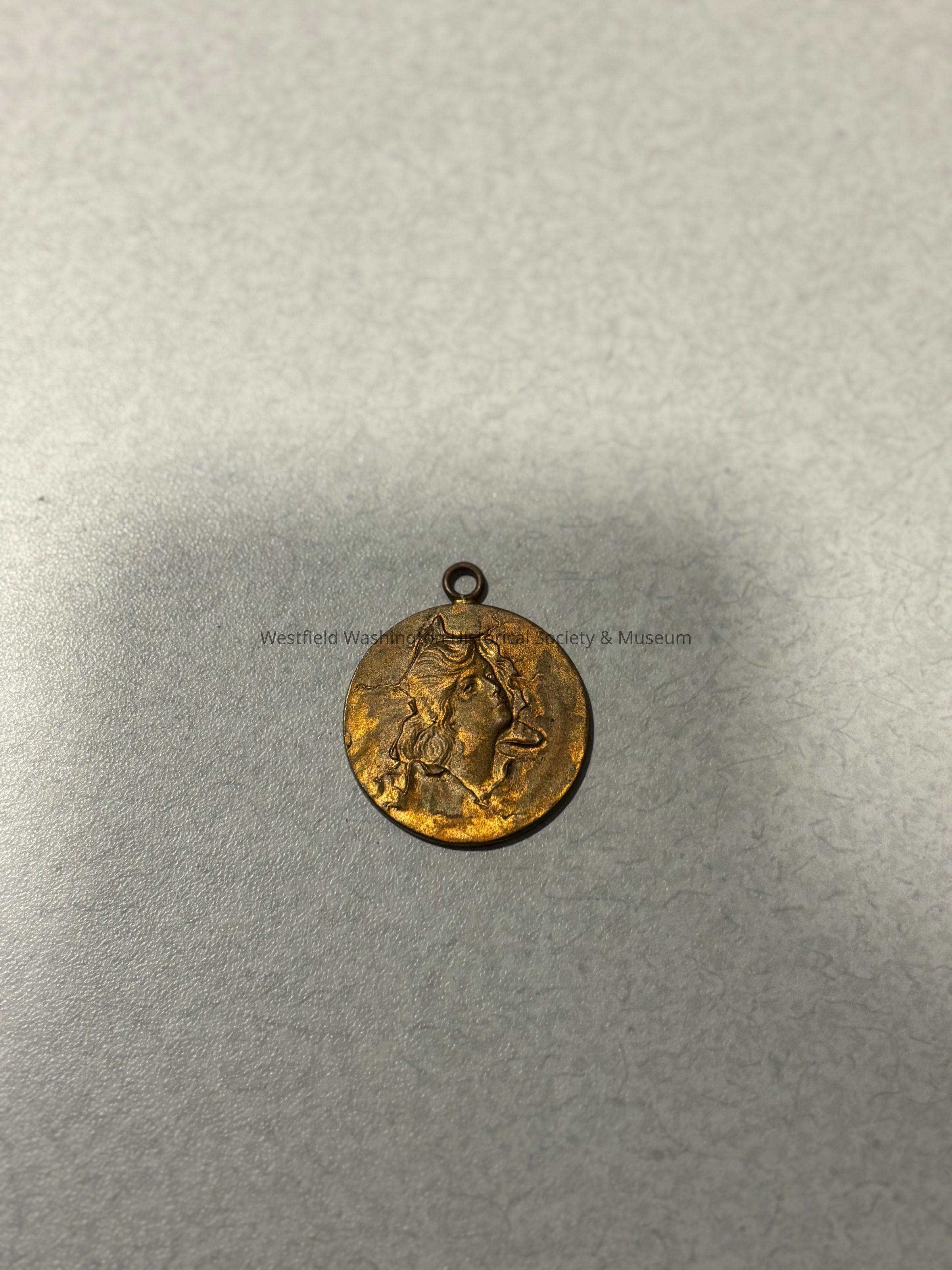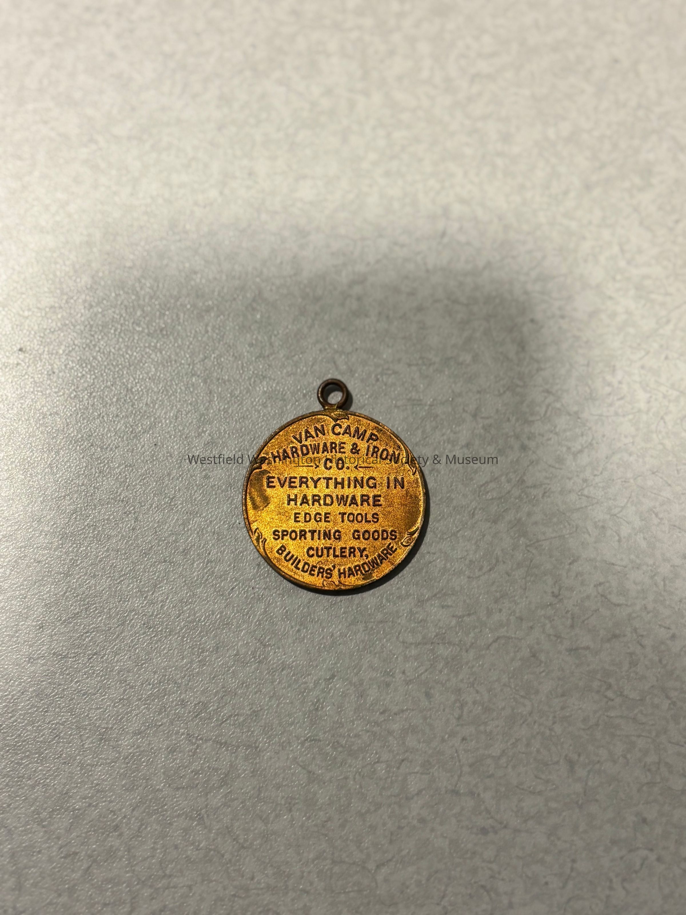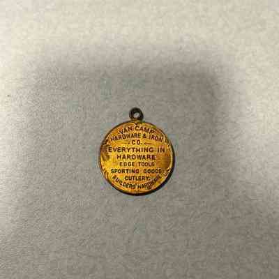 A gold medallion with an image of a woman with flowing hair on the front and the back with the words "Van Camp Hardware and Iron Co. ,Everything in Hardware, Edge Tools, Sporting Goods, Cutlery, Builders' Hardware"Acquisition