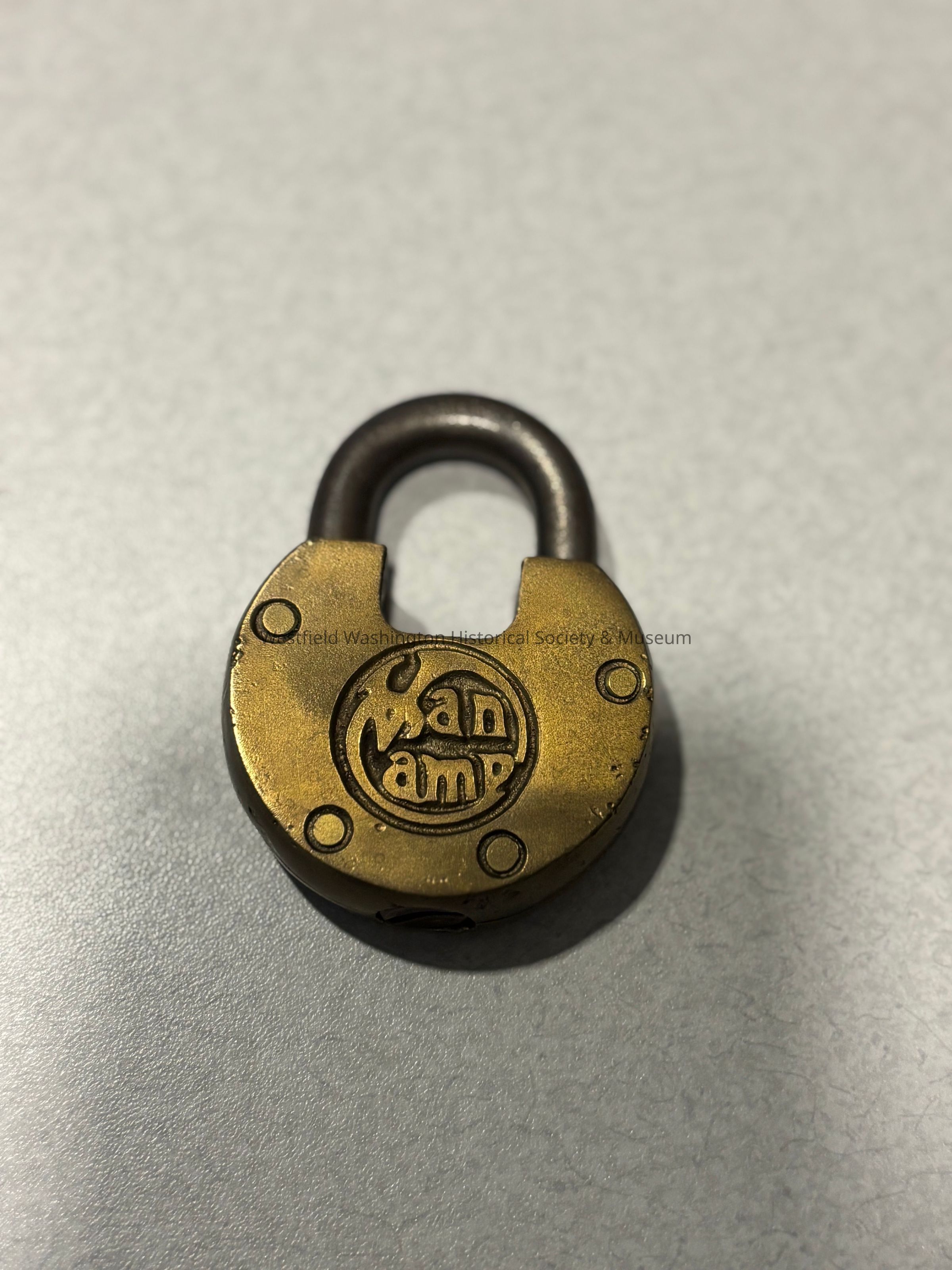 The image features a vintage brass padlock with a round body and dark metal shackle, engraved with the logo “Van Camp” on its front, lying on a smooth, light gray surface, highlighting its rustic and antique appearance.