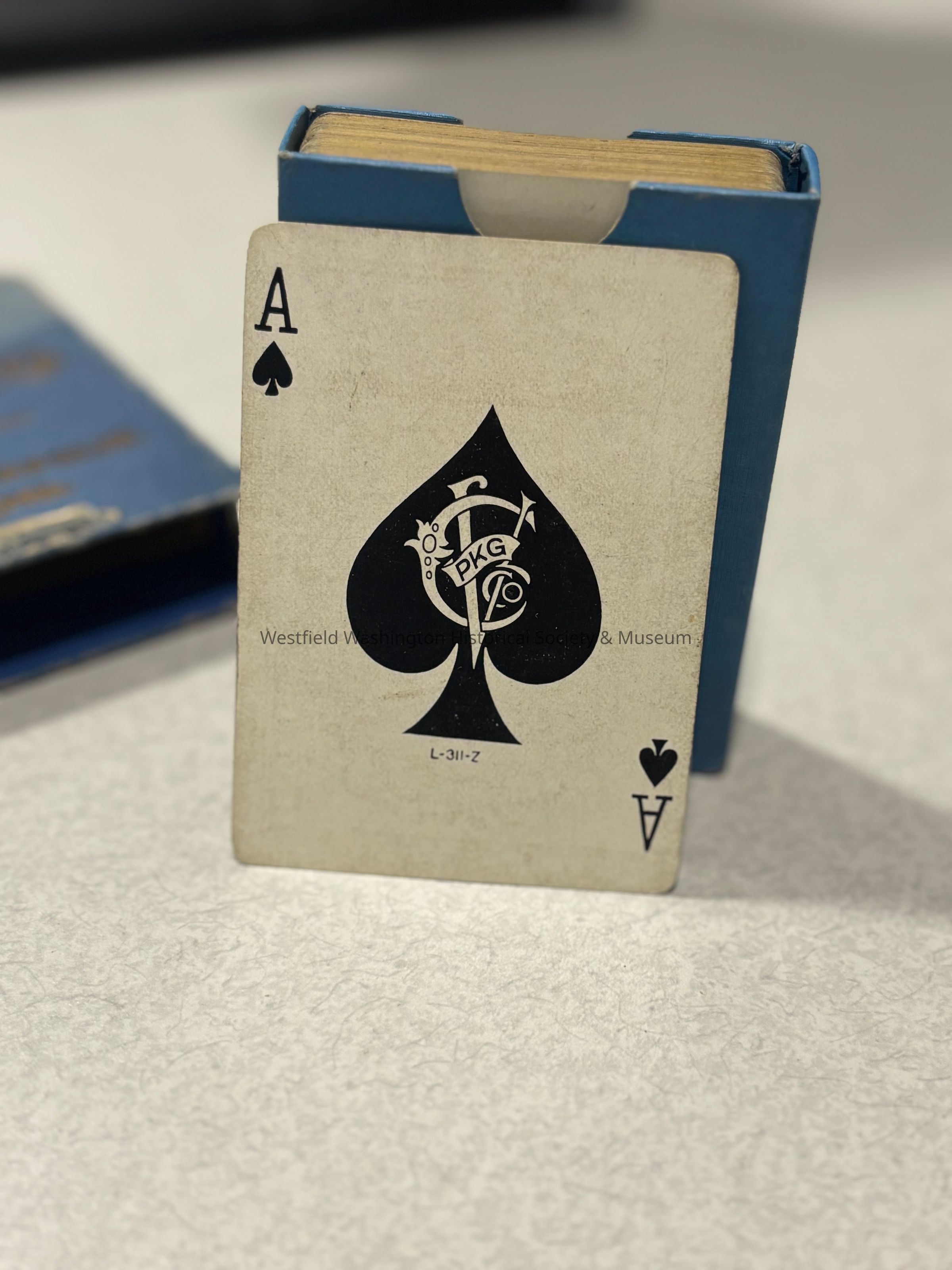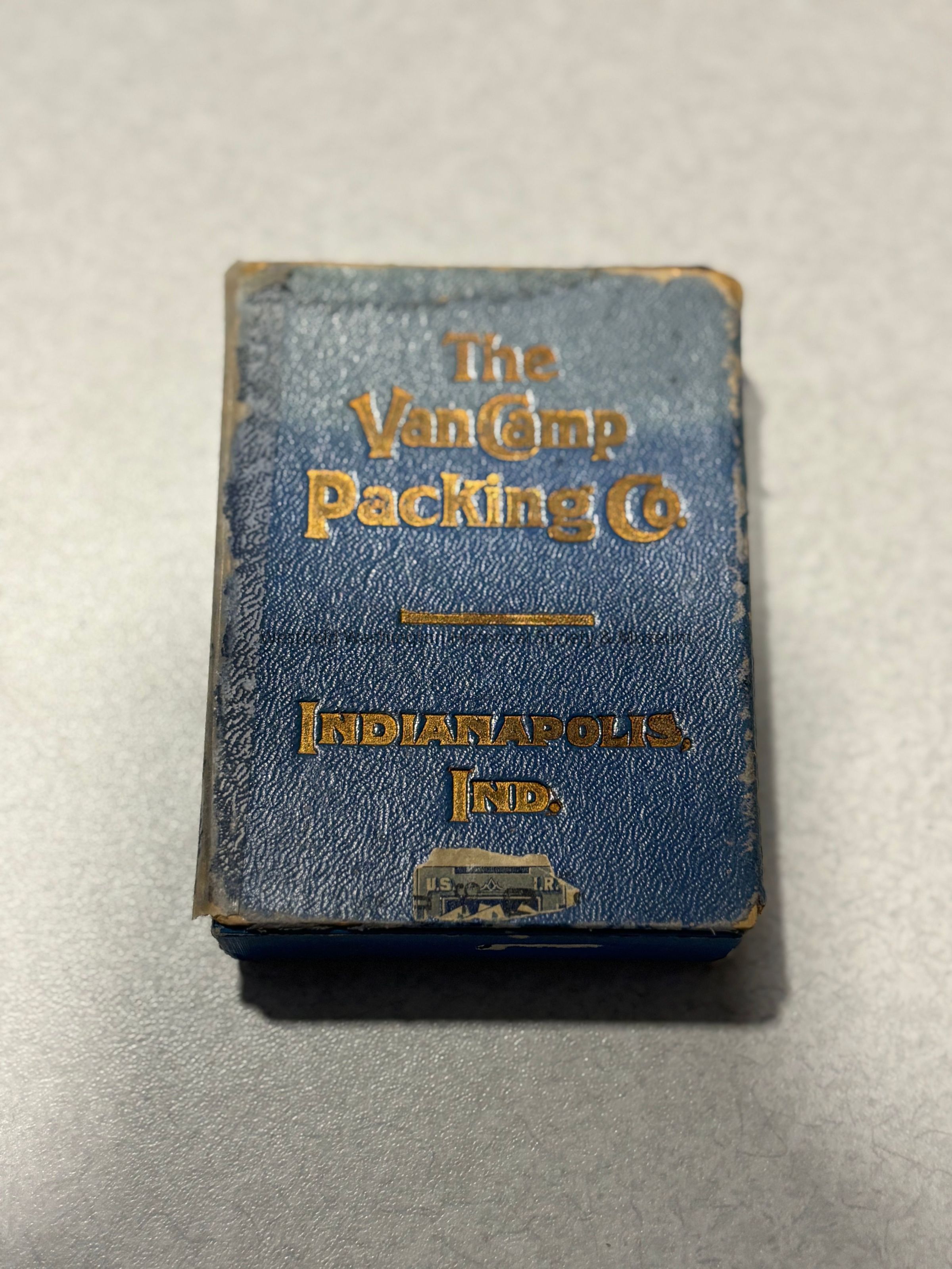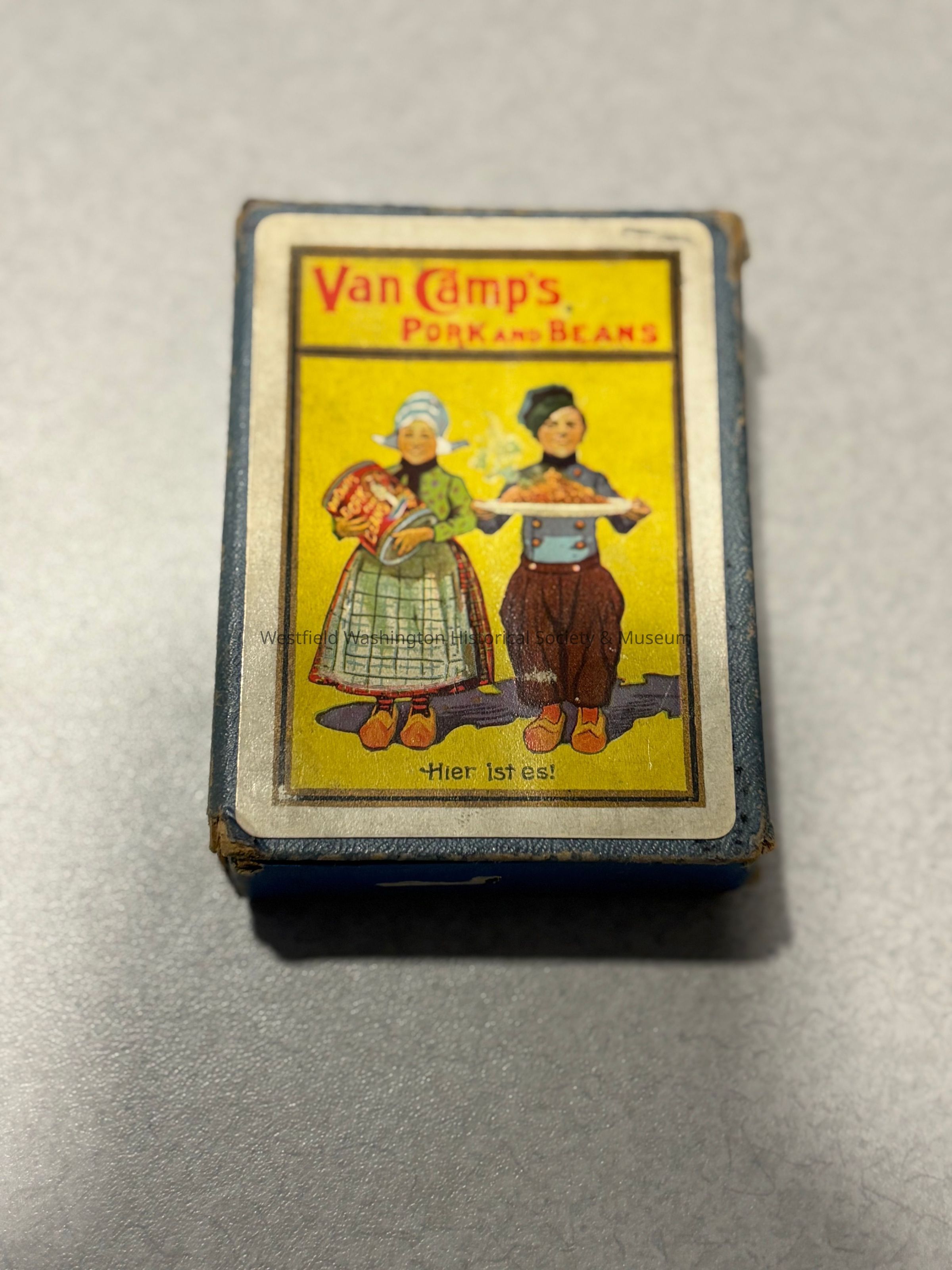A box of playing cards from the Van Camp Packing Co. with an image of the characters Hans and Lena on the front. The cards inside have gold foiling around the edges.