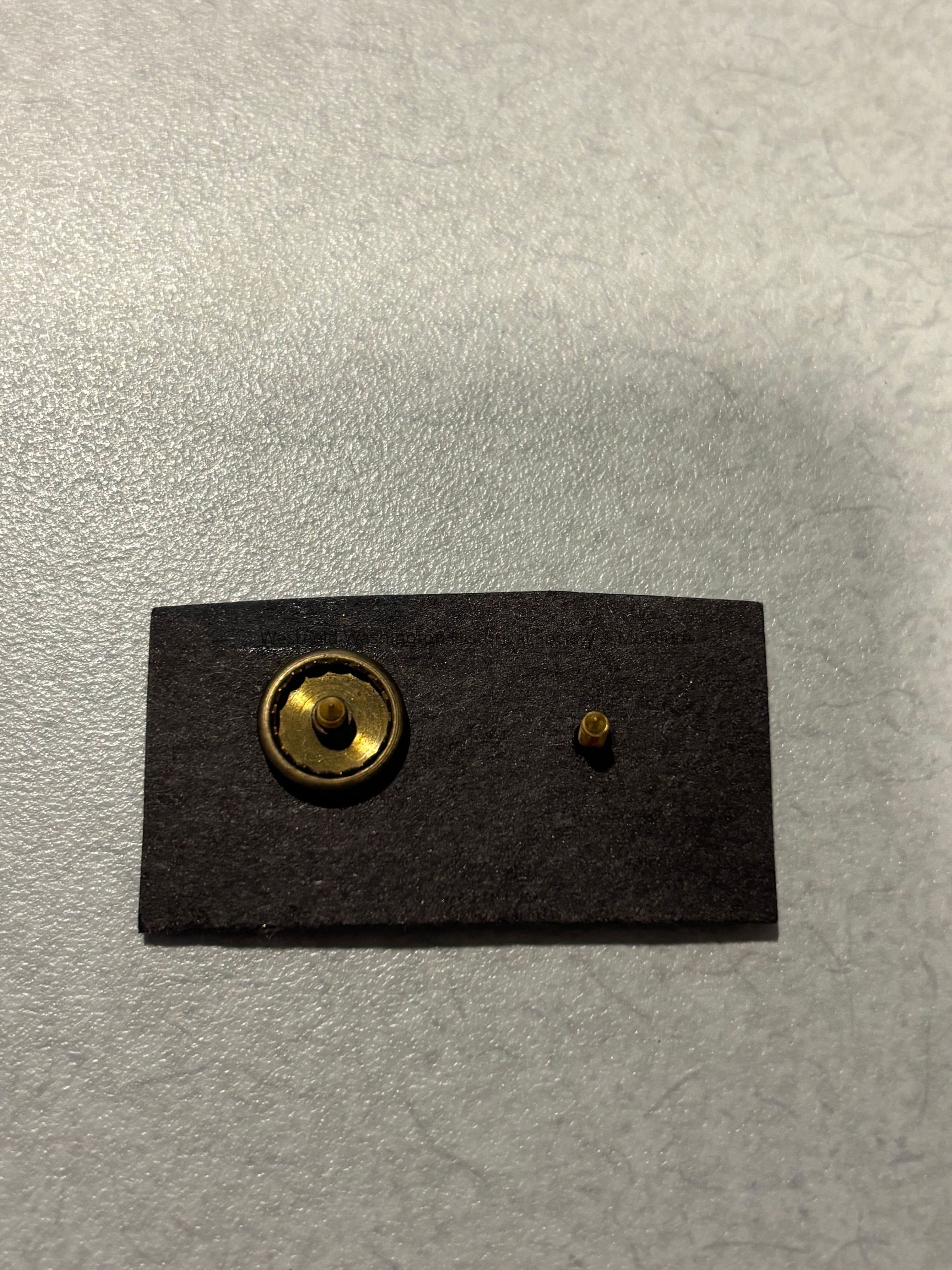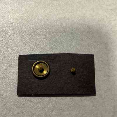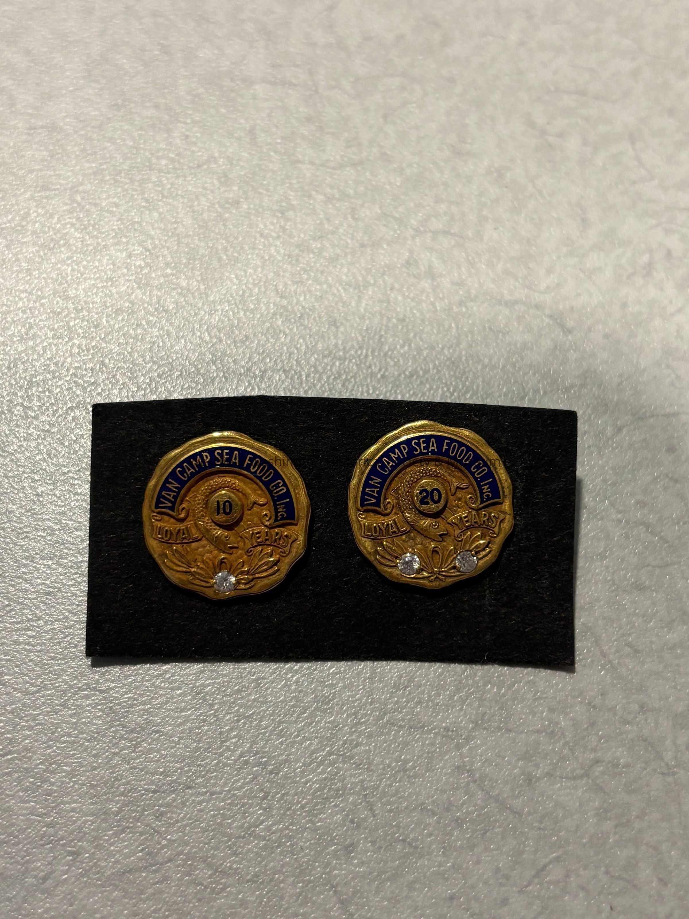 The image displays two gold-tone pins placed on a black rectangular background, each with intricate detailing and a small gem at the bottom. The pins commemorate years of service, with one showing "10 Loyal Years" and the other "20 Loyal Years," both marked with the name "Van Camp Sea Food Co Inc." The design includes a curved blue banner and ornate floral elements at the base, emphasizing the significance and appreciation of dedication over time.
