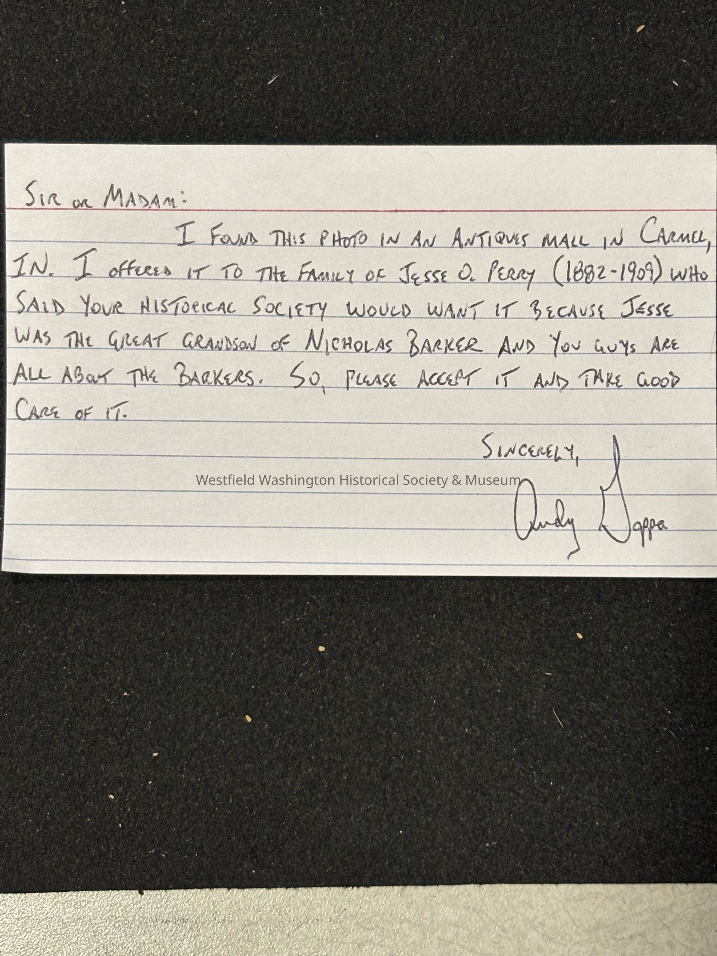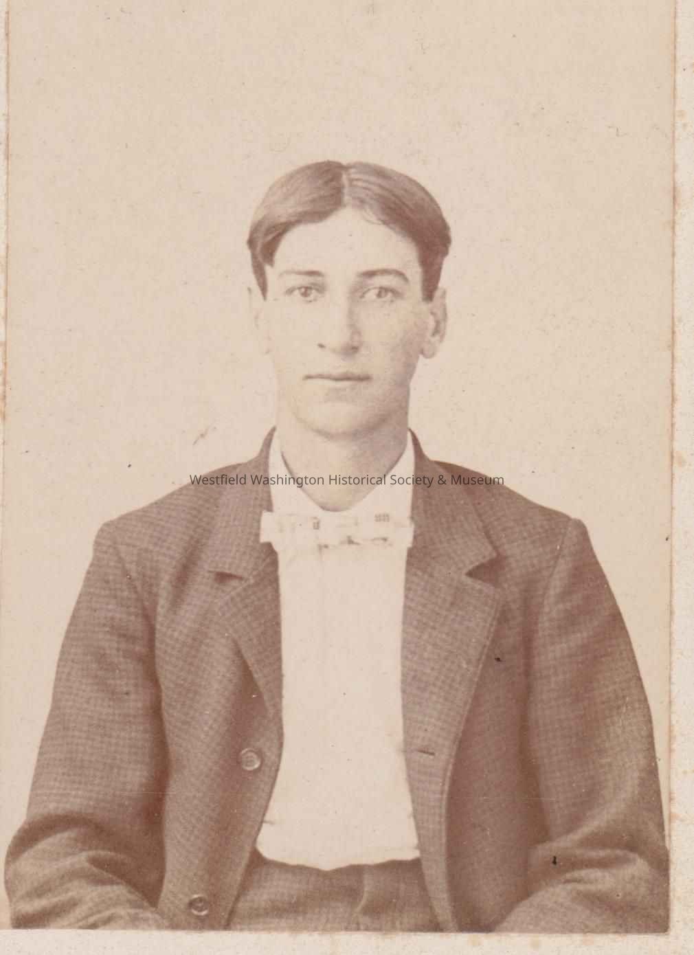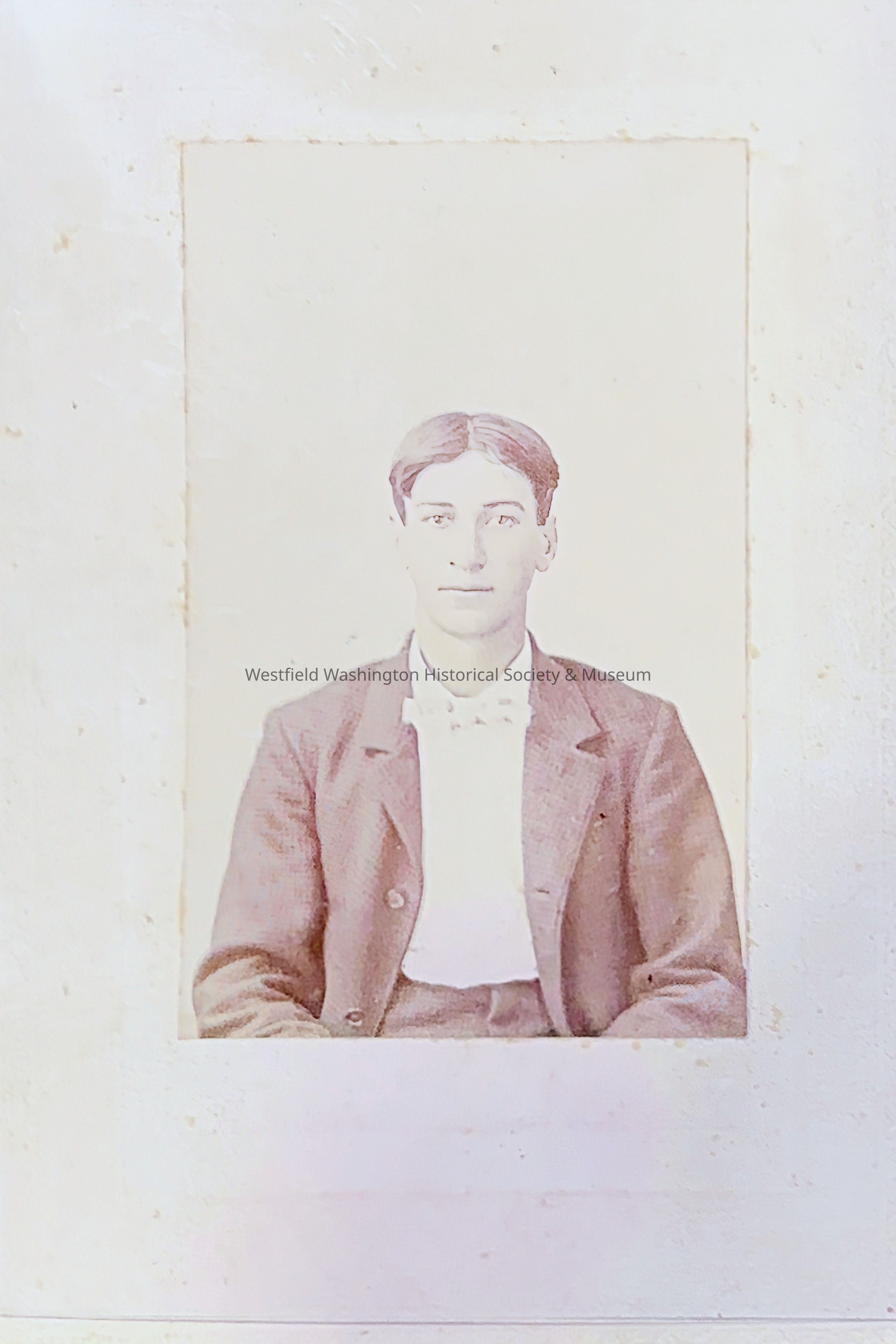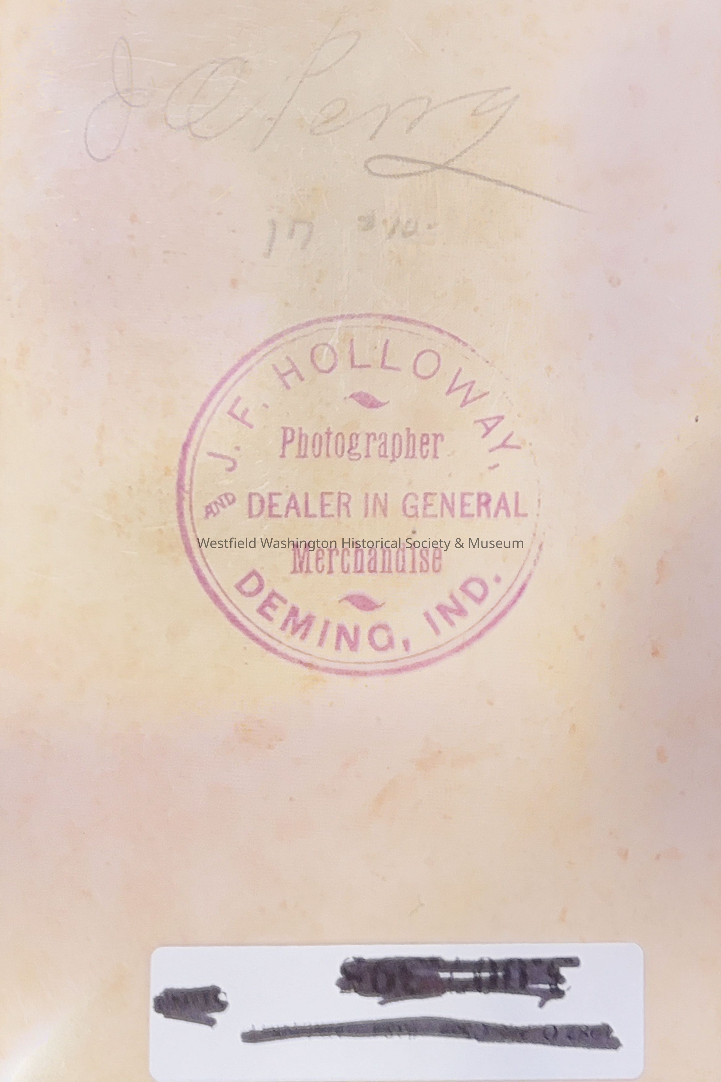 Picture of Jesse O Perry The image depicts a vintage portrait of a young man with neatly combed hair, dressed in a formal attire consisting of a dark suit and a bow tie, portrayed against a plain backdrop; the photograph, is framed in a simple border with some age-related discoloration and wear. According to the Donor this is Nicholas and Fanny Barkers great grandson. His grandfather was Elisha H Barker, his mother Candace (Beals) Barker. His mother Vashti (Barker) Perry, his father James F Perry. On the back is a stamp of the photo studio J.F. Holloway in Deming 28 Nov 1882 - 25 Jan 1909 He died of "Pulmonary consumption" an old term for tuberculosis (TB). J. F. Holloway Photographer Dealer in General Merchandise Deming, IND
