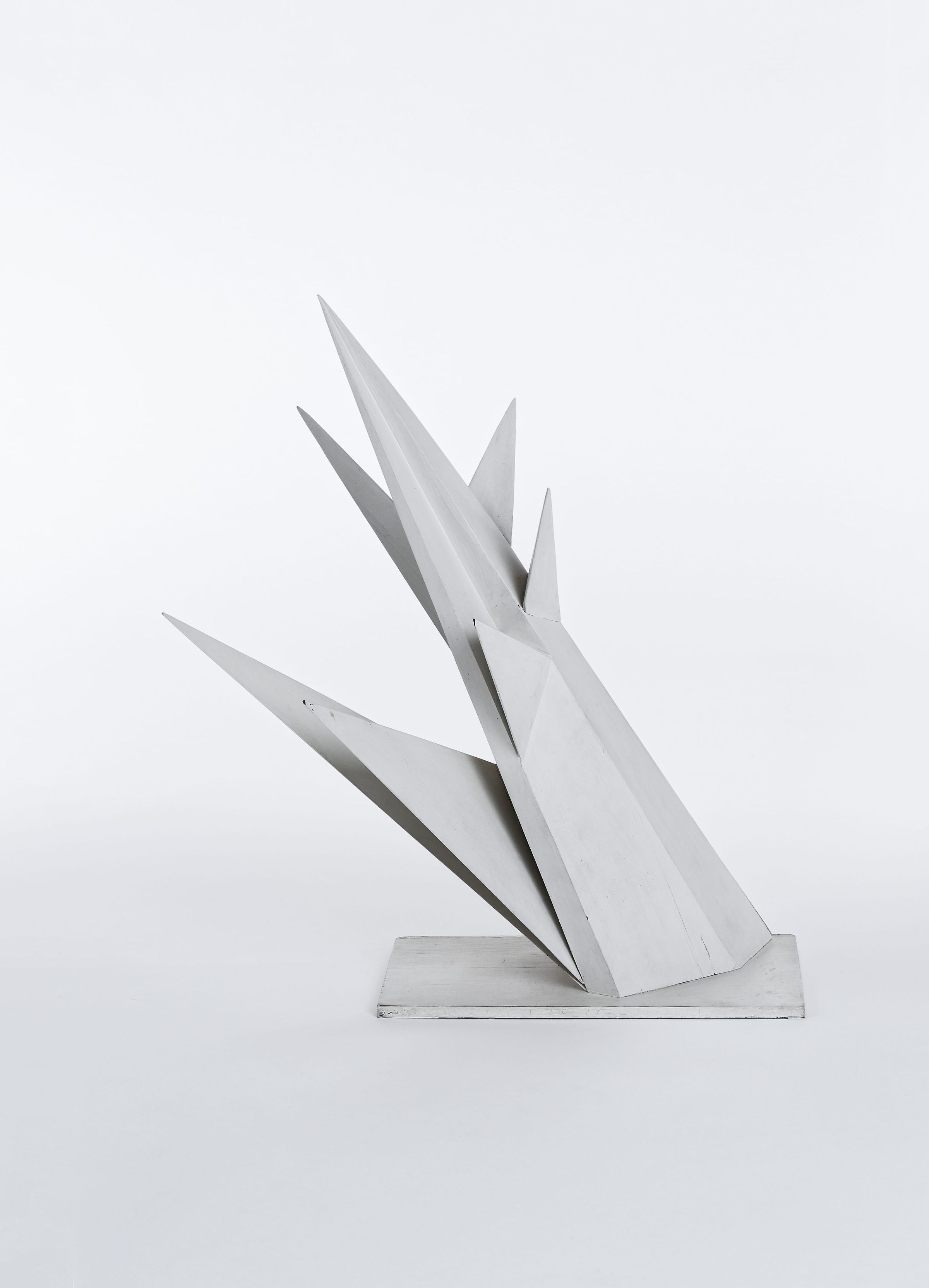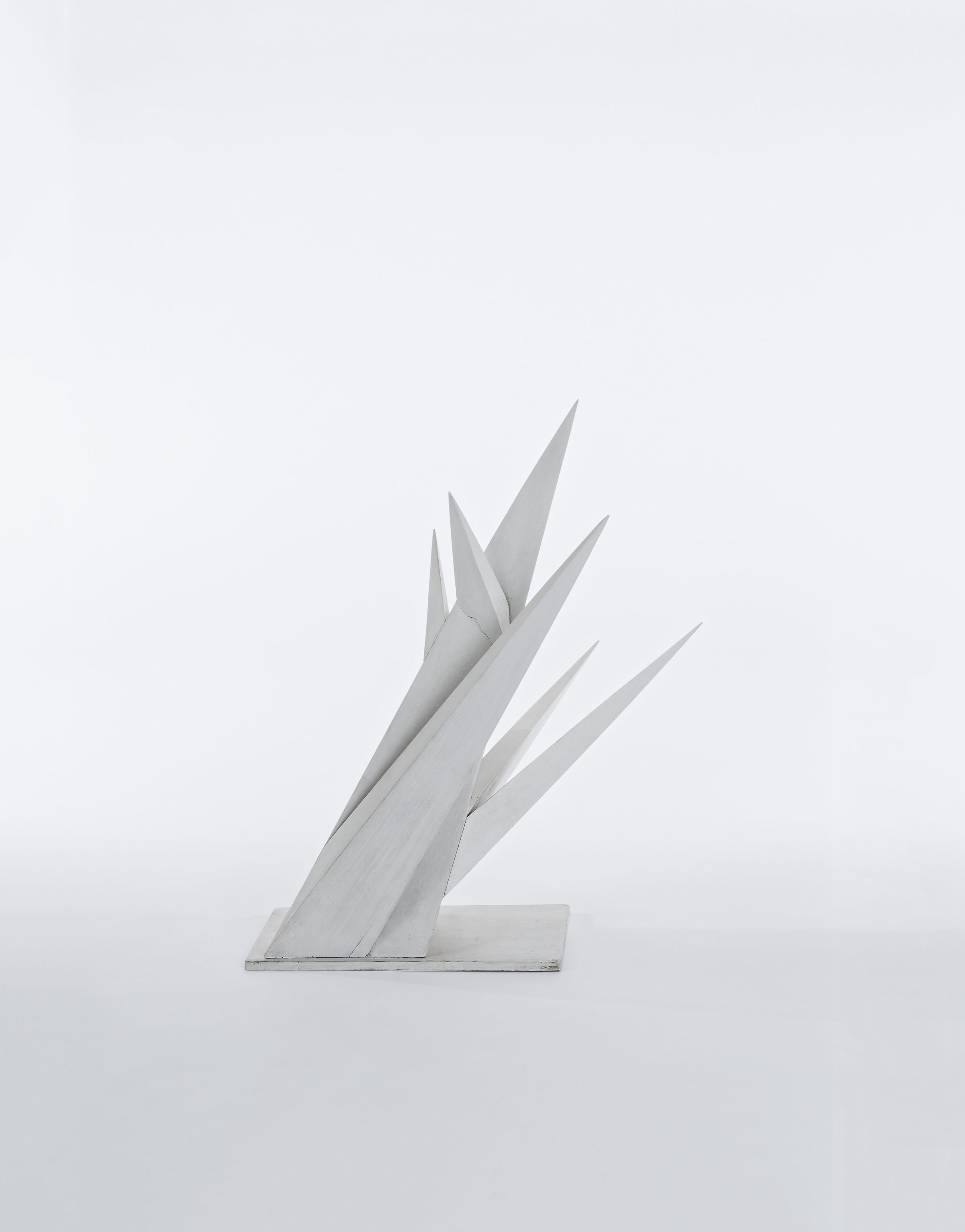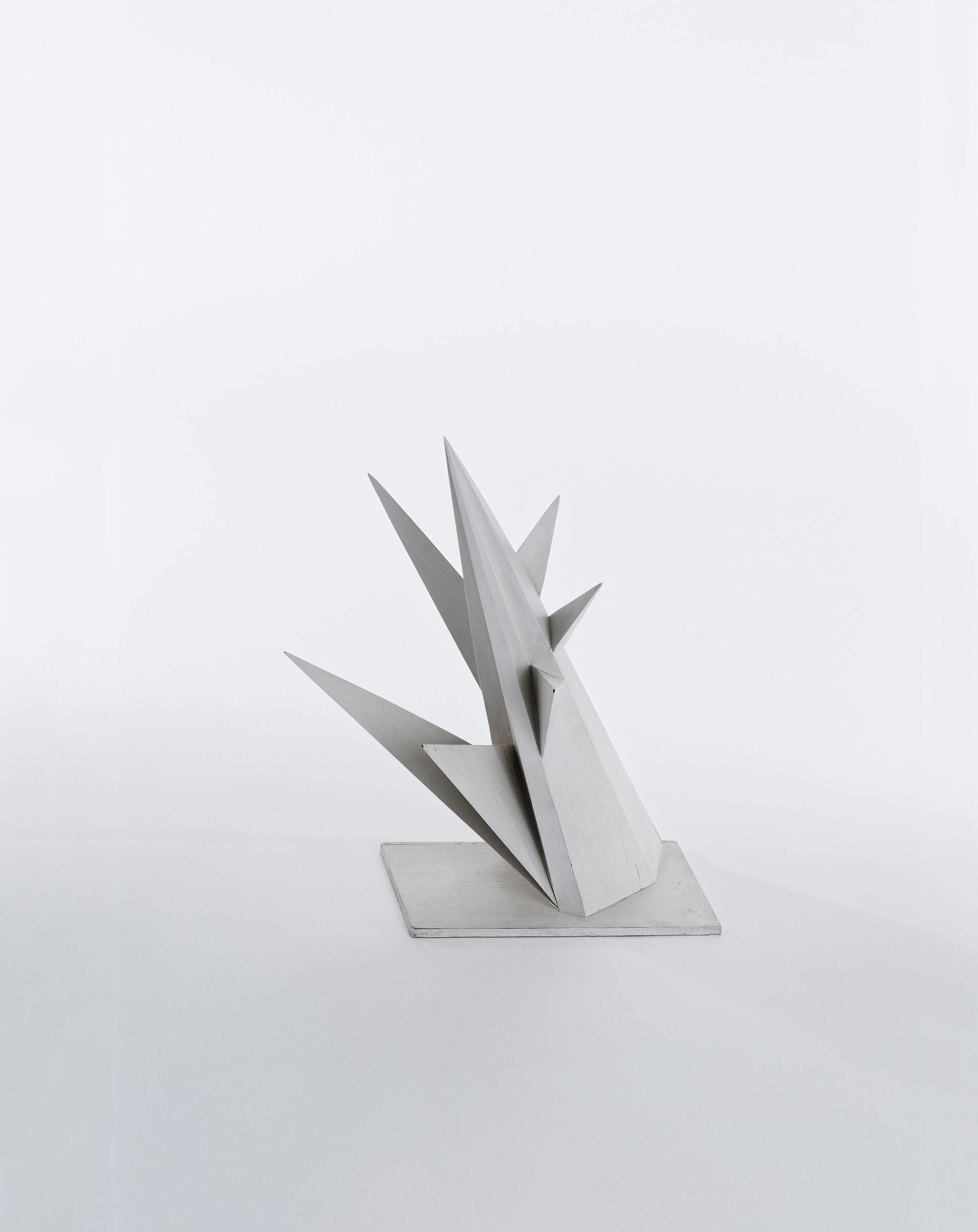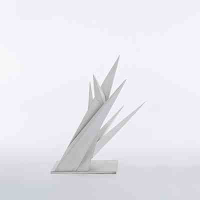 Submitted as an entry for the U.S. Treasury Department’s war memorial competition (the winning entry was a representational piece depicting a farmer laying down the reins and picking up a rifle). Offense knows the direction of attack, defense requires flexibility. Defense was used again in 1964 as a model for WE’s entry in Philadelphia’s Kennedy Plaza fountain competition, envisioning a 60-foot-high replication in stainless steel, centered in a circular basin of radiating ripples.