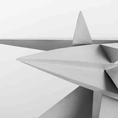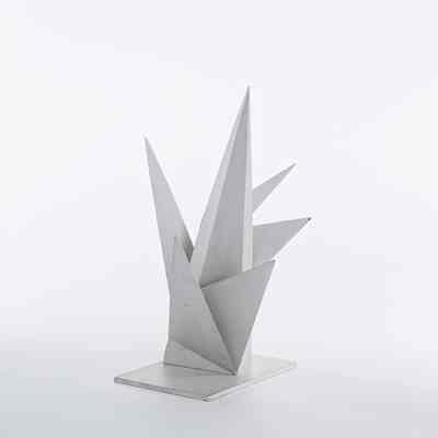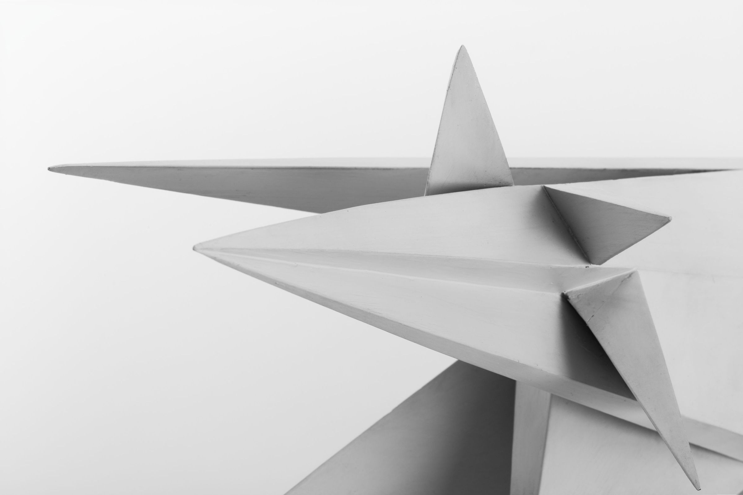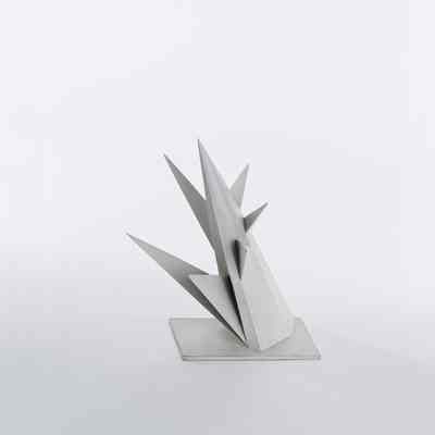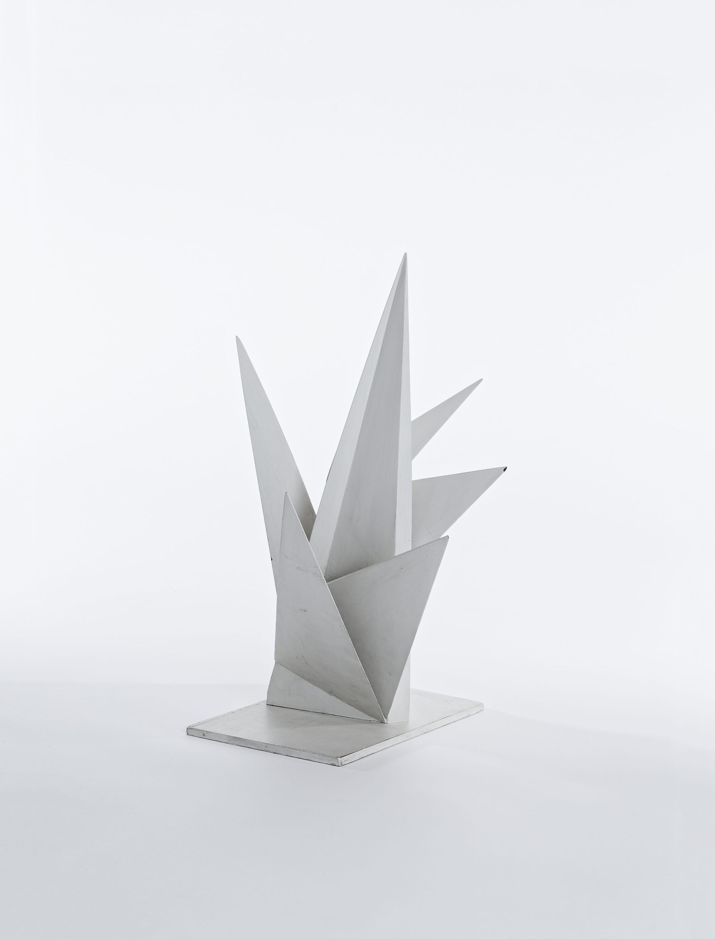 Submitted as an entry for the U.S. Treasury Department’s war memorial competition (the winning entry was a representational piece depicting a farmer laying down the reins and picking up a rifle). Offense knows the direction of attack, defense requires flexibility. Defense was used again in 1964 as a model for WE’s entry in Philadelphia’s Kennedy Plaza fountain competition, envisioning a 60-foot-high replication in stainless steel, centered in a circular basin of radiating ripples.