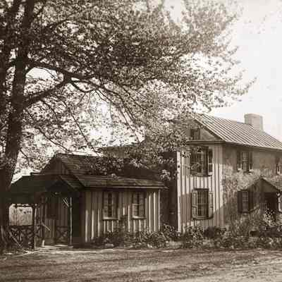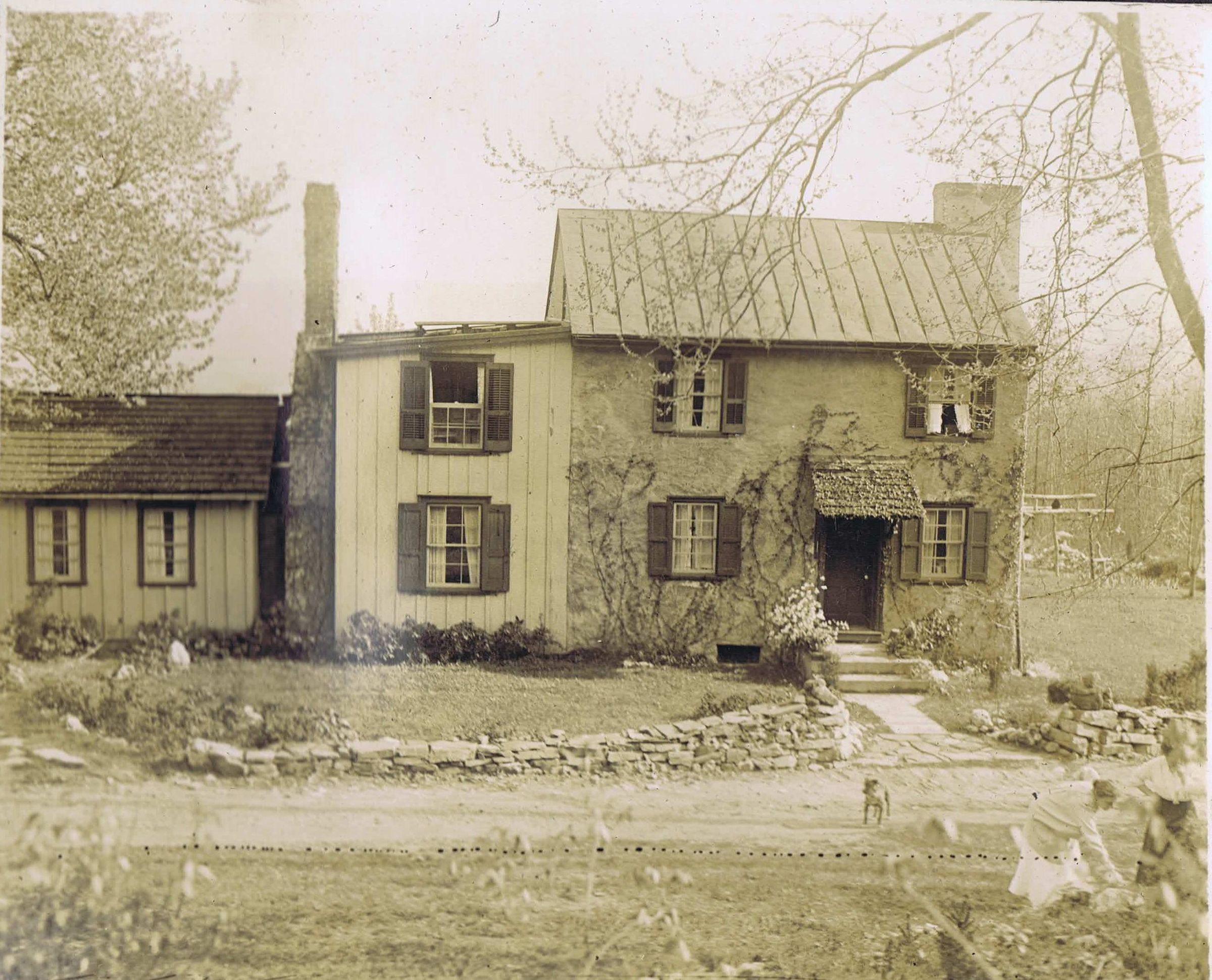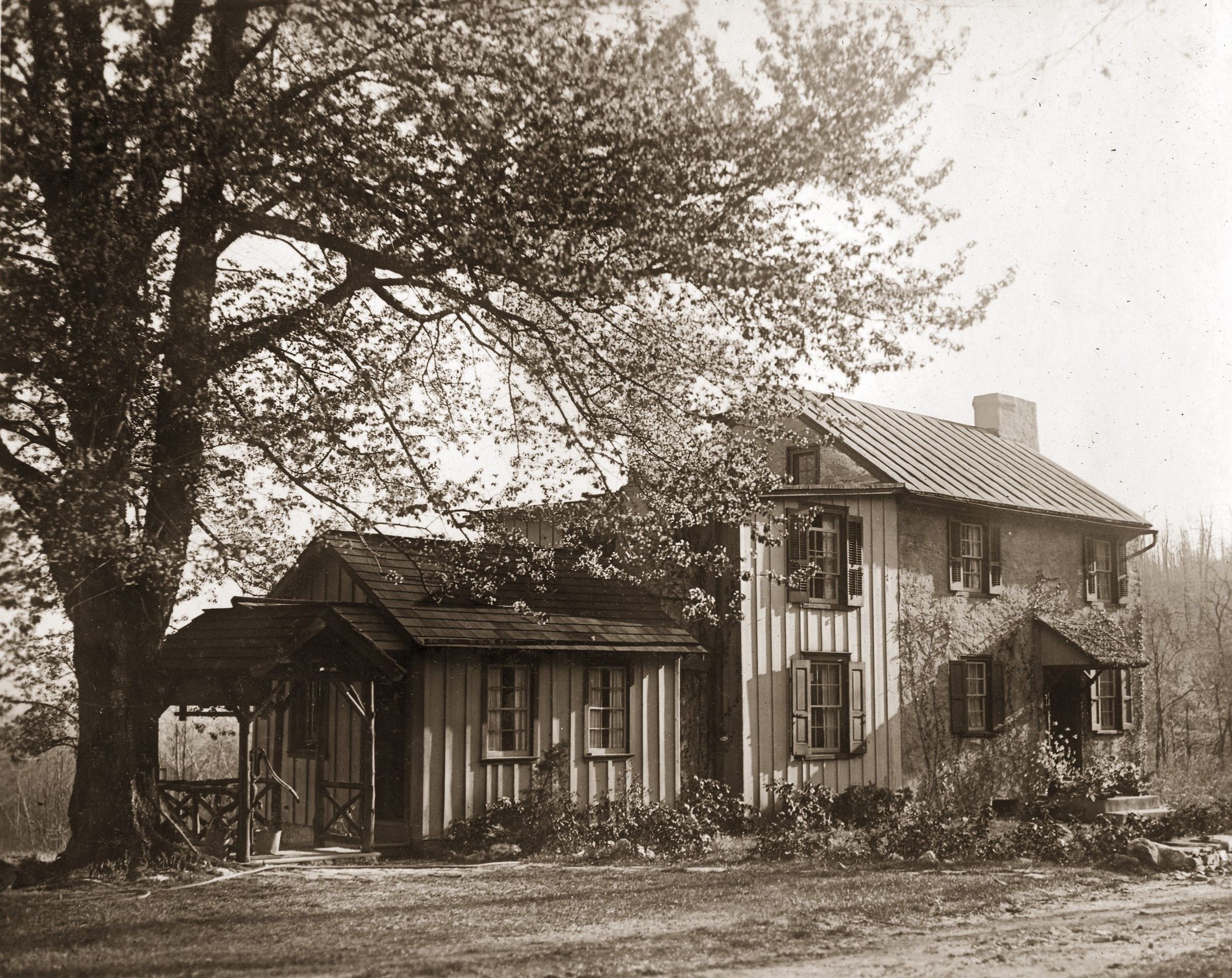 Sunekrest (pronounced sunny-krest), an 1839 farmhouse, was the first home for the Esherick family after leaving Philadelphia for Valley Forge Mountain and is a recent addition to the Museum’s collection of architectural sites. Even though Esherick was not yet working in wood in 1913, he is said to have selected the gabled stone house because of a magnificent cherry tree housed on the grounds. Work on the house introduced Esherick to tradesmen in the area who would become his long term collaborators, including the stone mason Albert Kulp who built a new chimney for Sunekrest. Esherick’s painting studio was set up on the second floor, although he took a collapsible easel and paint into the surrounding fields to capture the landscape and farmers at work. Esherick’s wife Letty created substantial gardens on the grounds so that the couple might be as self-sufficient as possible, and later taught rhythmic dancing and had plans to house a progressive school in the building. Sunekrest, with its rising sun logo, became a foundational site for the early awakening of the Eshericks’ unconventional, creative philosophies. Sunekrest and views on the property also served as the subject matter for many of Esherick’s early prints.