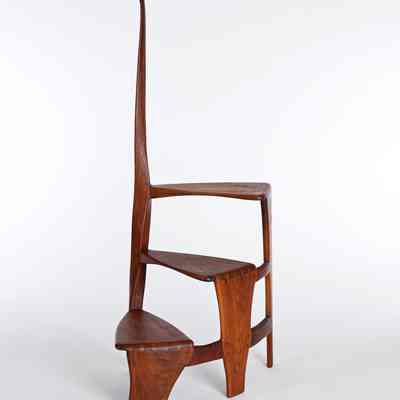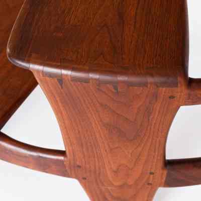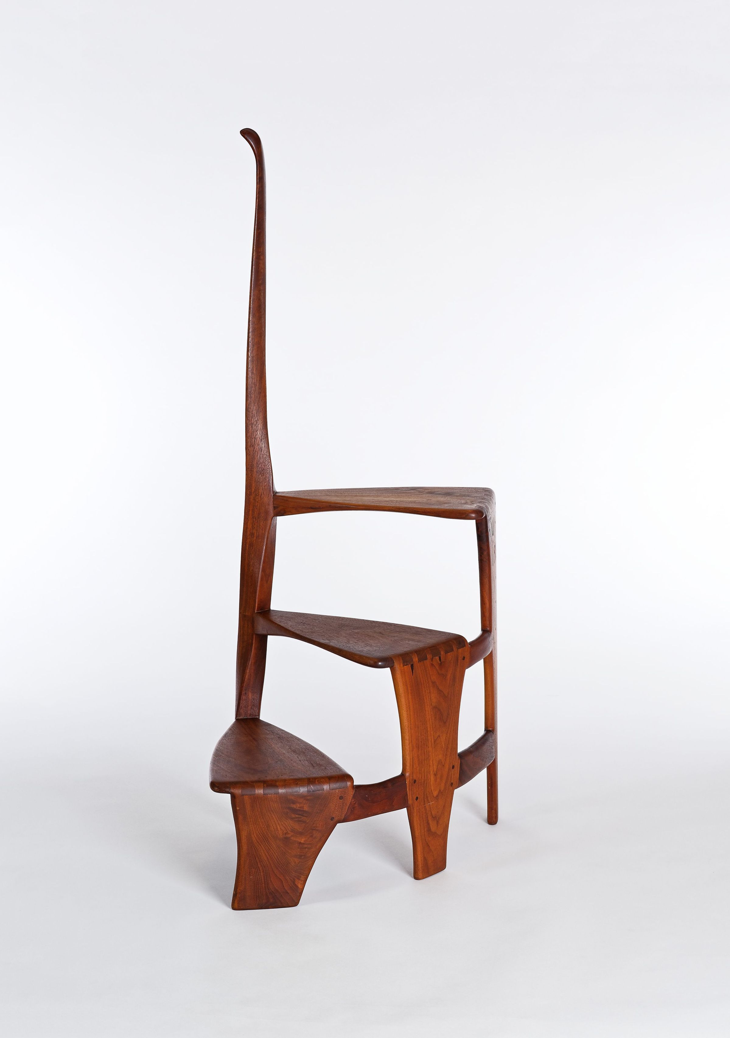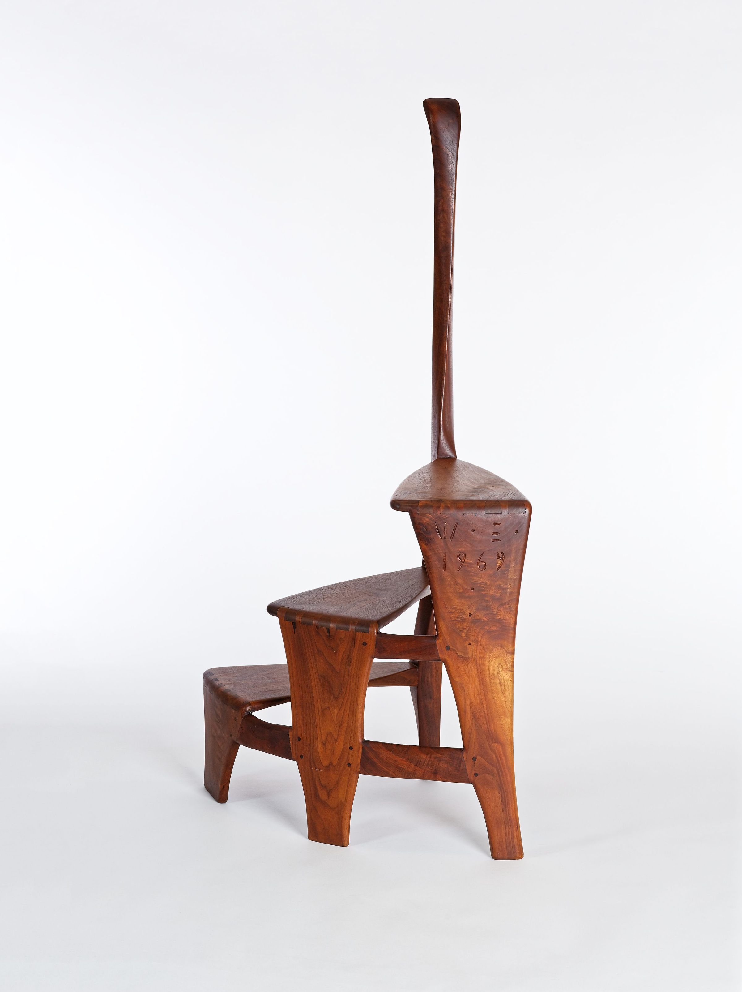 Although it dates from the very end of Esherick’s life, his Library Ladder is one of the artist’s best known — and most celebrated — designs. It was first produced in 1966 after a client asked for a library stool in walnut that was more elegant and graceful than the clunky standard. Esherick was so pleased with the result that he quickly made more in both walnut and cherry for right and left handed users. Scholars and collectors alike appreciated the design for what they saw as a novel and seamless melding of function with sculptural presence. However, the Library Ladder might be better considered a culmination of Esherick’s career-long interest in creating works where neither function or sculpture dominated; for example, the organic twisting spirals that initially appear in Esherick’s staircases of the 1930s make a reappearance in these works. These two Library Ladders showcase both walnut and cherry, and have slightly different curvatures; both made in 1969, the walnut example belonged to his longtime companion, the actress Miriam Phillips.