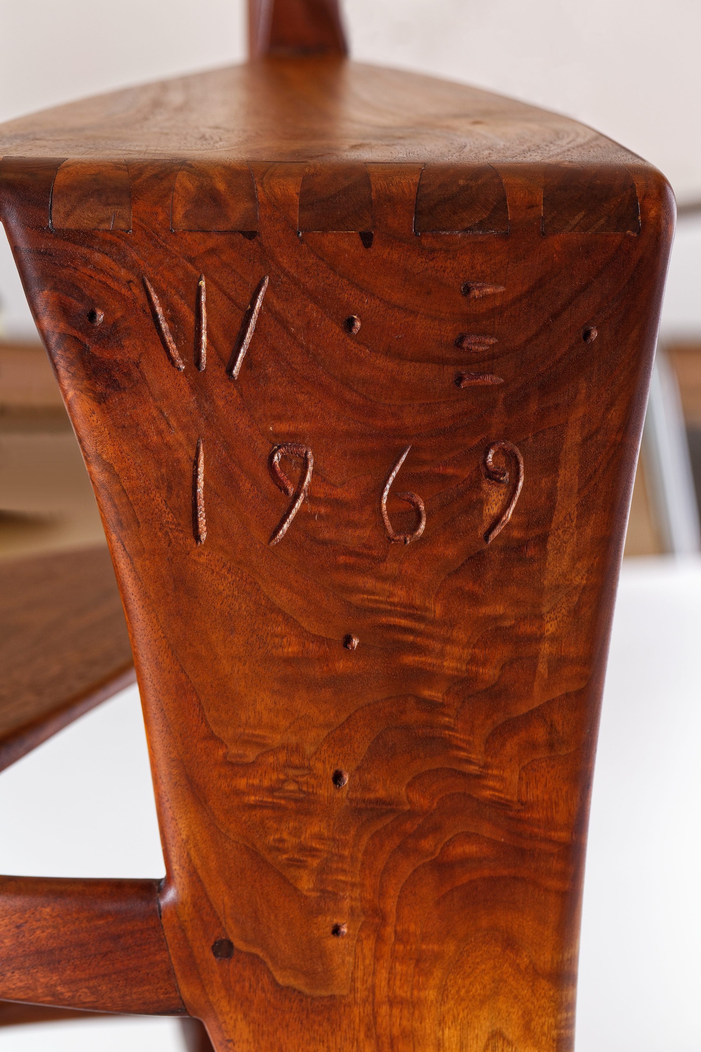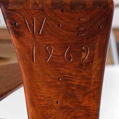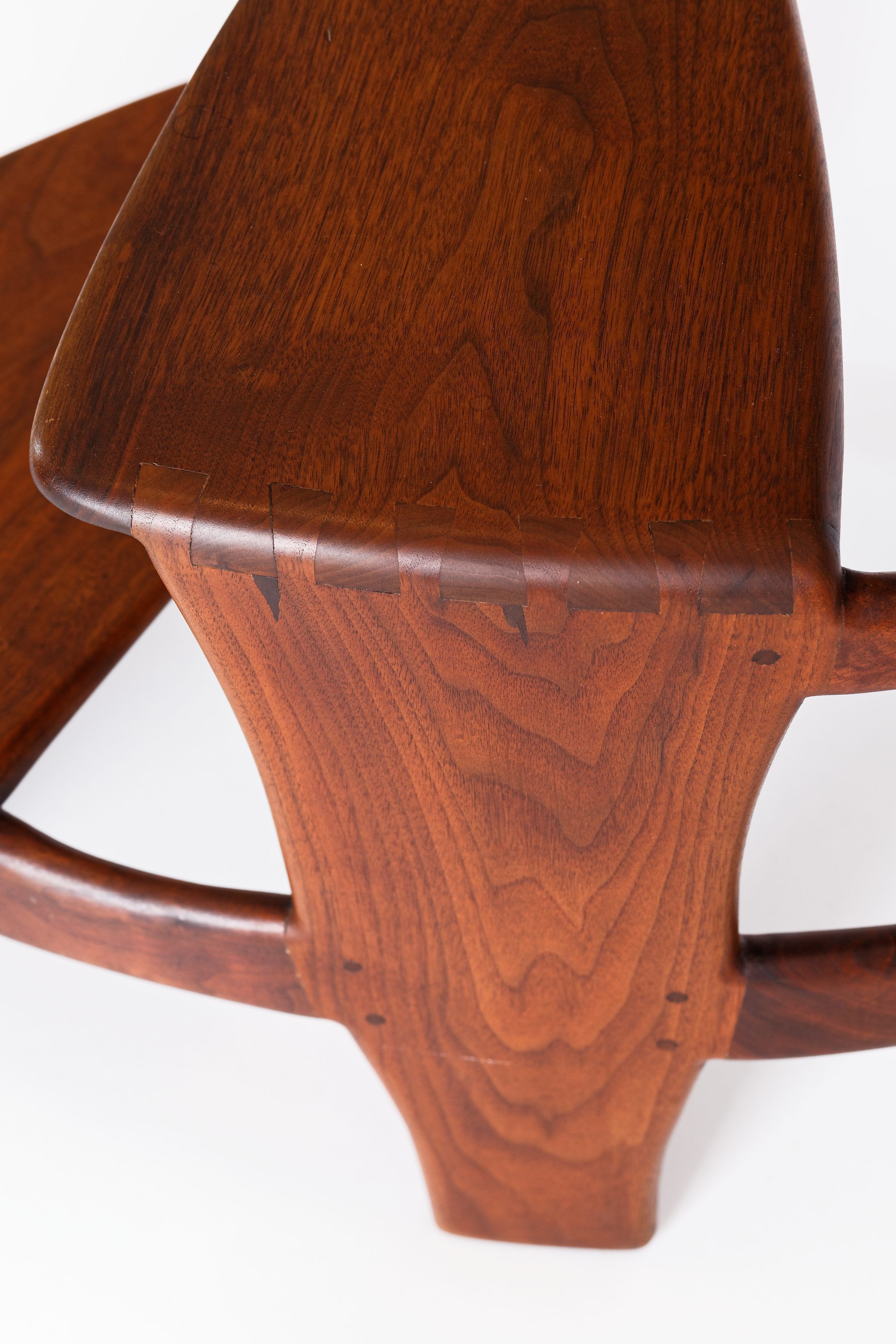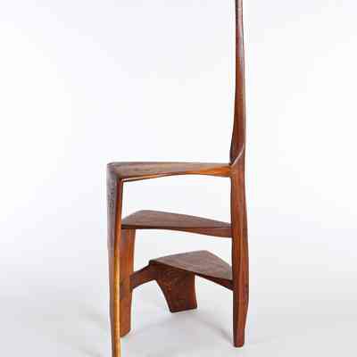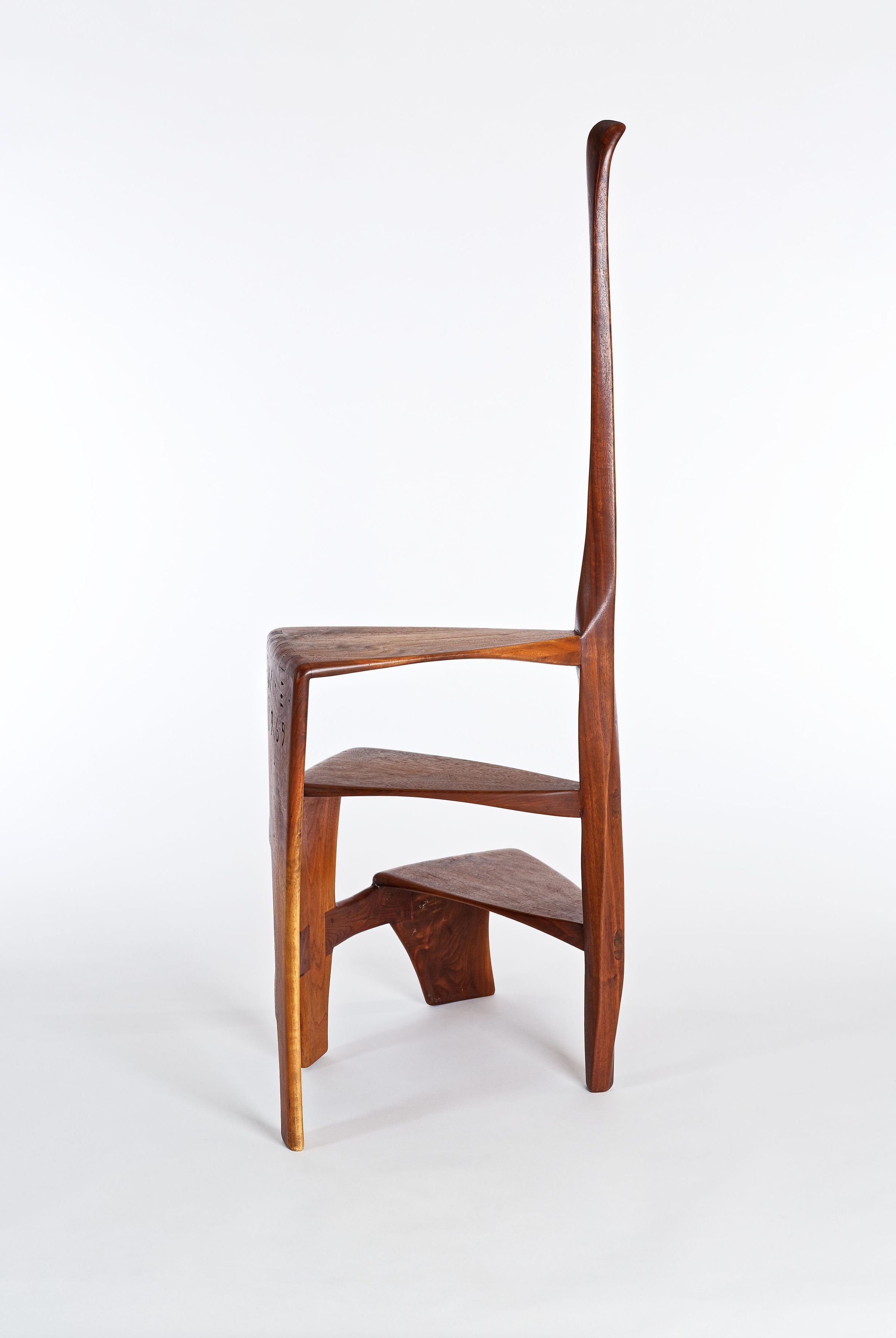 Although it dates from the very end of Esherick’s life, his Library Ladder is one of the artist’s best known — and most celebrated — designs. It was first produced in 1966 after a client asked for a library stool in walnut that was more elegant and graceful than the clunky standard. Esherick was so pleased with the result that he quickly made more in both walnut and cherry for right and left handed users. Scholars and collectors alike appreciated the design for what they saw as a novel and seamless melding of function with sculptural presence. However, the Library Ladder might be better considered a culmination of Esherick’s career-long interest in creating works where neither function or sculpture dominated; for example, the organic twisting spirals that initially appear in Esherick’s staircases of the 1930s make a reappearance in these works. These two Library Ladders showcase both walnut and cherry, and have slightly different curvatures; both made in 1969, the walnut example belonged to his longtime companion, the actress Miriam Phillips.