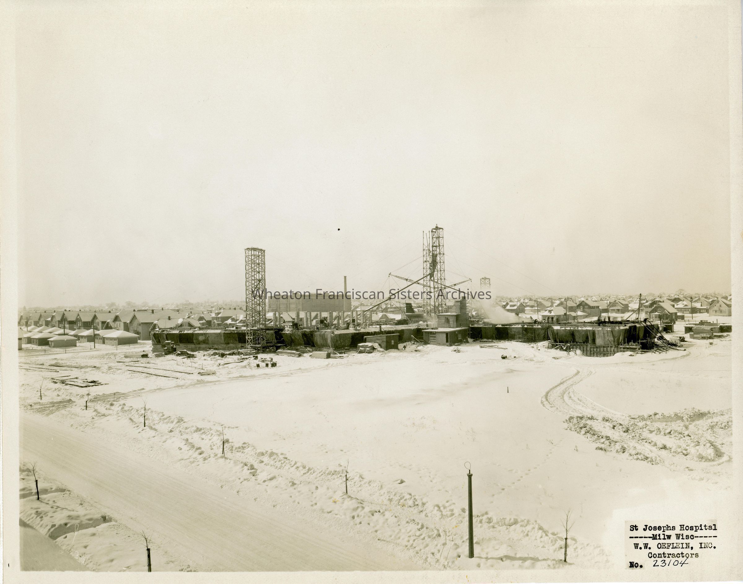 Construction of St. Joseph's Hospital located at 5000 West Chambers Street in Milwaukee, Wisconsin. The contractor is listed as W. W. Oeflein Inc.