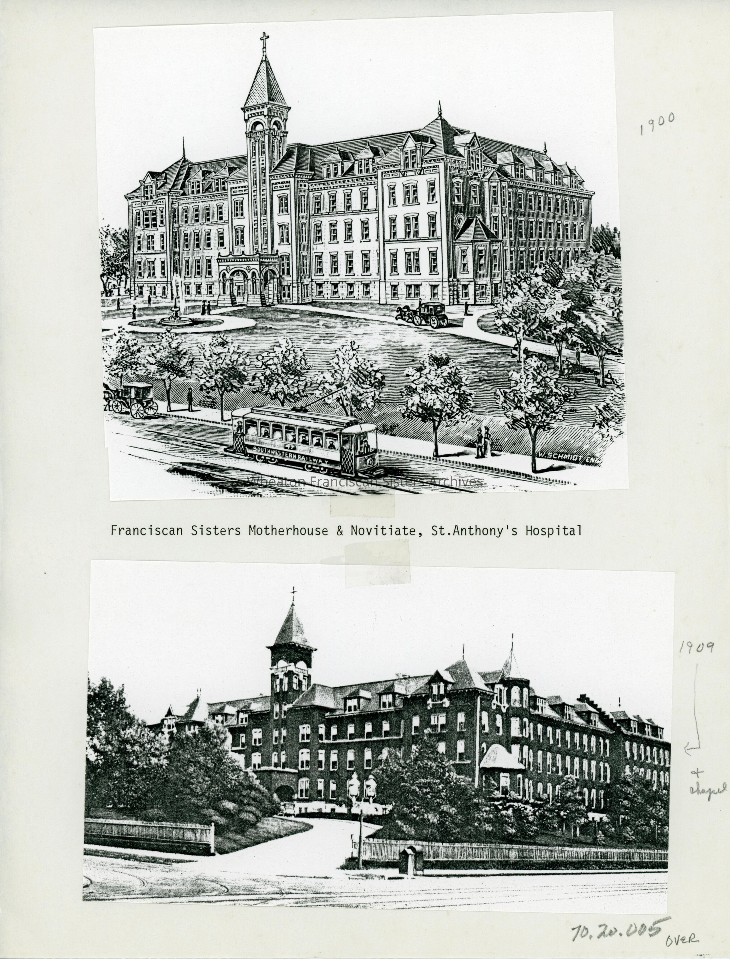 St. Anthony's Hospital, Novitiate and Motherhouse located at 3520 Chippewa Street in St. Louis, Missouri. The drawing depicts the structure as it appeared around 1900 while the bottom photo was taken around 1909.