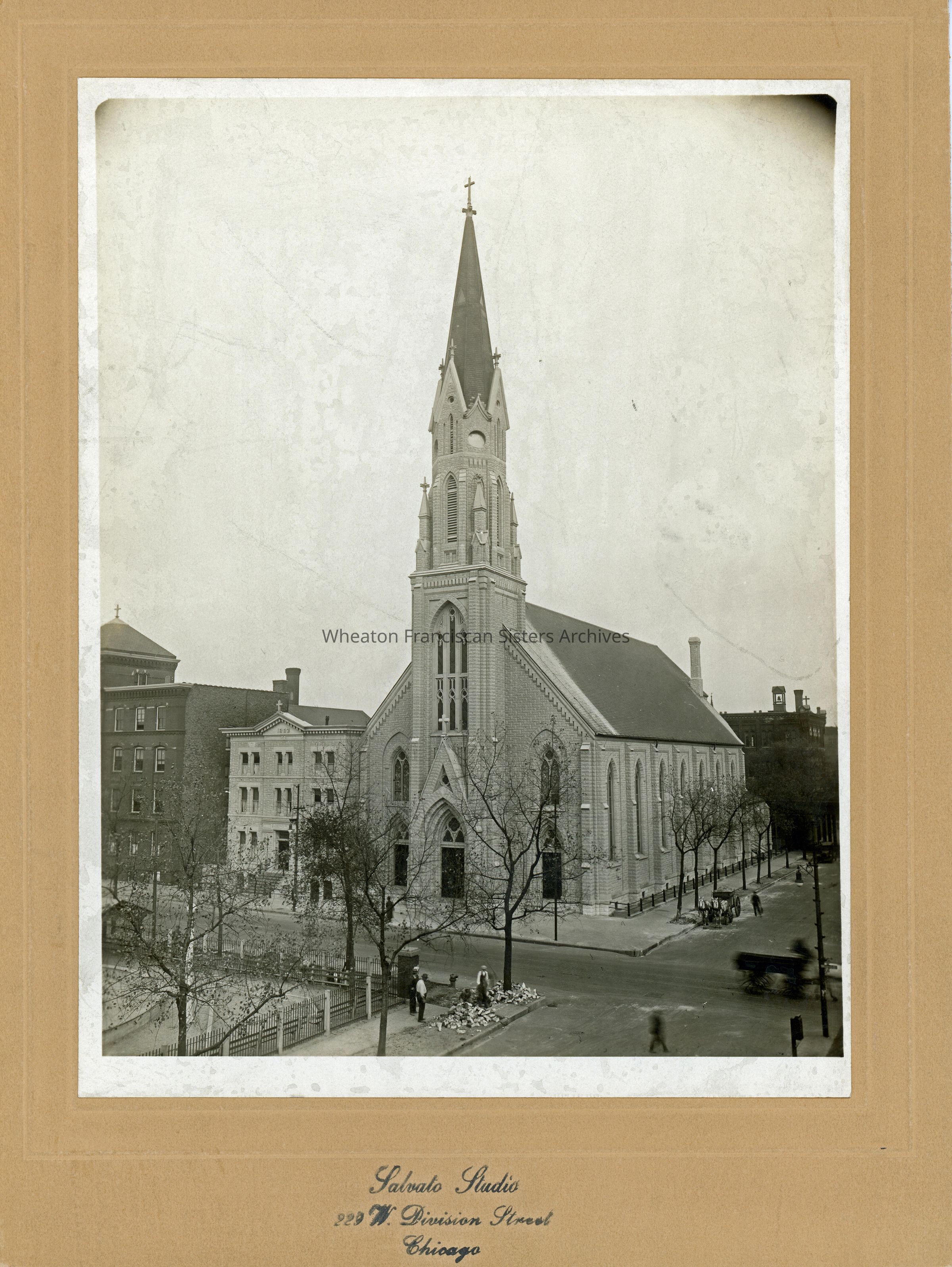 St. Joseph's Church located at 1107 North Orleans Street in Chicago, Illinois. Completed in 1878, the the structure has undergone a number of renovations over the last century. St. Joseph's Priory and the House of Providence are on the left.