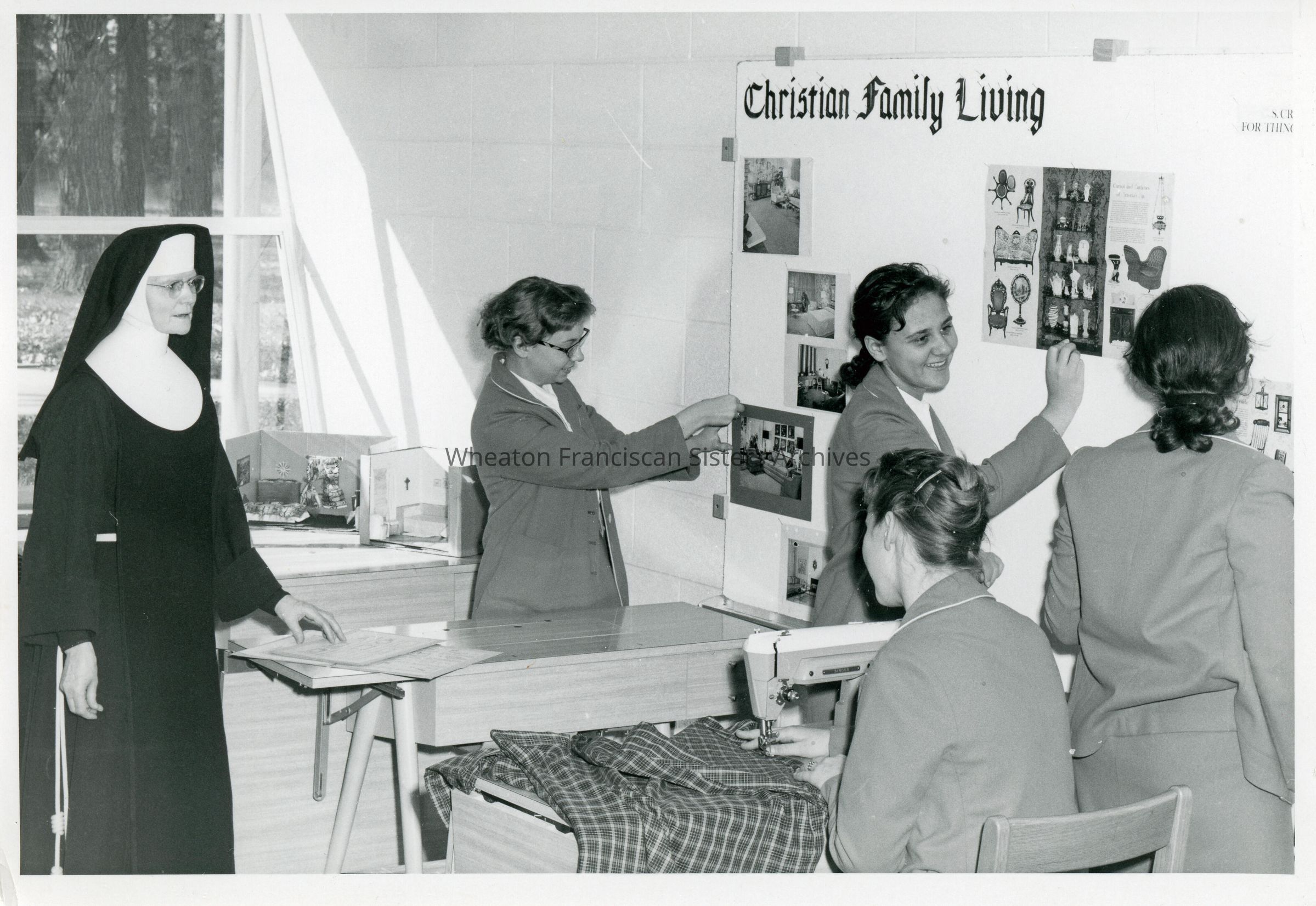 St. Francis High School located at 2130 West Roosevelt Road in Wheaton, Illinois. This image features Sister Hildegard (Lucille) Burgener with students.