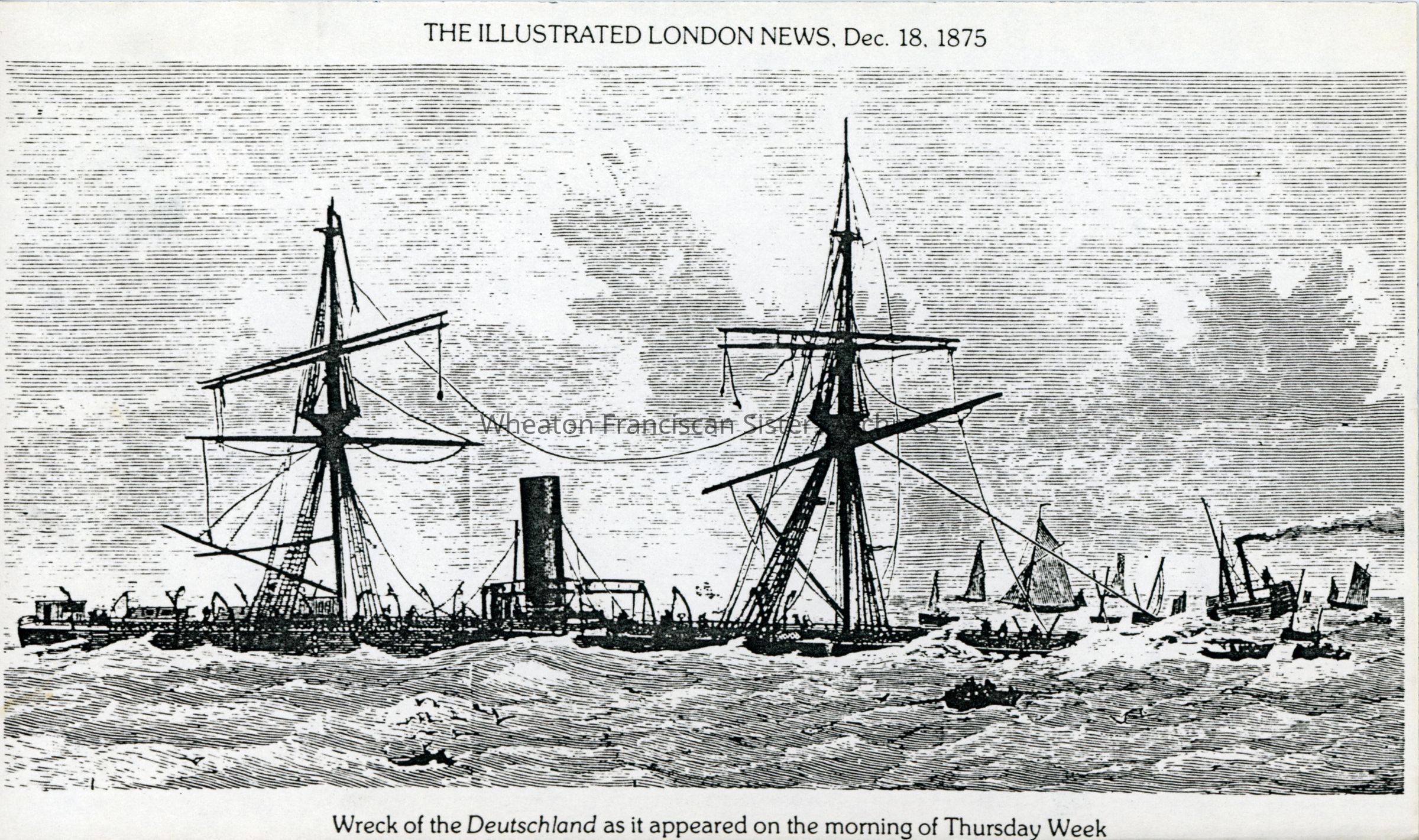 Plate from the Illustrated London News. It shows the S.S. Deutschland as it appeared on the morning of December 7th, 1875. Five Franciscan Sisters perished in the wreck, however the body of Sister Henrica (Catherine) Fassbender was never recovered. The four others who lost their lives are Sister Barbara (Thekla) Hültenschmidt, Sister Brigitta (Elisabeth) Damhorst, Sister Norberta (Johanna) Reinkober and Sister Aurea (Josepha) Badziura. The women were traveling from the motherhouse in Salzkotten, Germany to St. Louis to lead the new American mission.Context