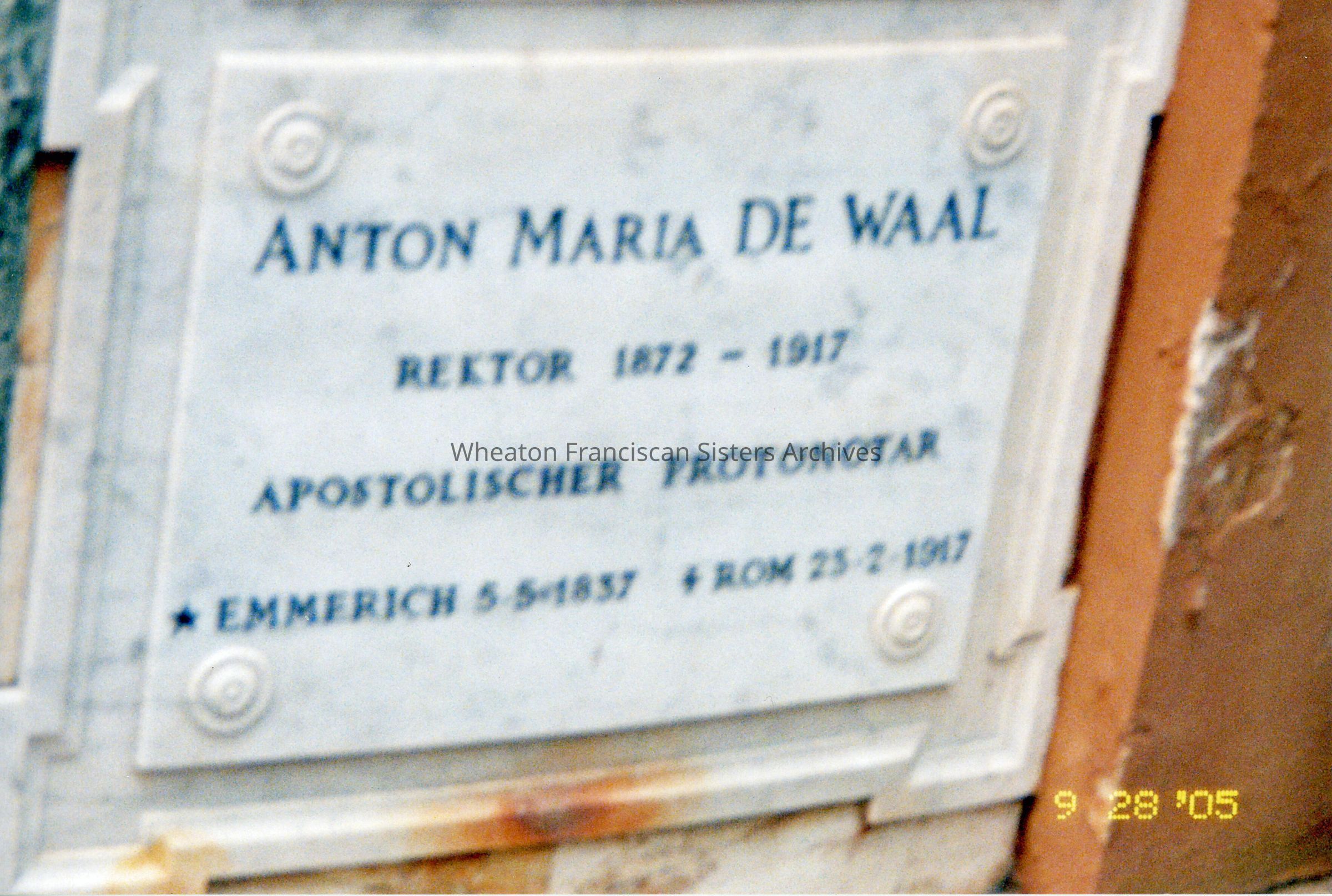 Memorial Plaque for Monsignor Anton Maria de Waal located at Campo Santo Teutonico in Rome, Italy. The Monsignor established the Collegio Teutonico del Campo Santo in 1876 and developed a friendship with Mother Clara Pfaender. After her passing in 1882, Monsignor de Wall settled Mother Clara's affairs and preserved her personal papers for the future.Context