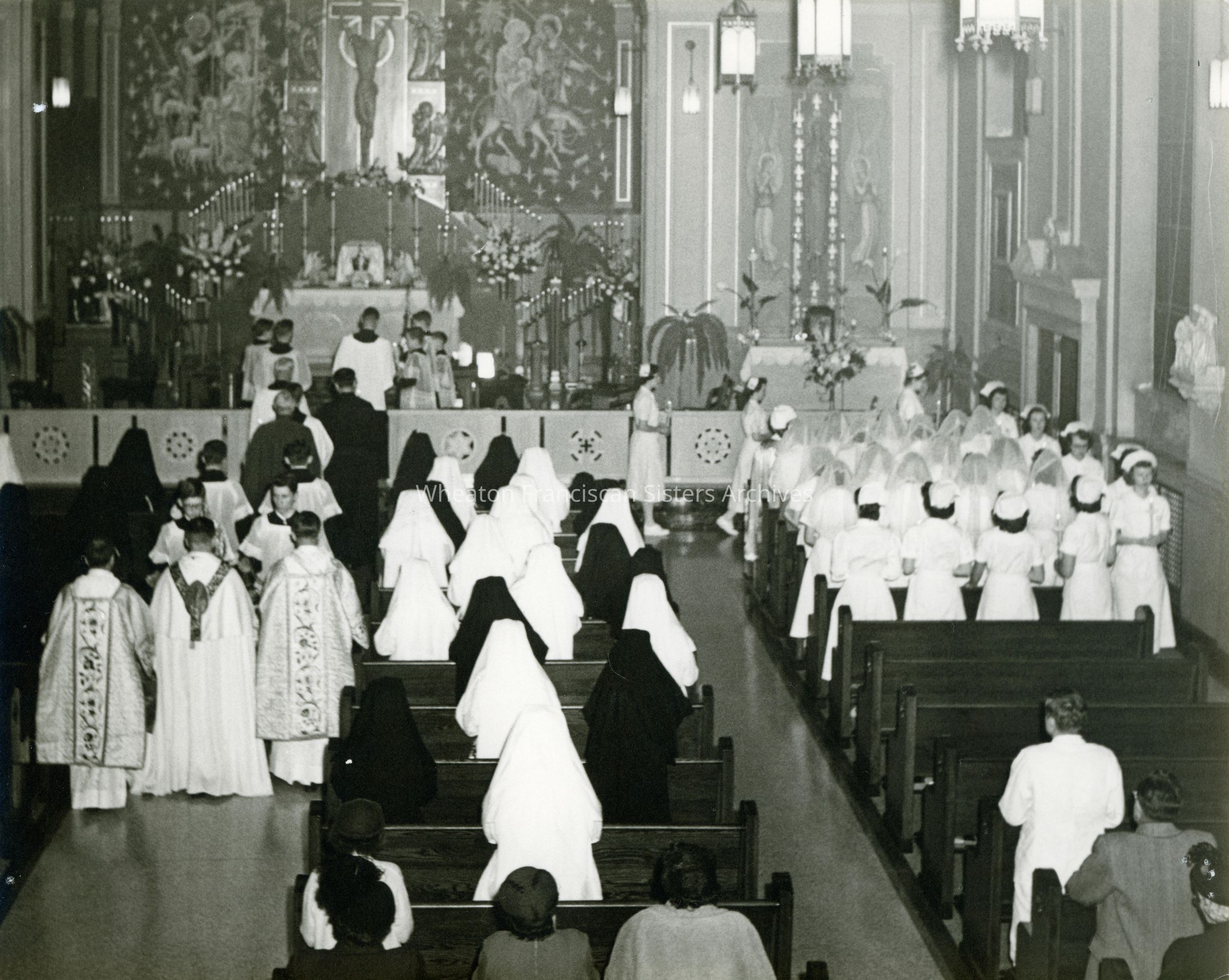 St. Joseph's Hospital chapel located at 5000 West Chambers Street in Milwaukee, Wisconsin. This image feature nurses and Sisters participating in the Forty Hours Devotion.