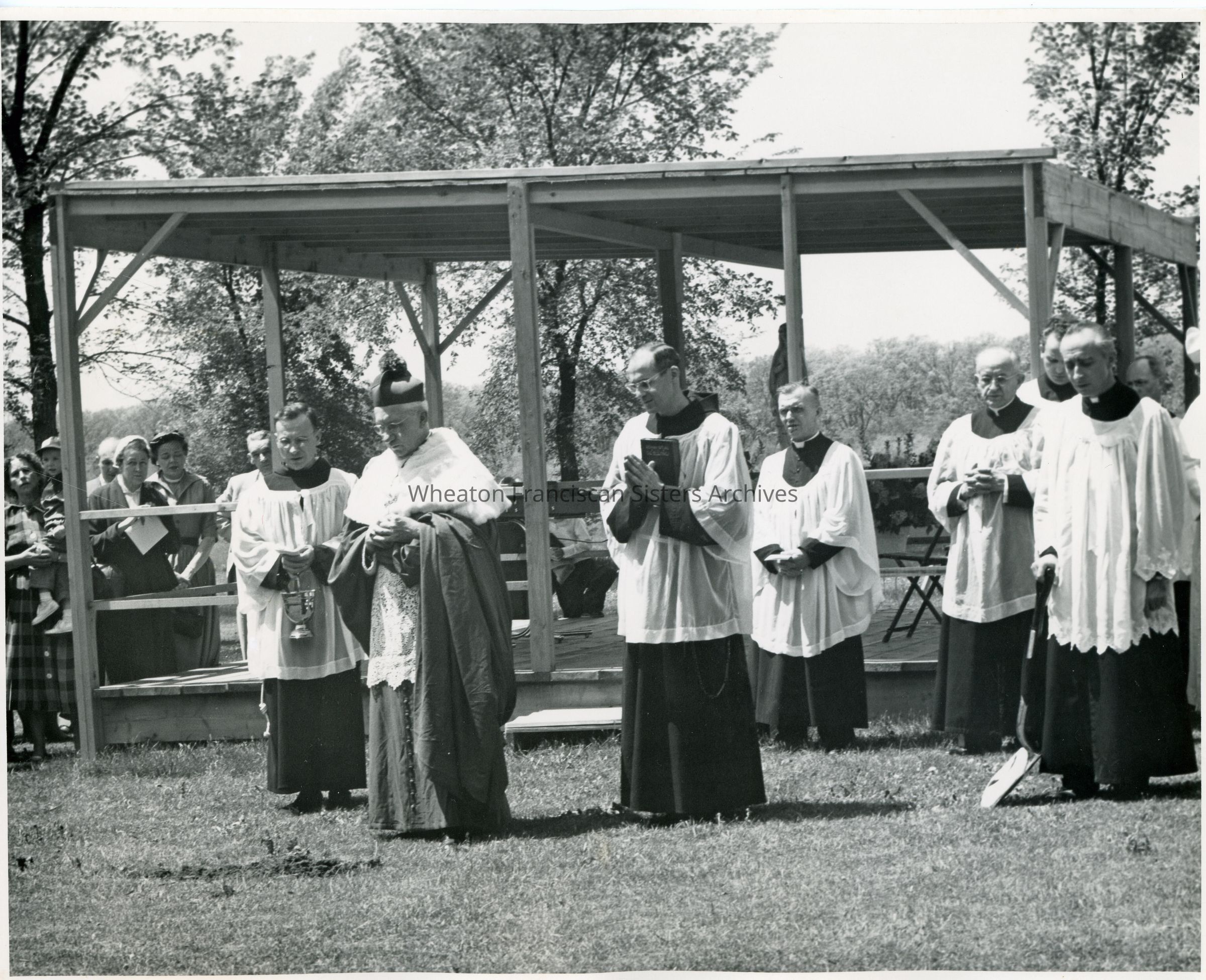 Groundbreaking ceremony for the Our Lady of Angels Motherhouse at 26W171 Roosevelt Road in Wheaton, Illinois. The shelter in the background held a large architectural model of the campus. Bishop Martin McNamara, Father Romeo Blanchette and Father Jasper are present.