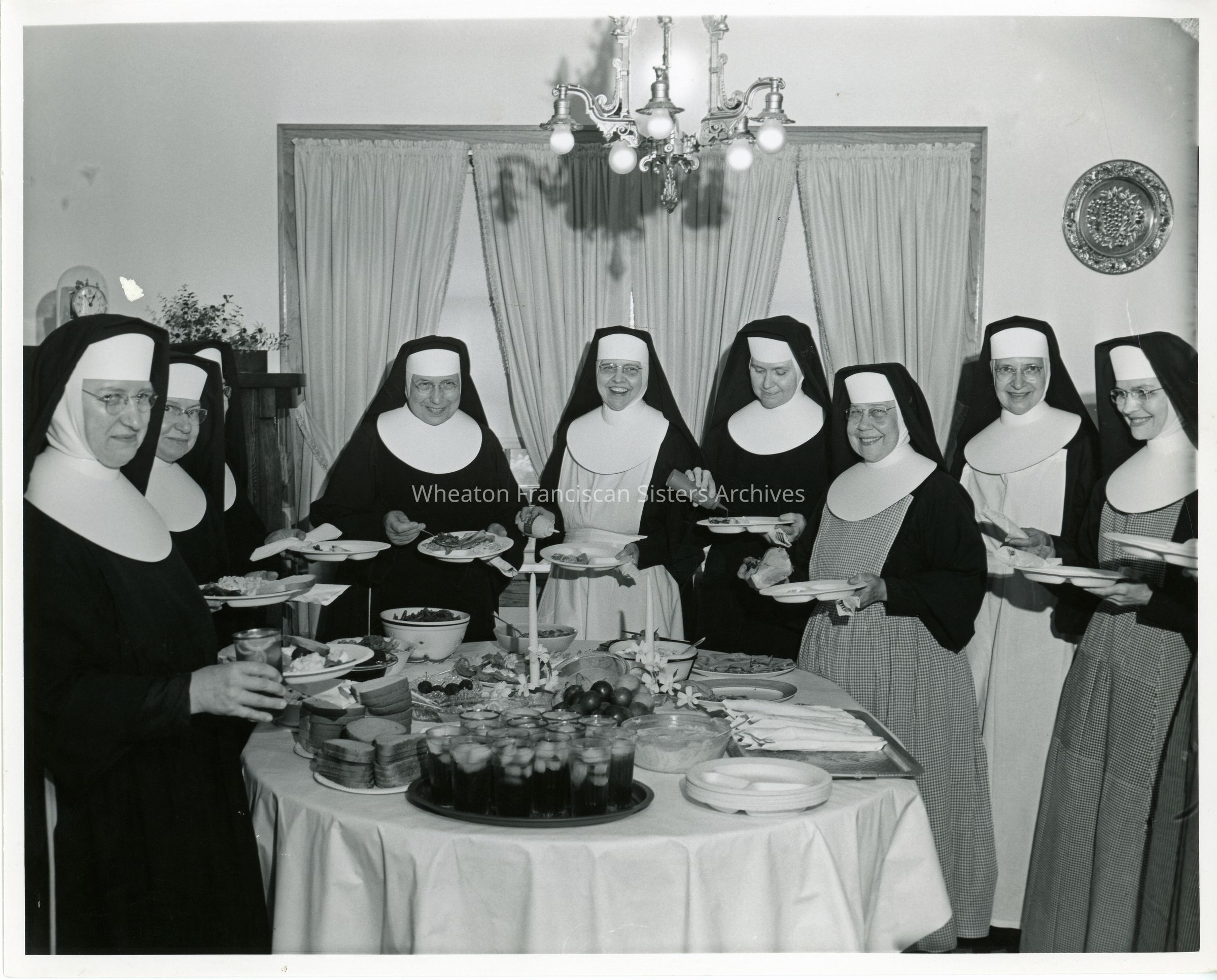 Sisters in Cape Girardeau, Missouri. This image features, from left to right, Sister Gertrude (Virgilia) Beikler, Sister Martha (Mildred) Onkels, Sister Monica, Sister Maria (Jona) Bathe, Sister Rosa (Valeria) Aubertin, Sister Marcellina (Cortona) Seyer, Sister Mary (Flora) Diebold, Sister Maria (Donata) Harney and Sister Alma (Giles) Teder. The women were attending a gathering at the Fuerth Home.