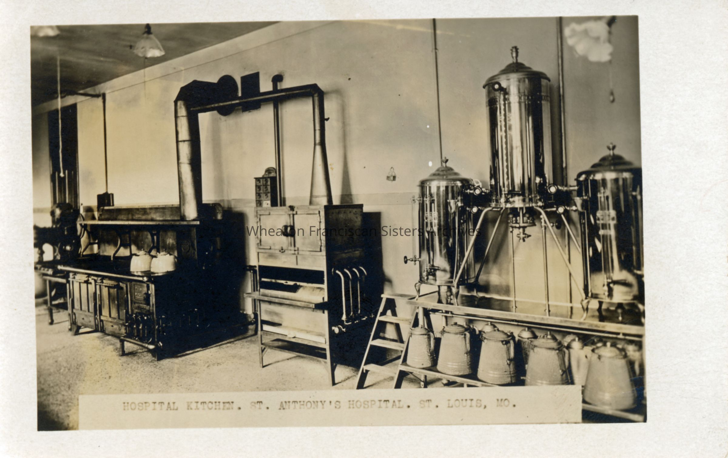 Postcard of the kitchen in St. Anthony’s Hospital located at 3520 Chippewa Street in St. Louis, Missouri.