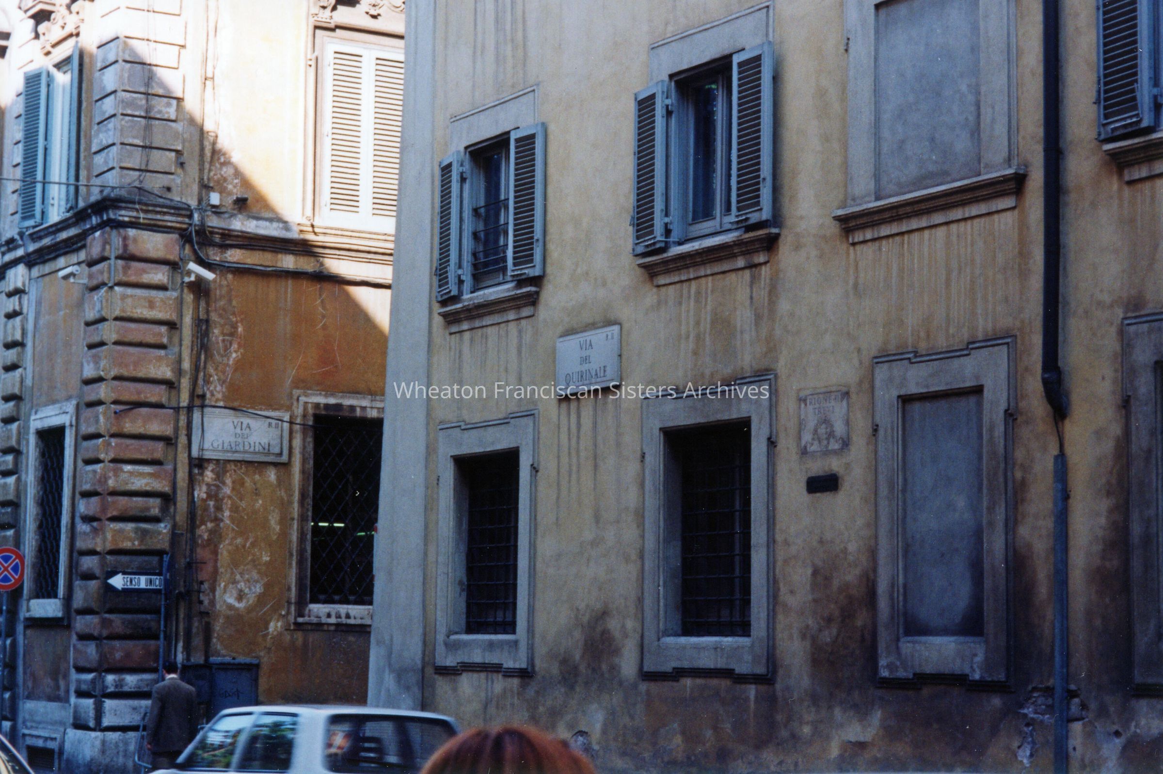 Sign near the entrance of 21 Via del Quirinale in Rome, Italy. Mother Clara Pfaender arrived in Rome in February of 1881, this location was her second residence.