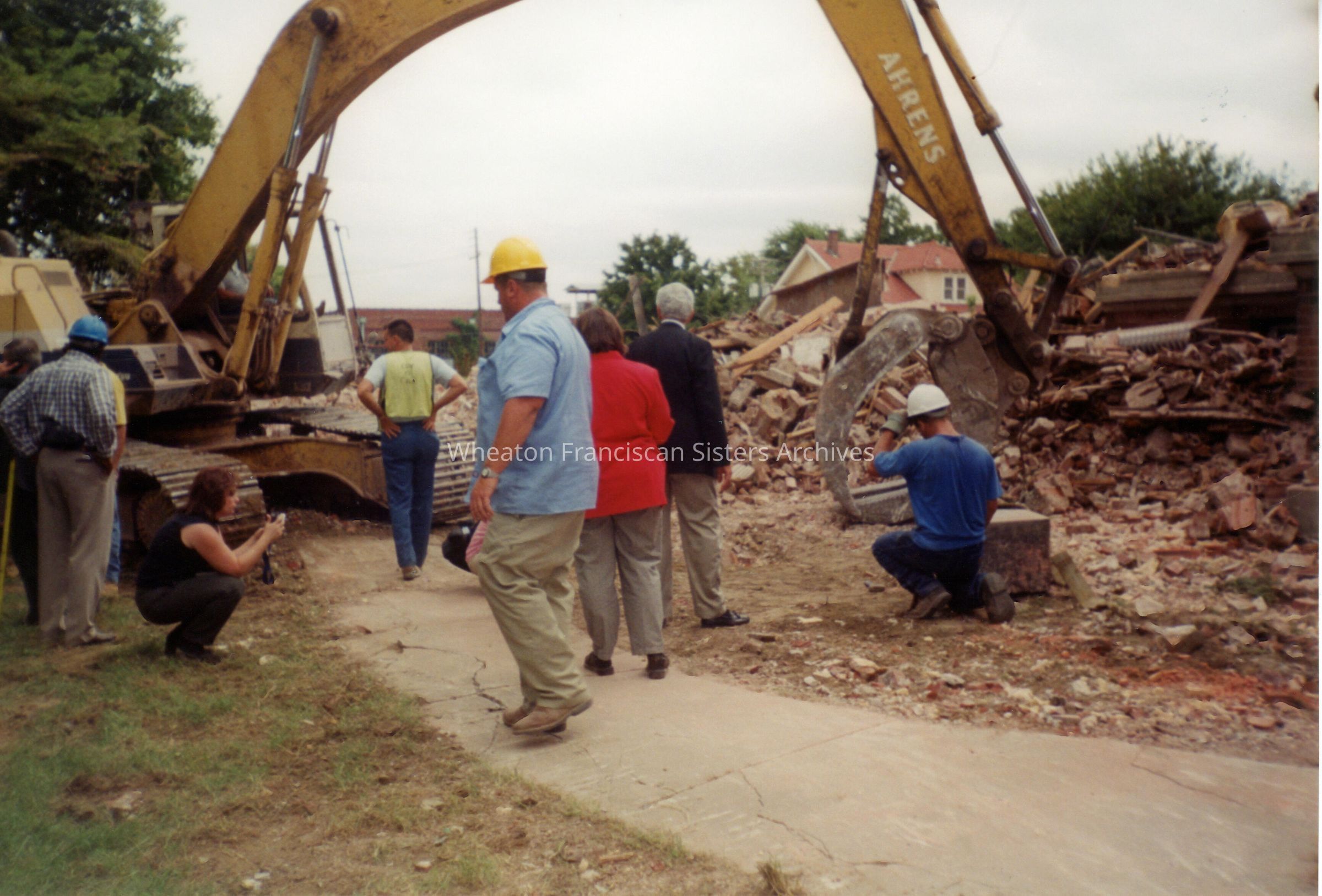 Demolition of St. Francis Hospital located at 825 Good Hope Street in Cape Girardeau, Missouri. This image was taken during the removal of the cornerstone time capsule. Opened in 1914, the hospital replaced an older structure located at Sprigg and Williams Streets. St. Francis remained here until 1976 and the building was demolished in 2000. Affordable housing now occupies the site.